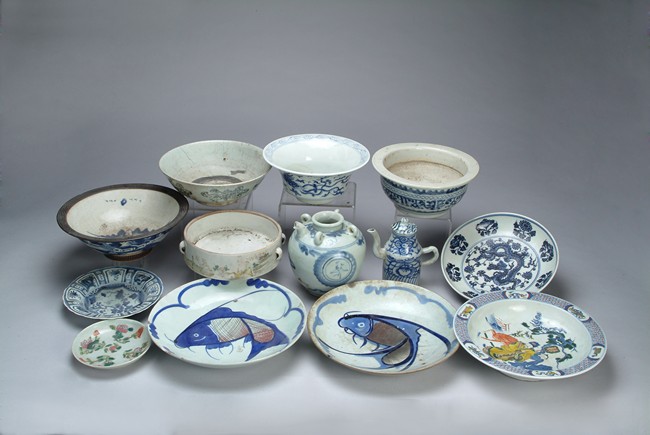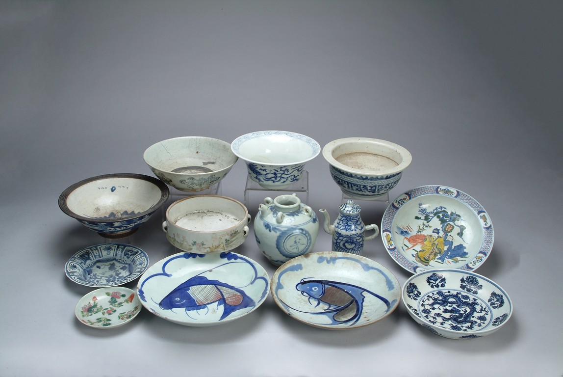 This set features thirteen different blue and white porcelain of various forms that includes bowl with scrolling flower design, dish with dragon design, jars, teapots, and other vessels. Some have visible damage.