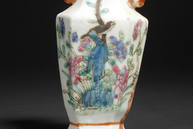 A group of five porcelain vases with different themes and designs.