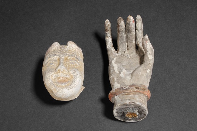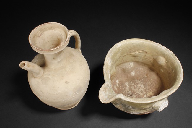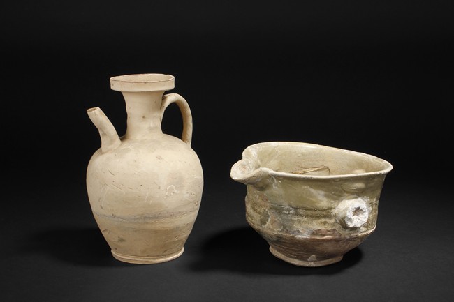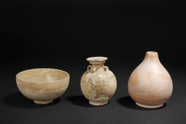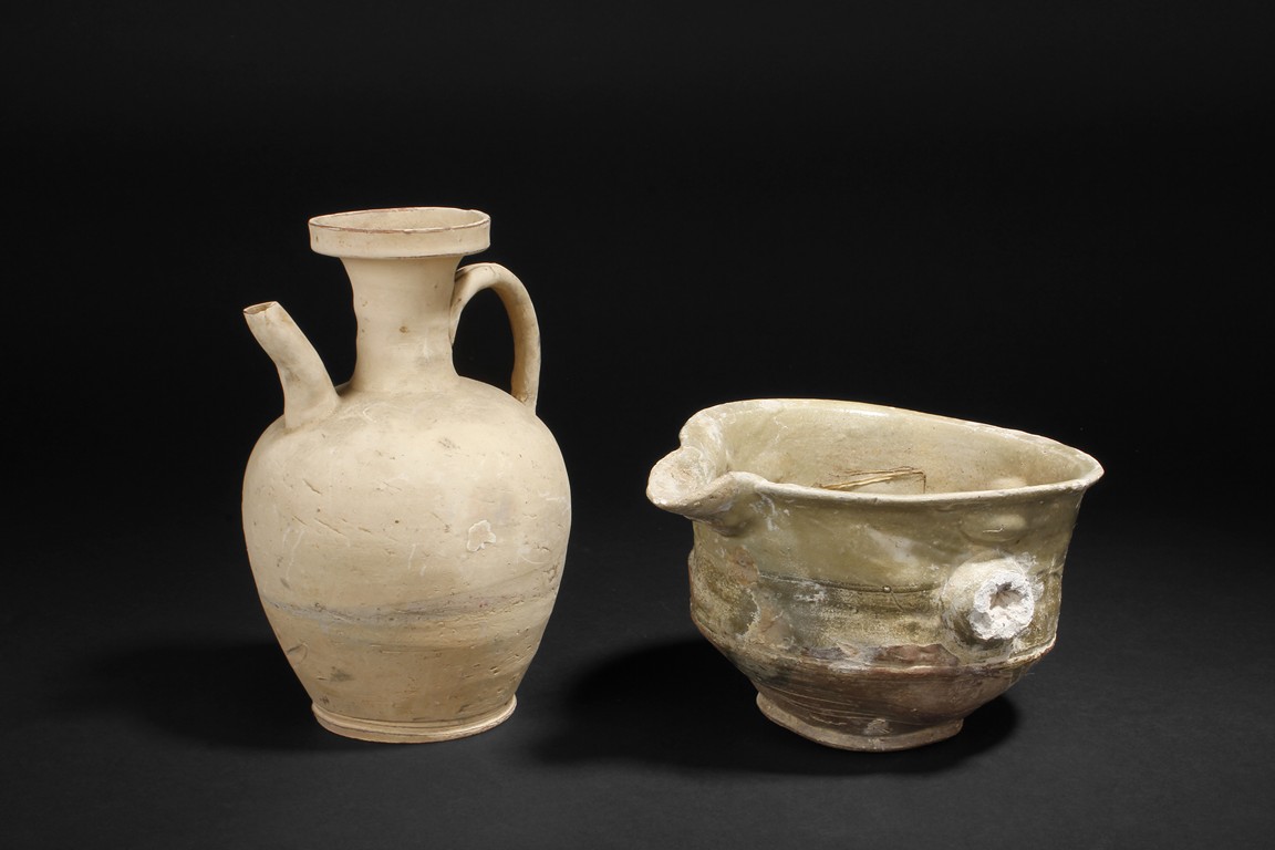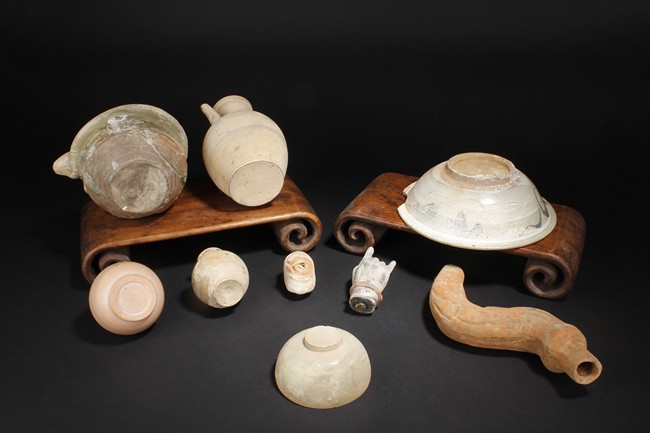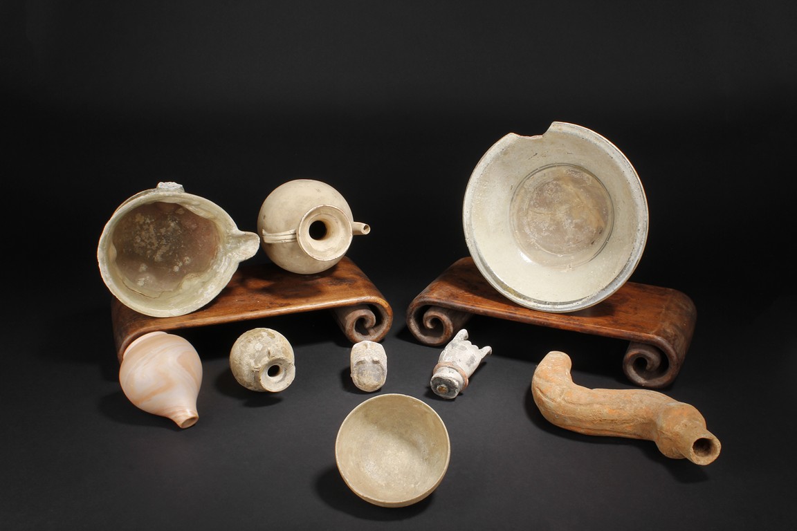 A group of nine pottery pieces, including bowls, ewer, vases, and carvings.