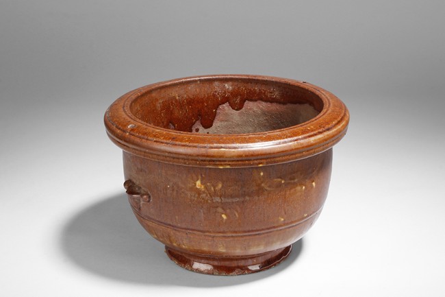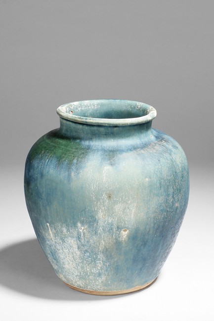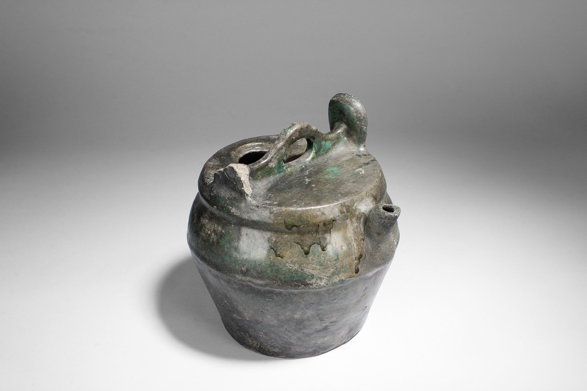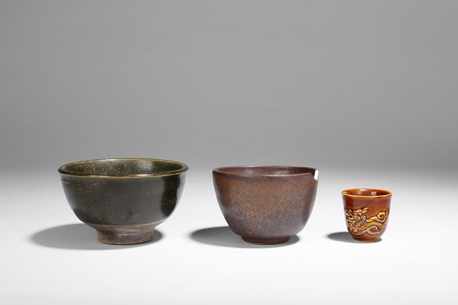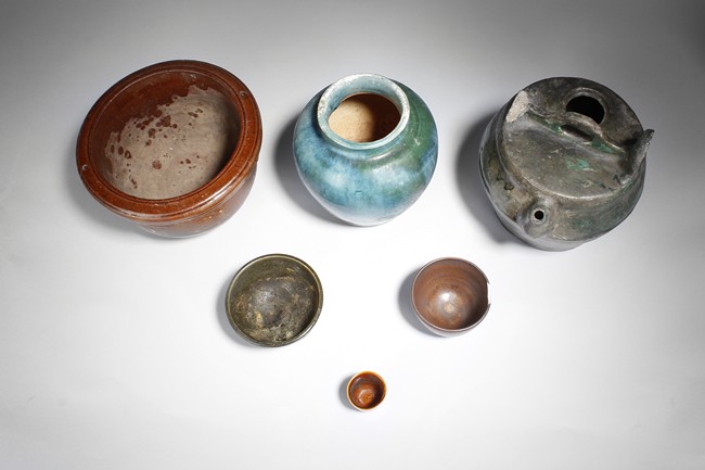 The group of pottery wares includes a jar, a vase, a wine ewer, two bowls, and a wine cup, in different color glaze.