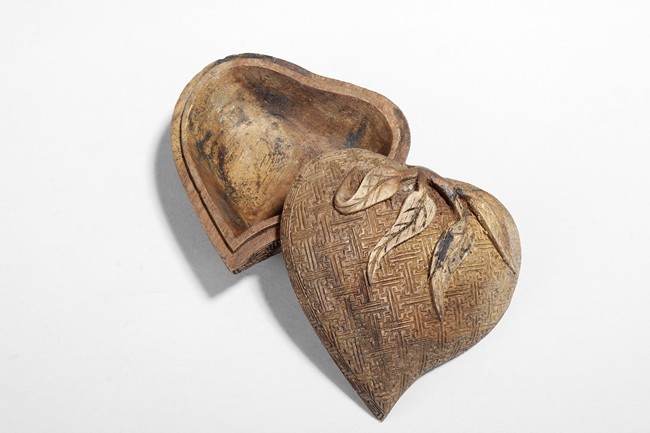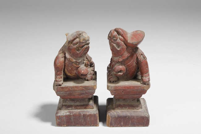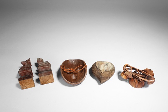 A group of small wood carvings, including a pair of lion statues, a wooden mask, a peach shaped cover box, and a lotus flower carving.