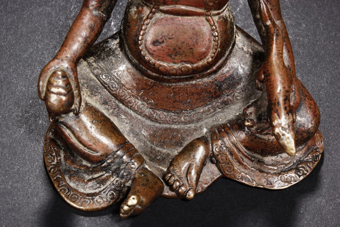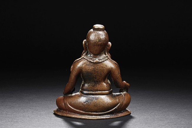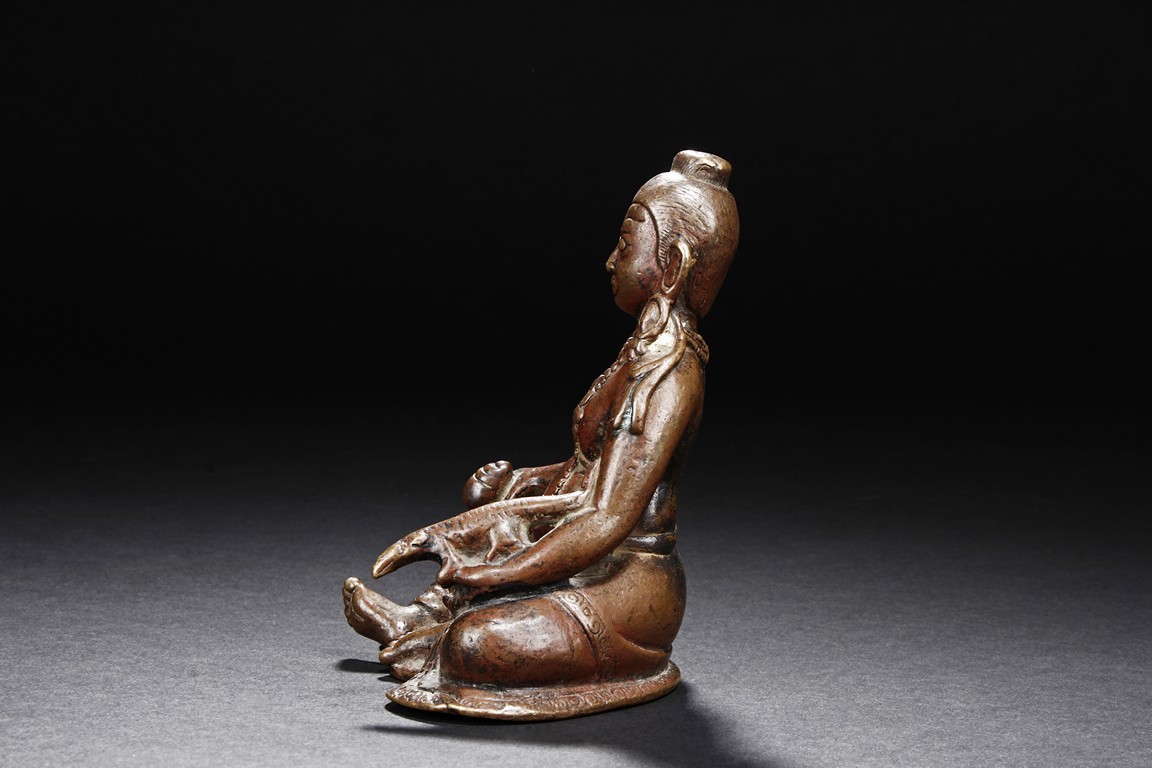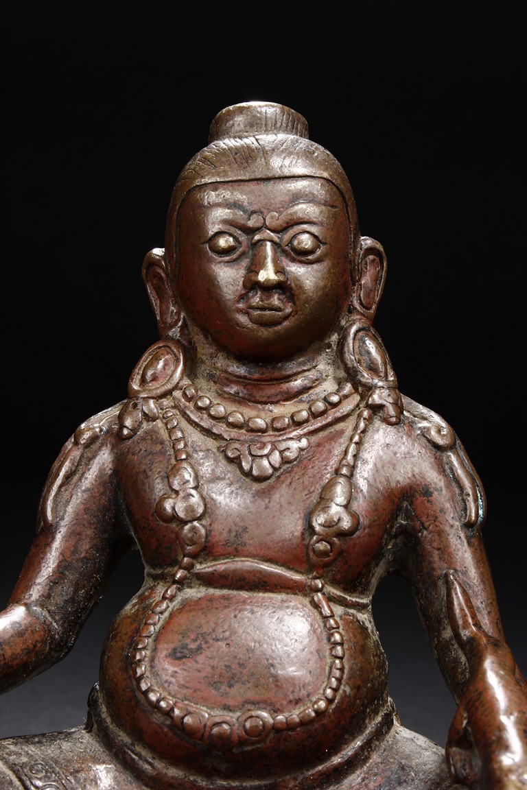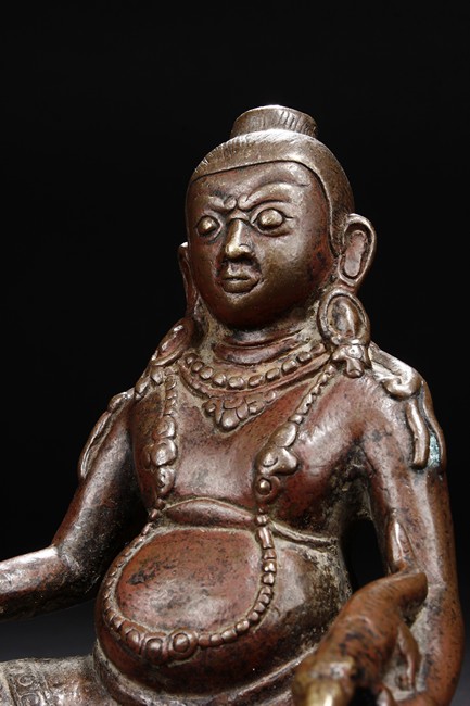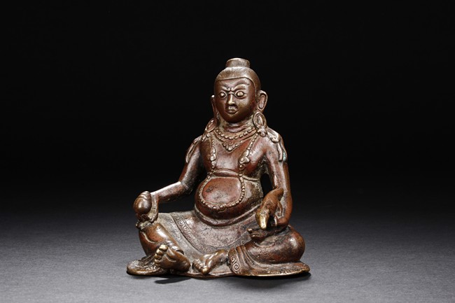 The figure is shown with a goose on the left hand and a conch on the right hand, wearing a dhoti and adorned with beaded necklace, the face with a fierce expression and hair pulled into a chignon. Qing Dynasty period.