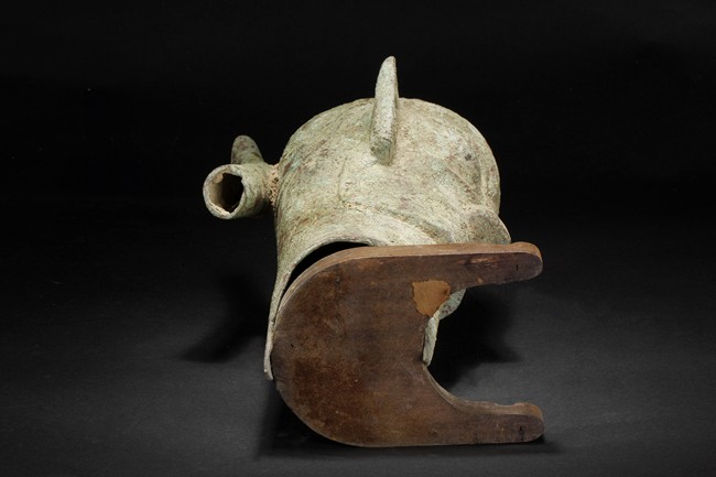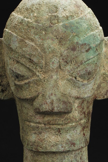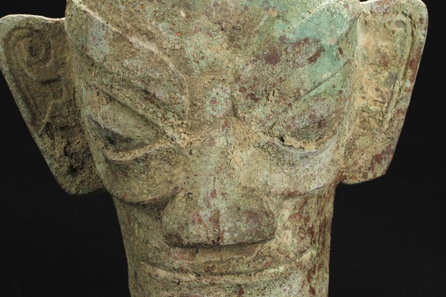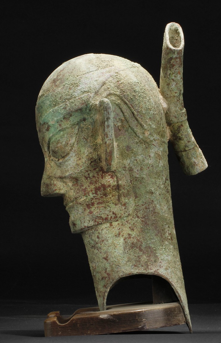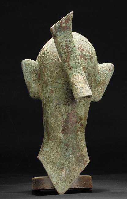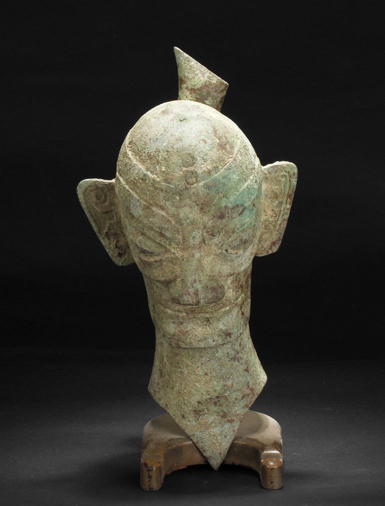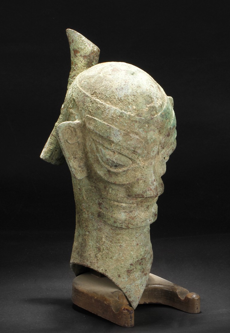 The head statue depicts a man with large ears, helmet over his eyes, and hair ornament on the back. Age related rust and oxidation.