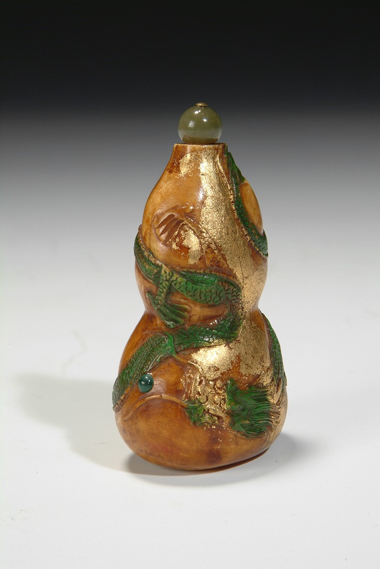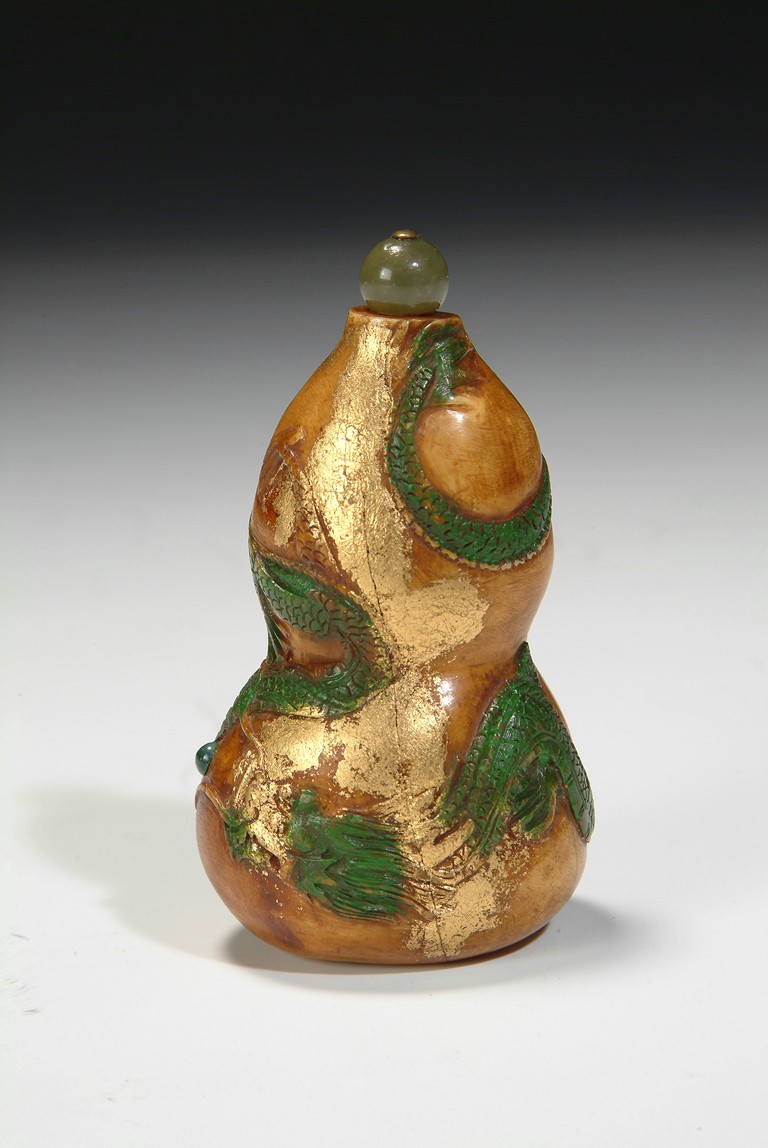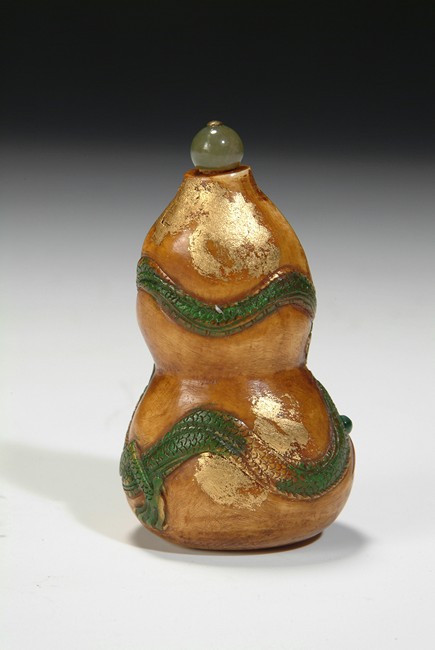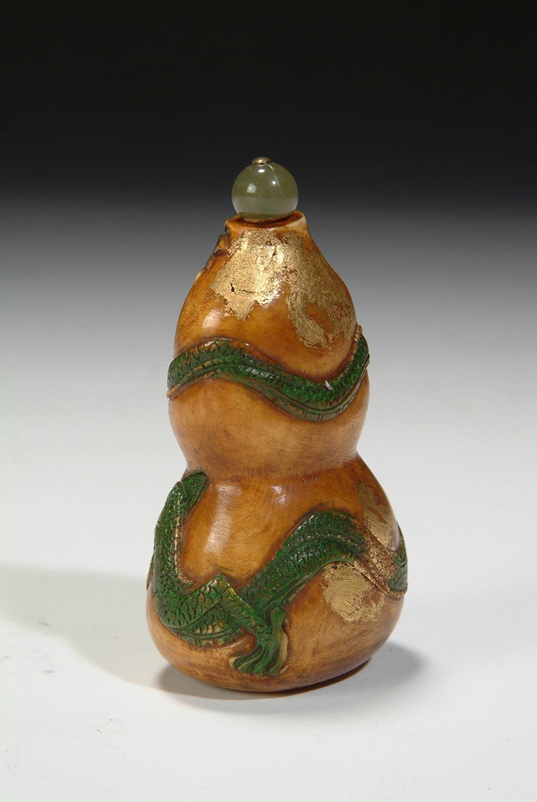A carved ivory snuff bottle with the design of the dragons among patches of gilt accent, topped with a jadeite stopper.