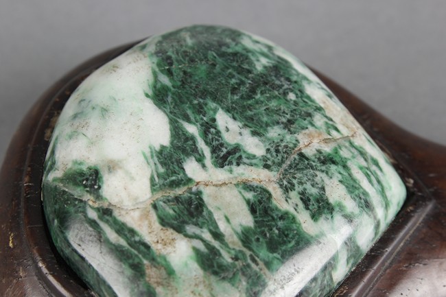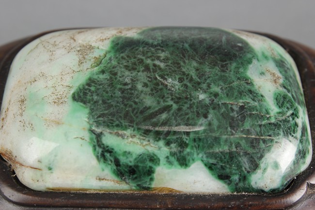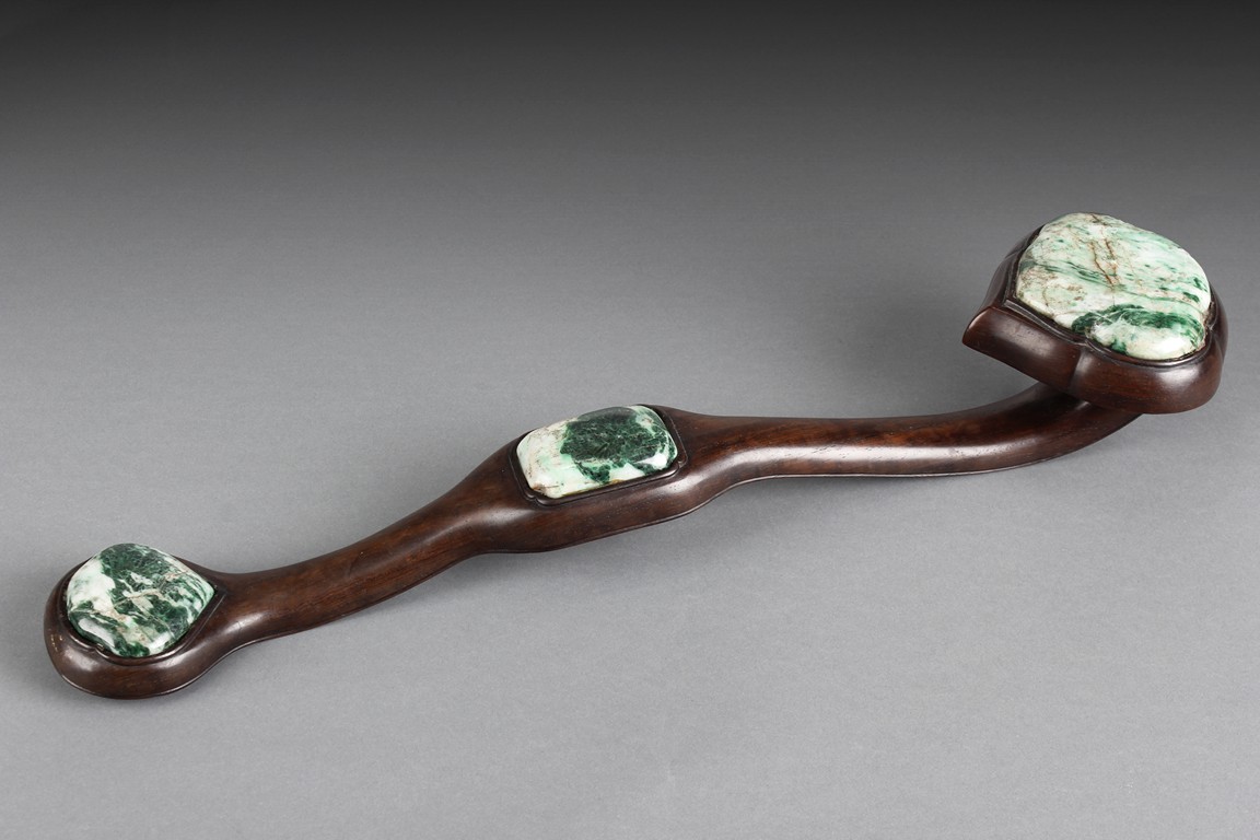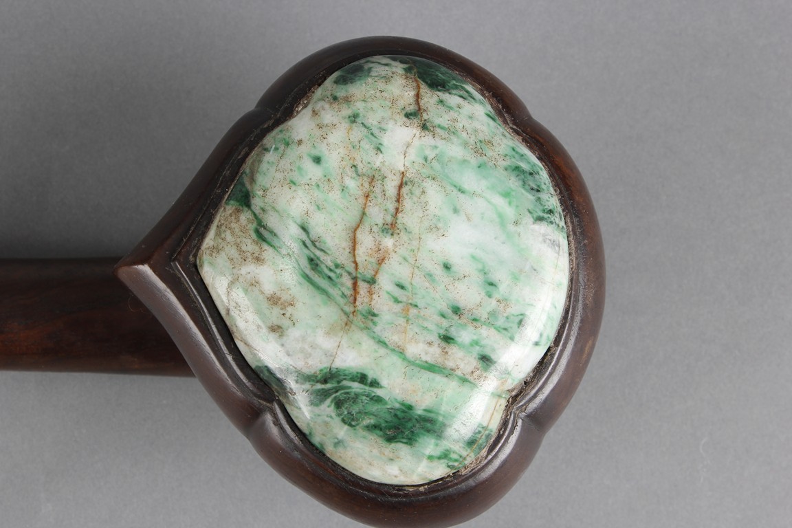 The ruyi is decorated with three jade pieces, the top and handle part of the jade inlaid are in the ruyi form, middle jade of rectangular form, all embedded on a smooth and natural toned Zitan wood handle.