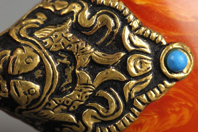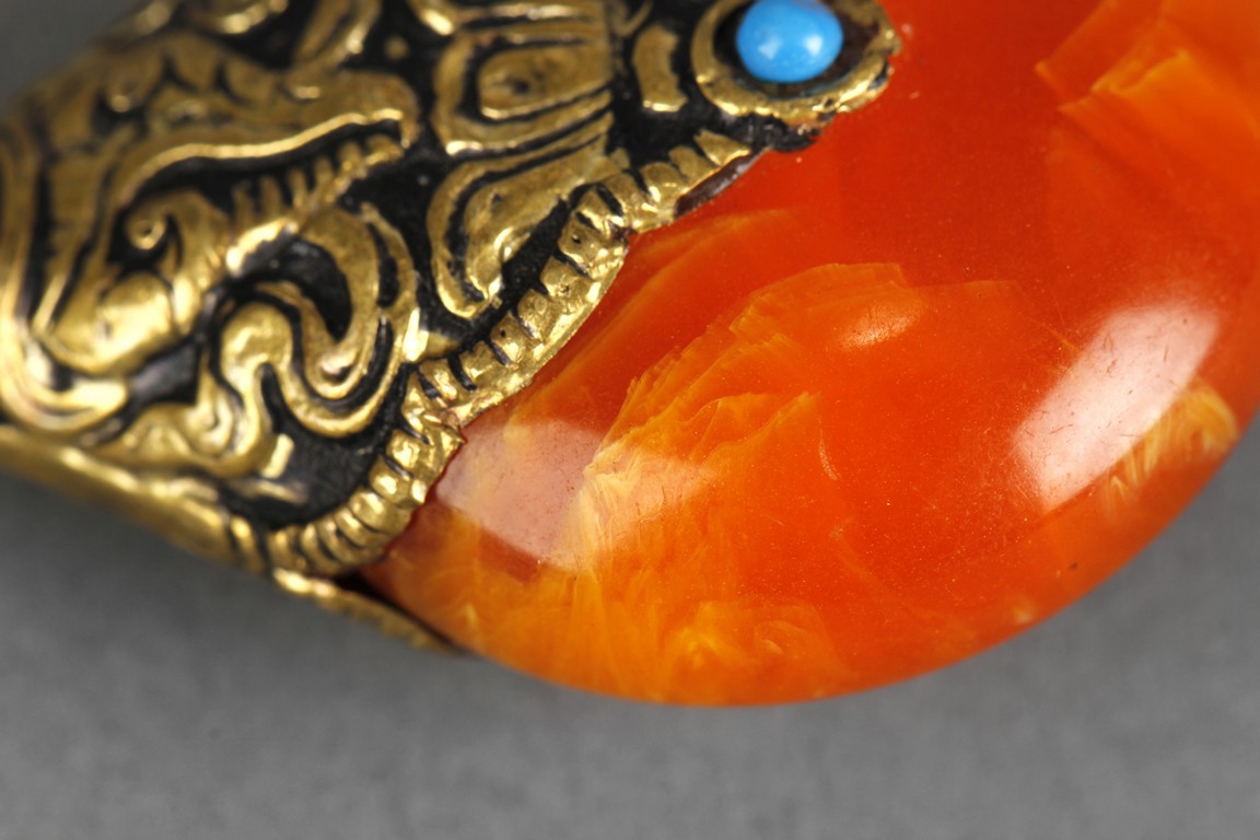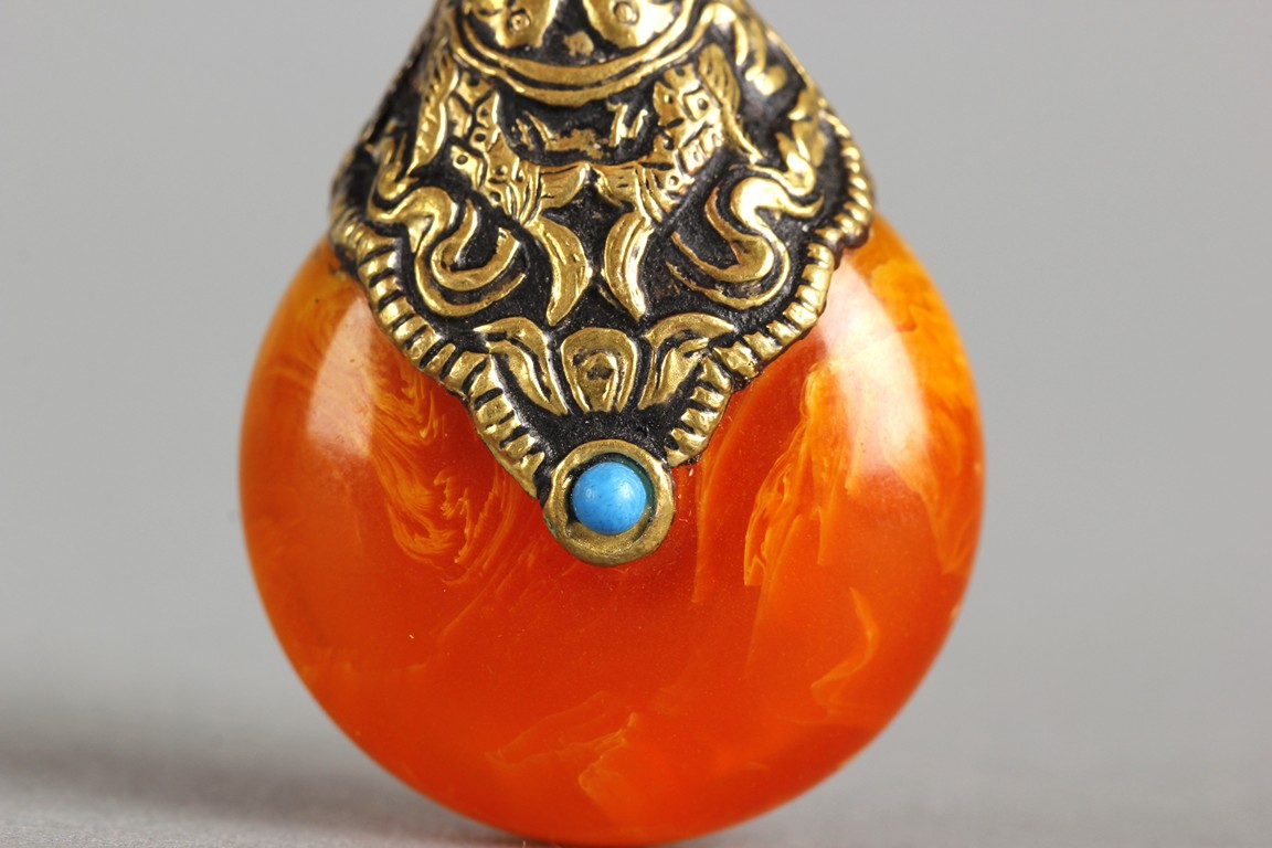 The pendant in teardrop form, with the amber's top covered by metal fish patterns along with a turquoise stone. The amber of orange-red color, with visible swirling patterns within.