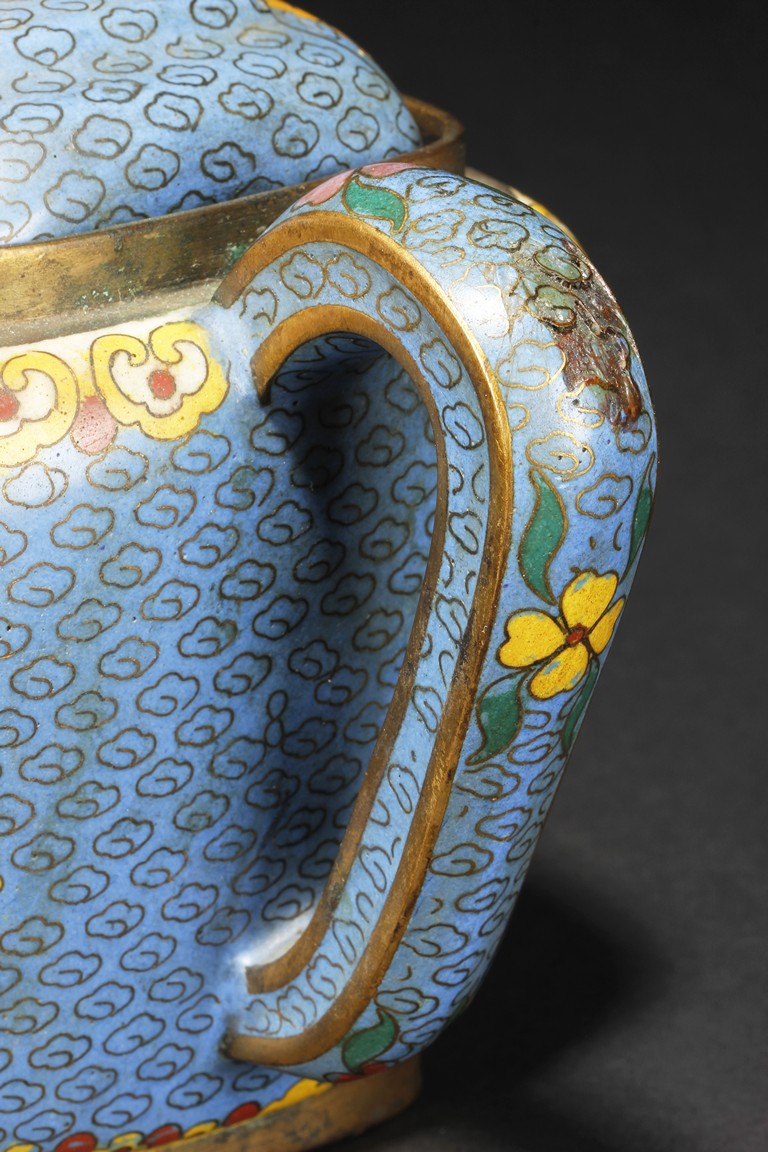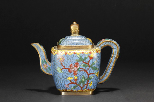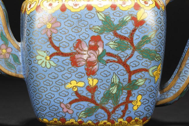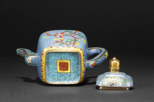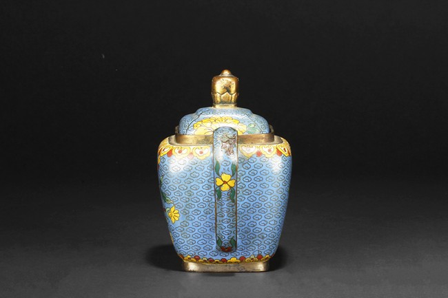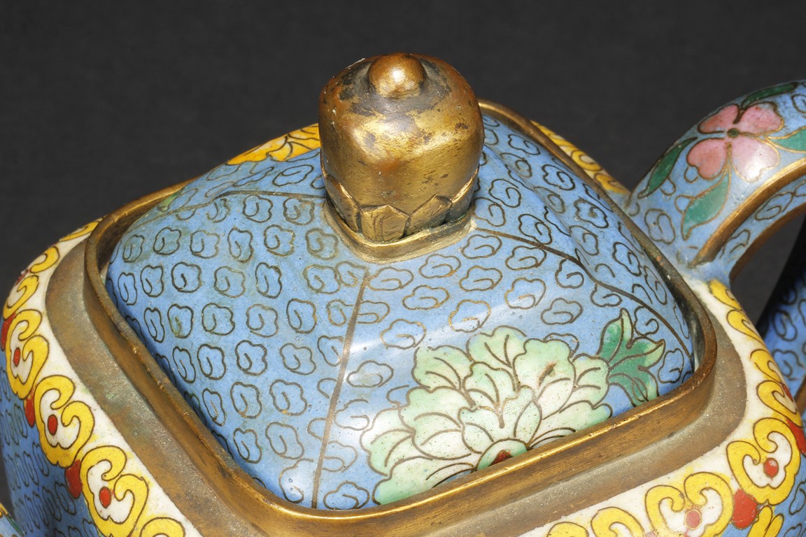 Of round square form, the body supported by a square foot ring, with large handle extending from near base to shoulder, the spout curved slightly extending from the middle of body, the body depicts blossoming peony flowers, leaves, and branches on top of teal background filled with small cloud patterns, between scrolling ruyi-head band pattern and scrolling ruyi-head cloud pattern, the bottom bears four charater'KANGXI' mark. Republic period.