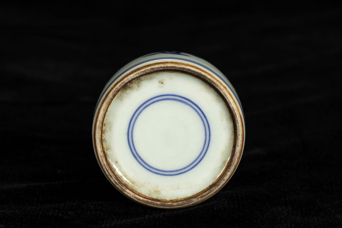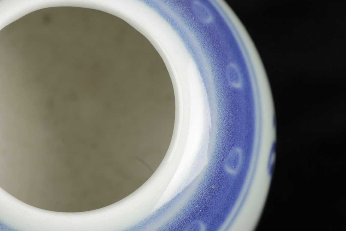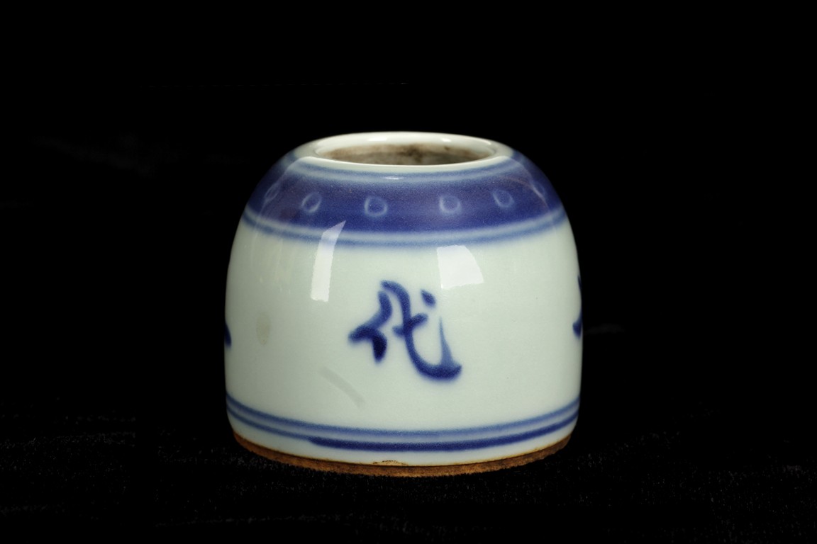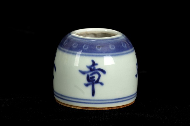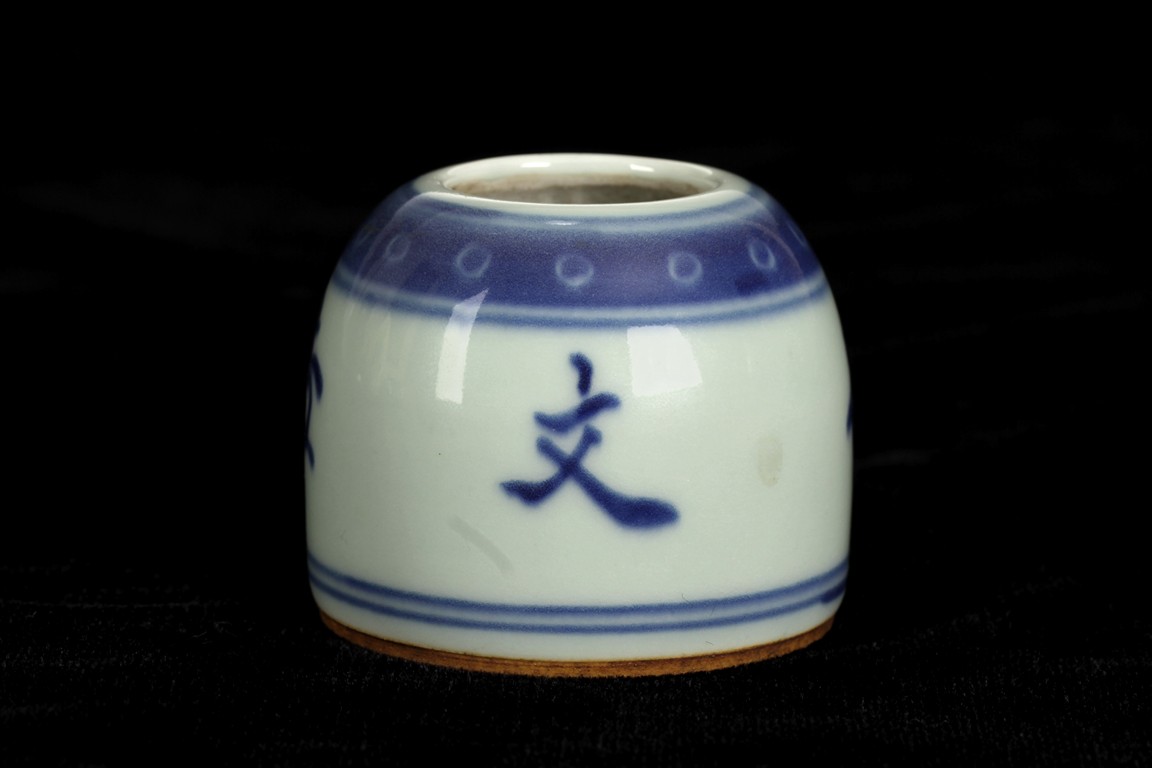 Of dome shape, the blue and white brush washer depicts four Chinese characters on the body, between scrolling double line patterns and scrolling band of round dots, the bottom with double ring pattern. 19th century.