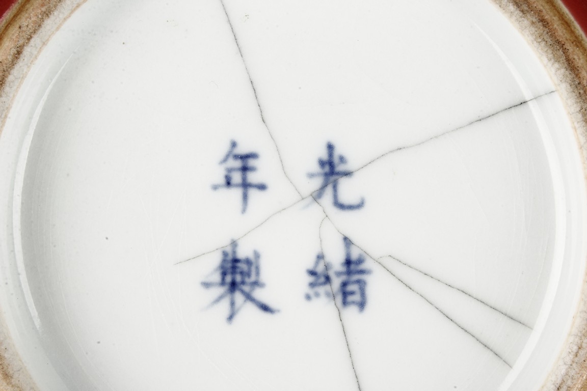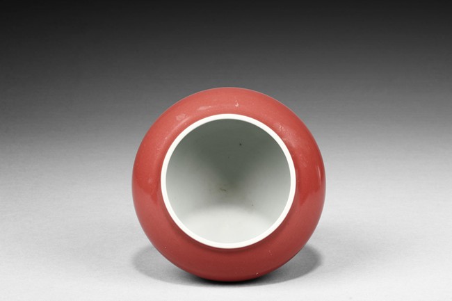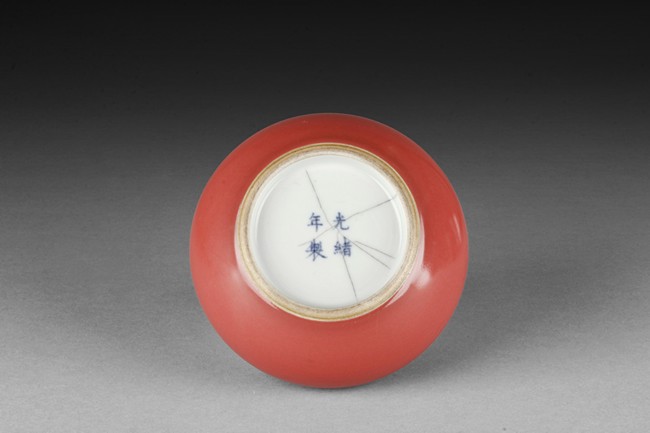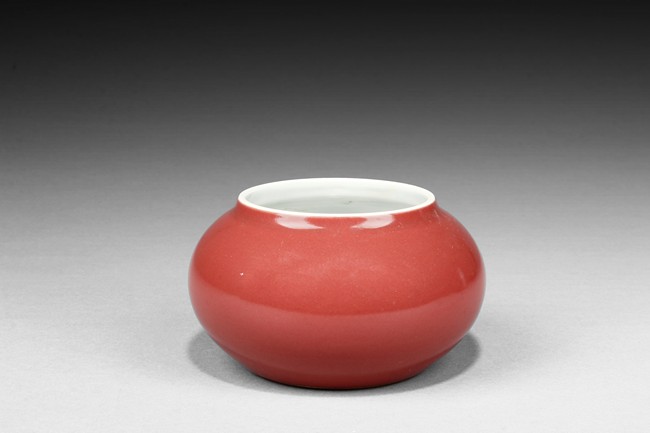 Of compressed globular form, the exterior of the water pot is entirely covered with ruby red glaze. The base is left white and bears four character'GUANGXU' mark.