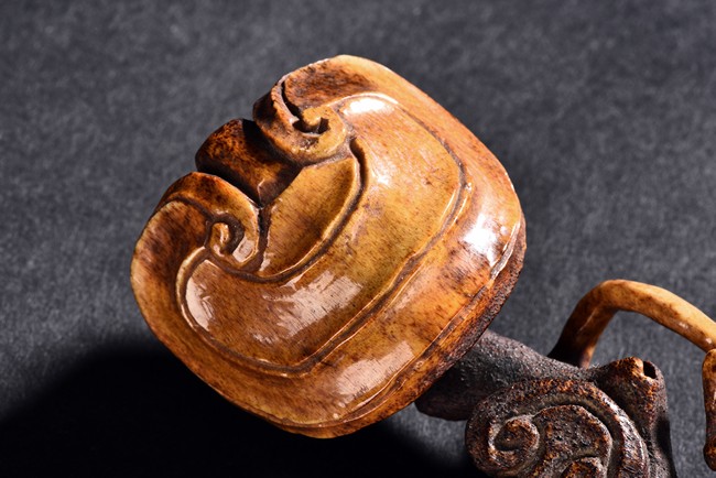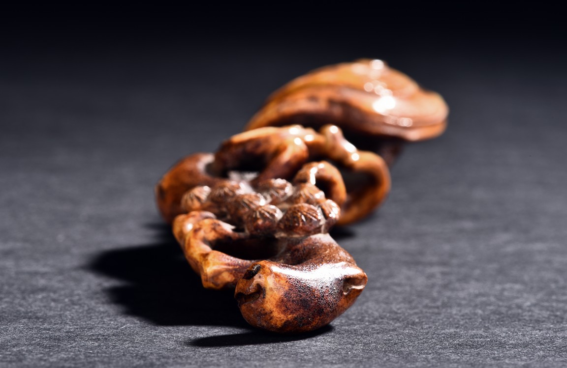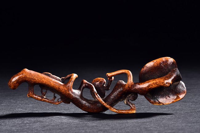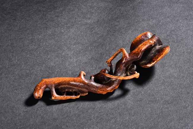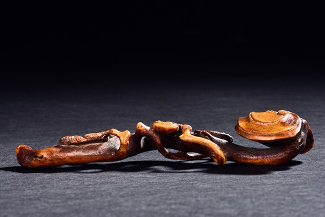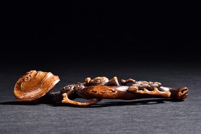 Of twisting and gnarled form, the head carved as lingzhi head and body with pine leaves.