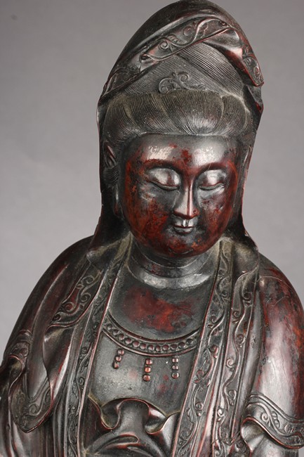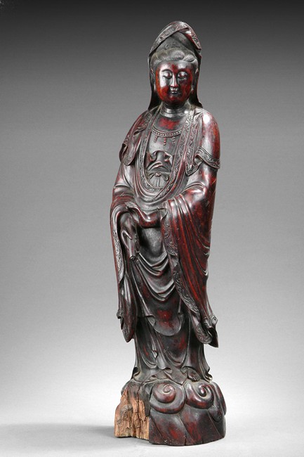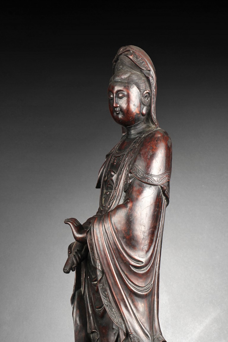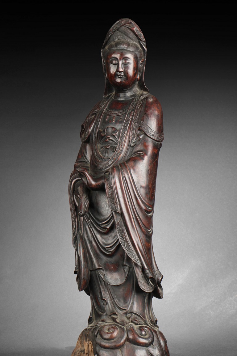 Standing gracefully on the ocean wave, her right hand with a vase pouring downwards, her left hand assisting, looking downwards in serene expression, the Guanyin dressed in in loose and long robe, wearing a long cowl and ornaments. 18th century.