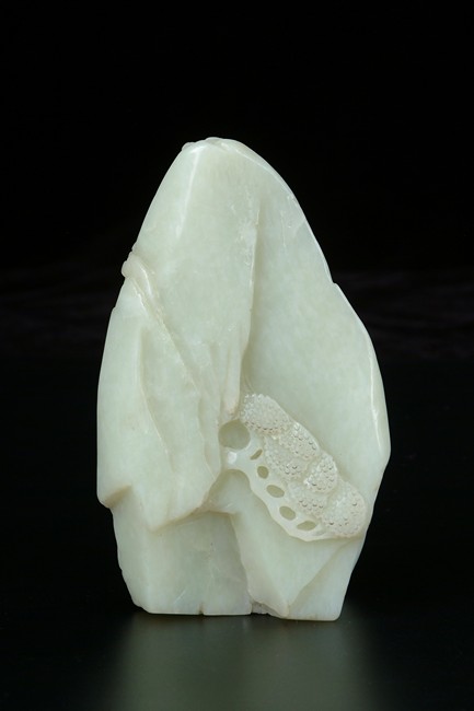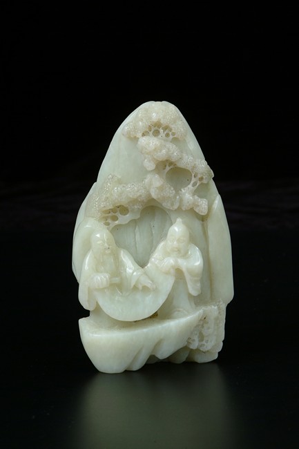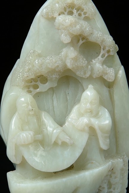 Carved in relief to one side with two scholars holding a long scroll on a rocky ledge beneath a pine tree, the reverse with a single pine tree branch. 19th century.