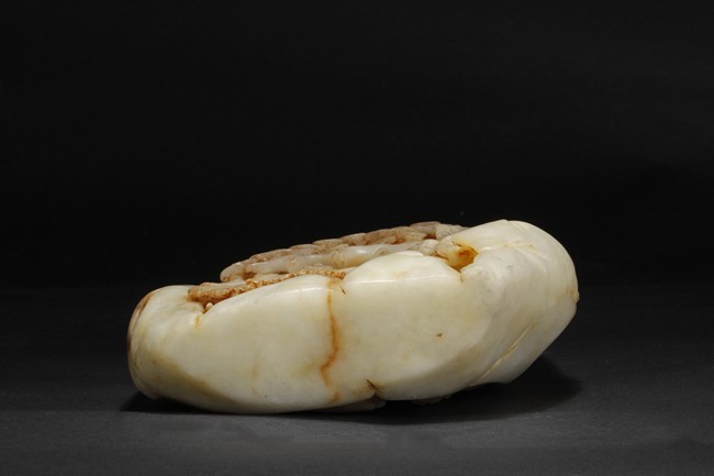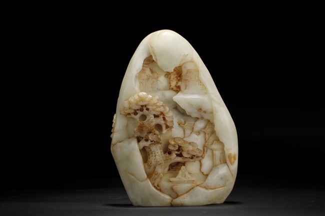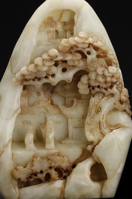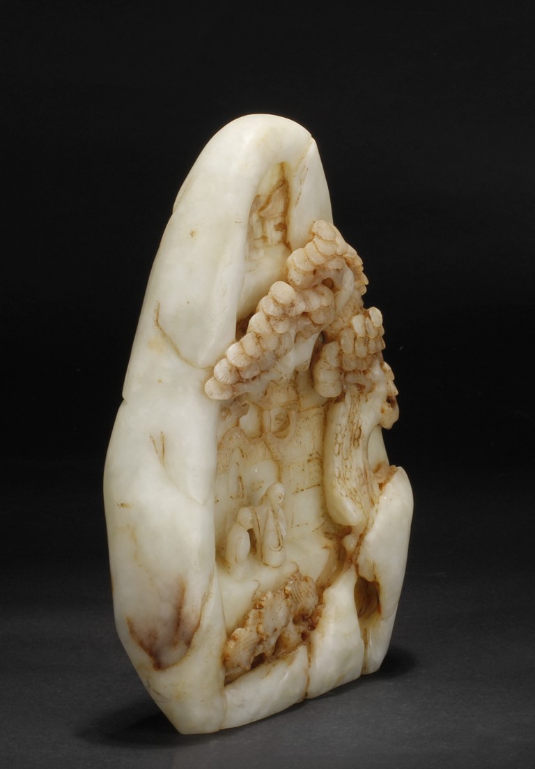 Of irregular shape, high relief carved on both sides, one side with a monk and an elder meeting in front of a hidden temple beneath dense pine trees, the other side with an elder playing Chinese musical instrument under pine trees, with a path leading into the mountain behind him; the stone of pale white color with some russet. 19th century.