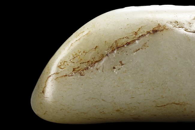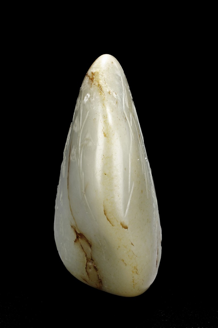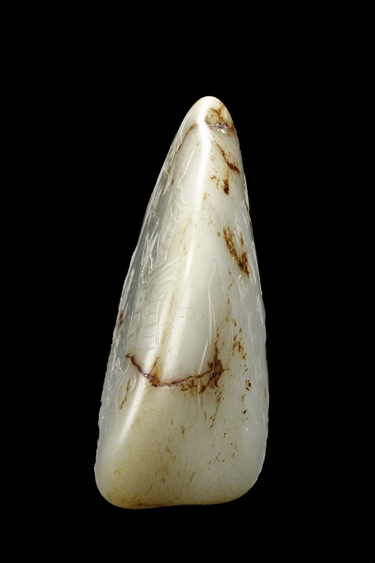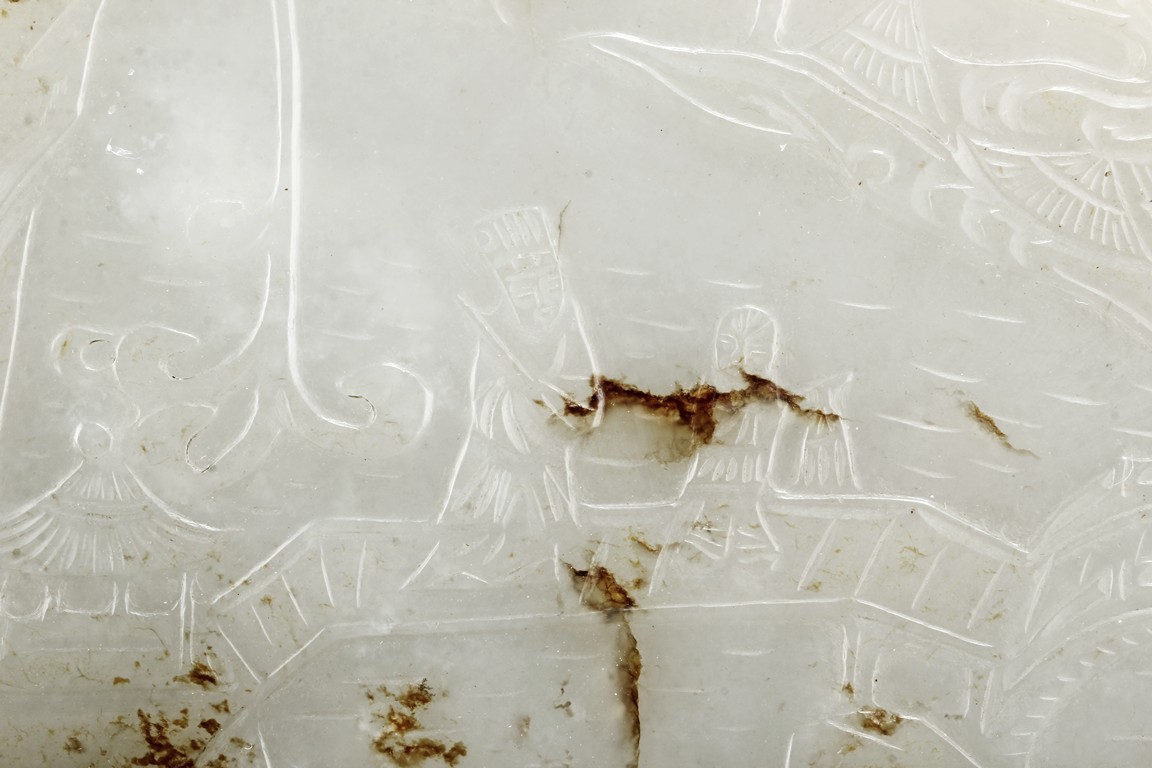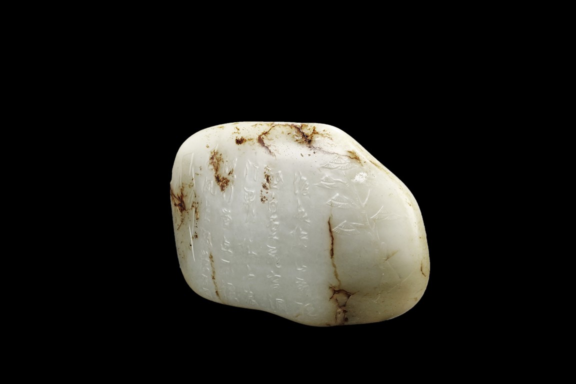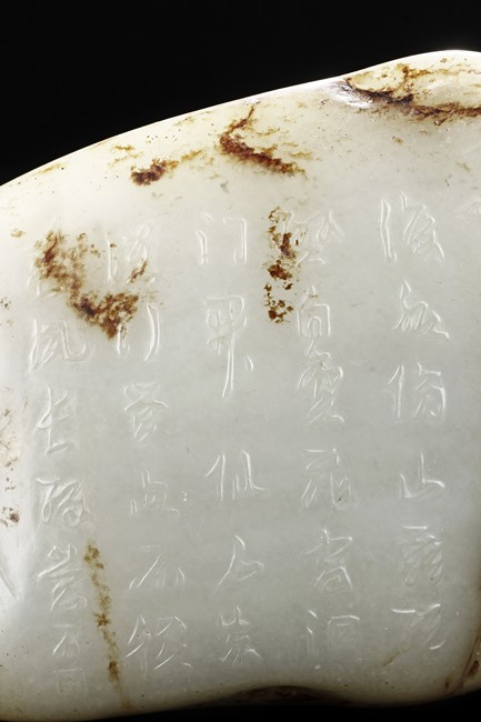 The decorative ornament boulder made from Hetian jade, carved on one side with elder and attendant crossing the bridge in a river scenery, the reverse carved with Chinese poetry, the Hetian jade stone of white color with occasional russet areas. Qing Dynasty period.