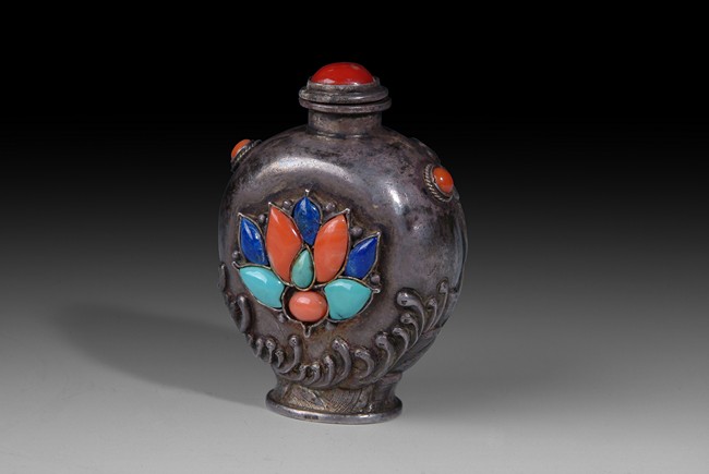 This silver snuff bottle was sculpted with a four clawed dragon on one side, and a lotus flower embellished with gemstones such as coral, turquoise, and lapis lazuli on the other side. The body was also decorated with two coral beads, and the bottle is completed with a coral stopper.