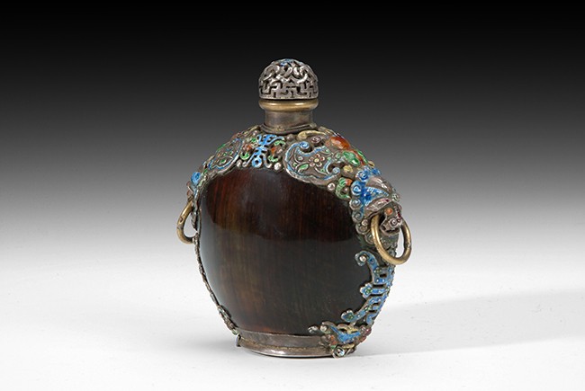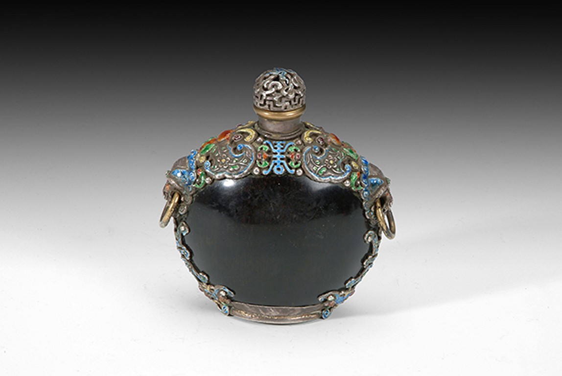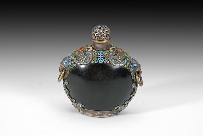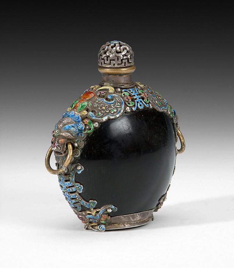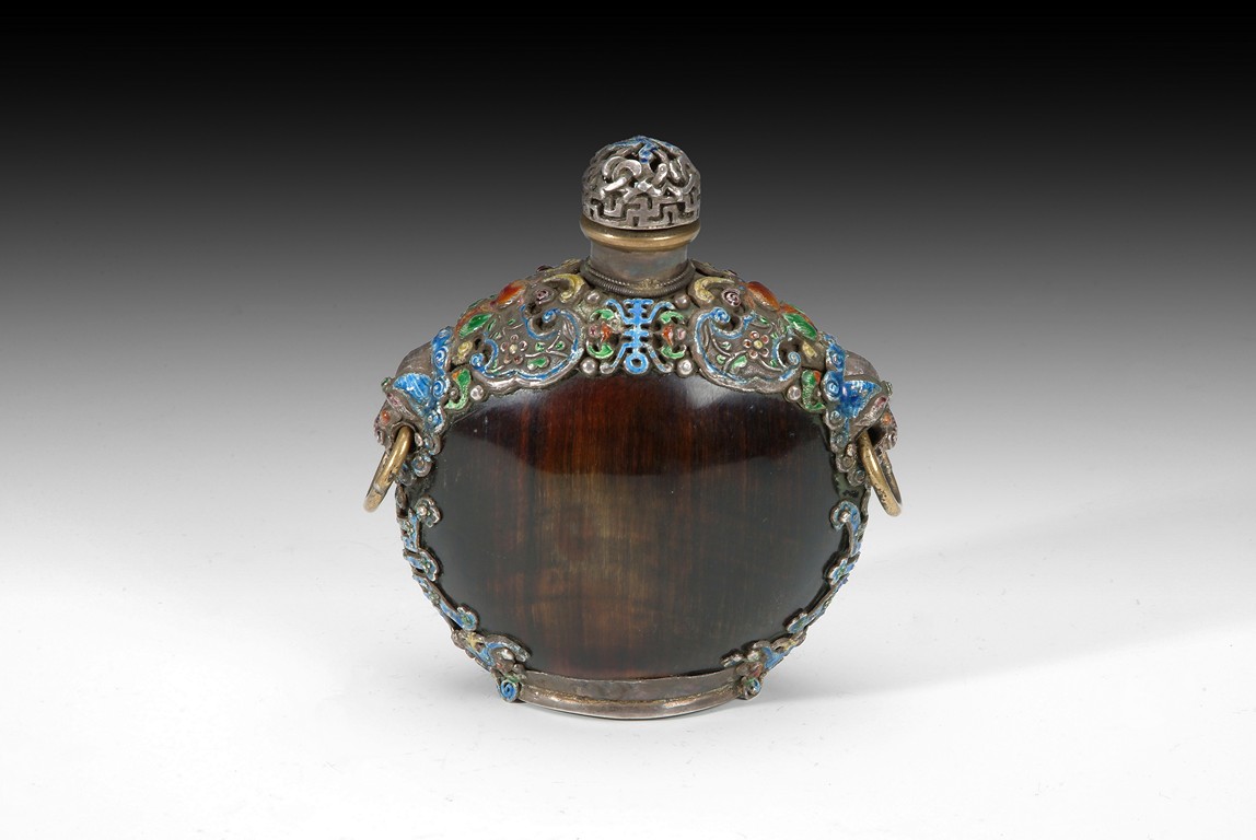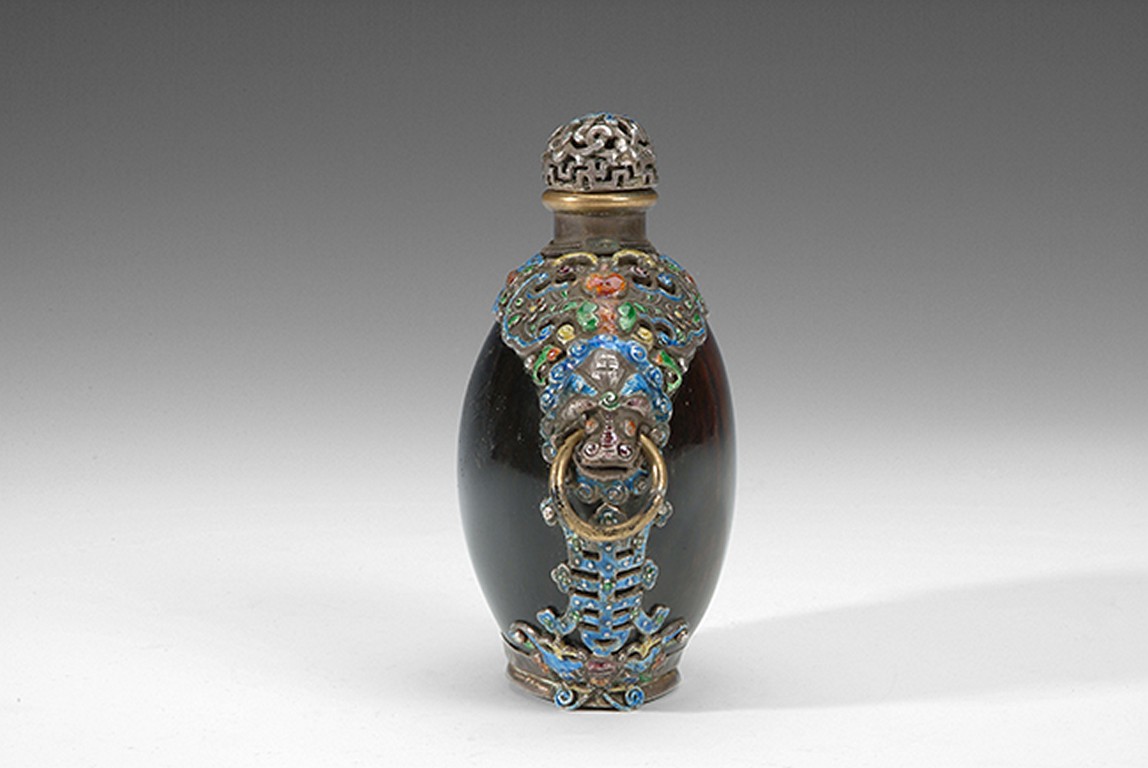 The snuff bottle's body is made of horn, with cloisonné enameled silver casted around it. On the side, two through rings hang out of Taotie Masks. The stopper is made of silver, and the spoon is made of horn.