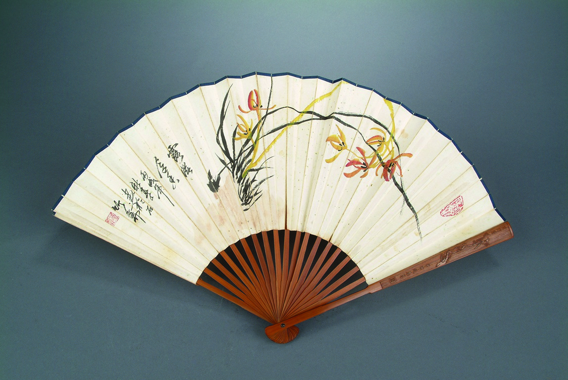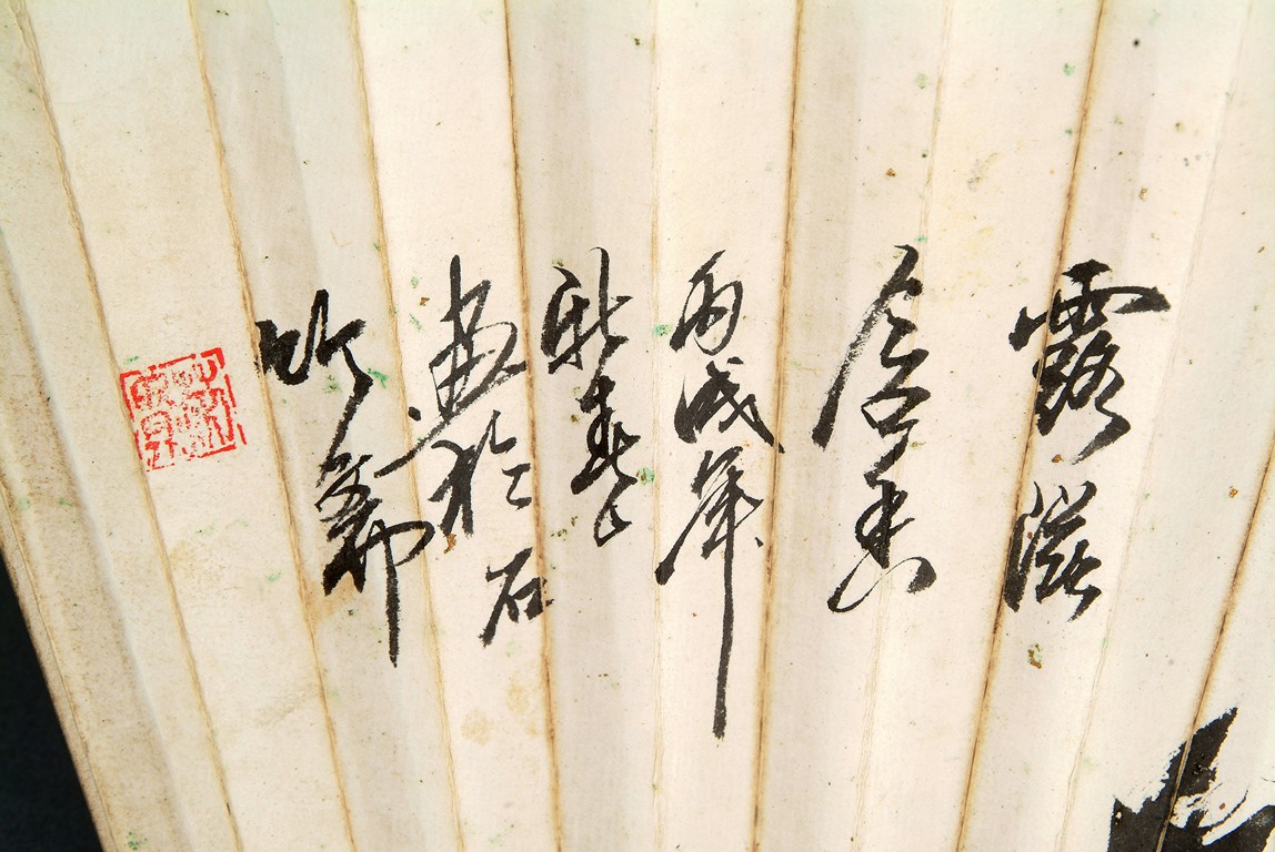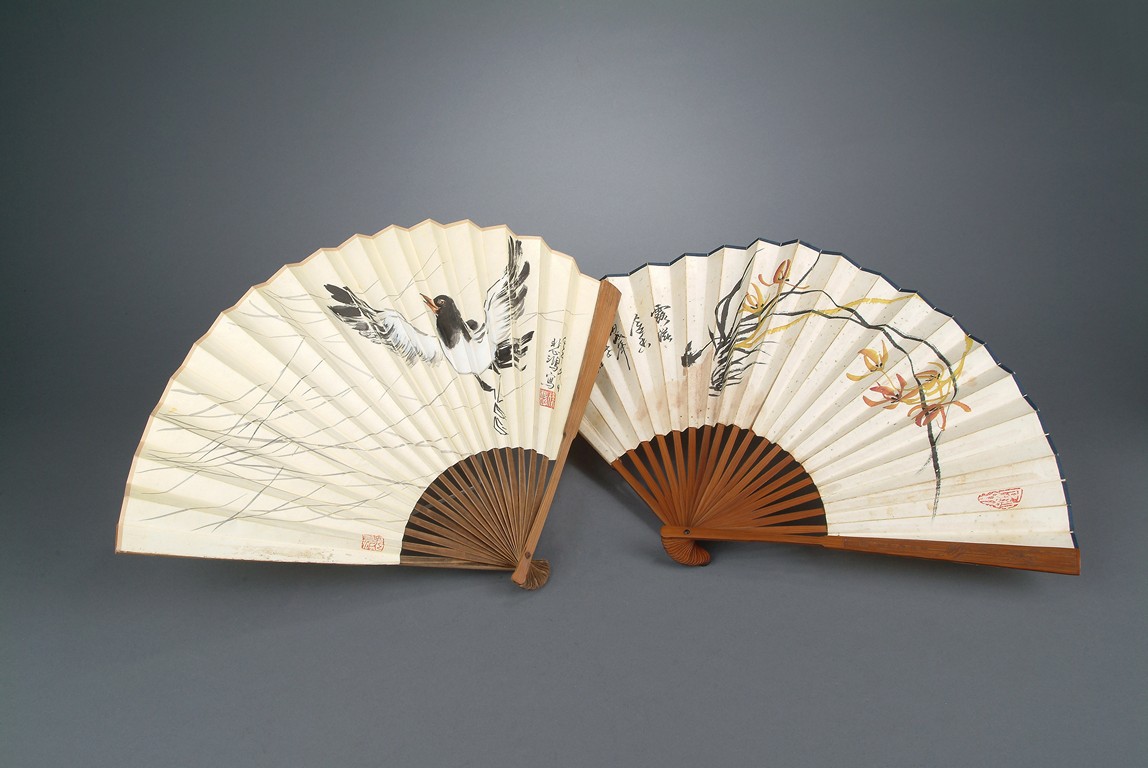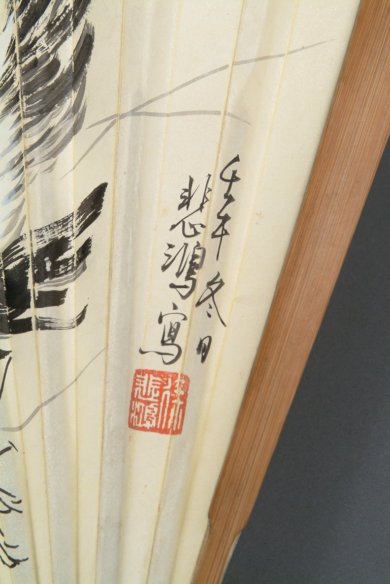 A pair of well made Chinese fans each depicting a different theme, the first one features a blossoming flower across the front side, a set of calligraphy and artist seal'Zhu Qi' on the side. The second one features a lone bird amidst elegant looking lines that are similar to bamboo leaves, artist seal'Xu Bei Hong' on the side. Set of calligraphy on the reverse.