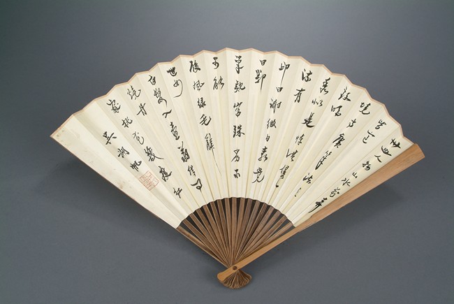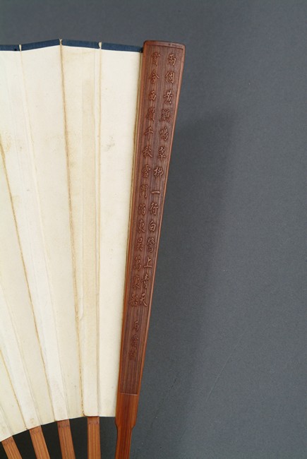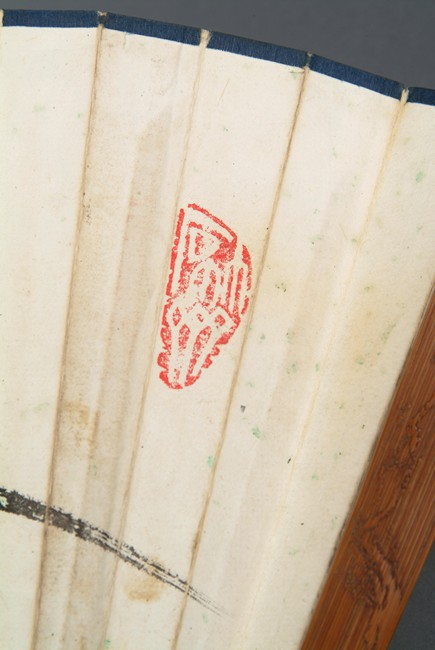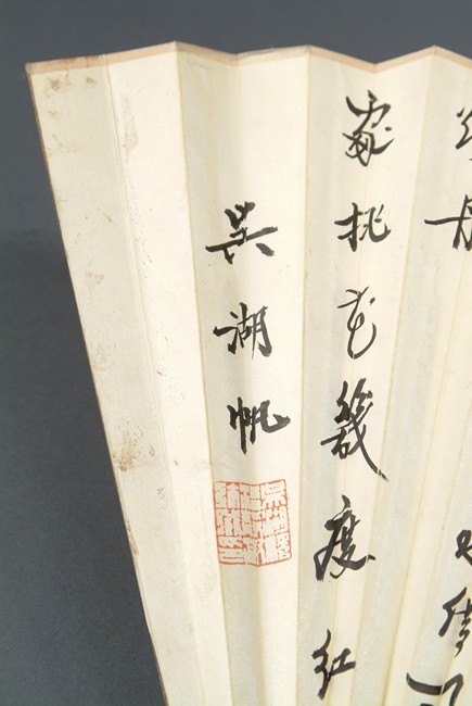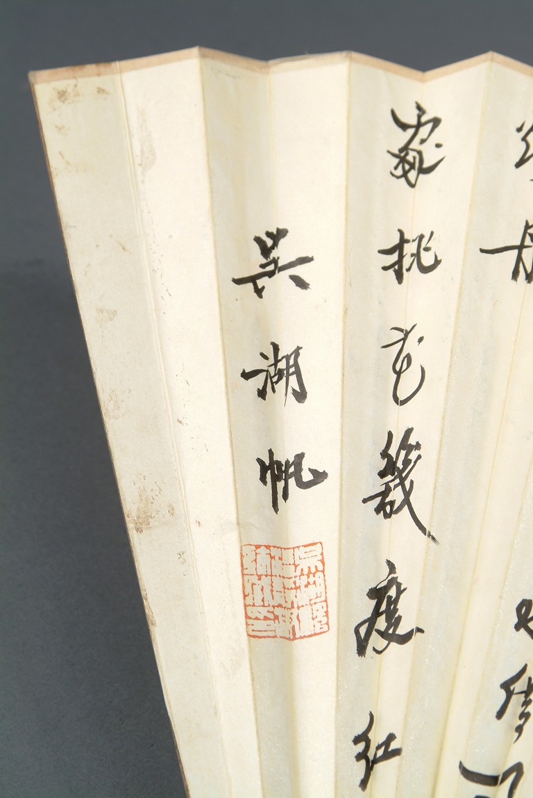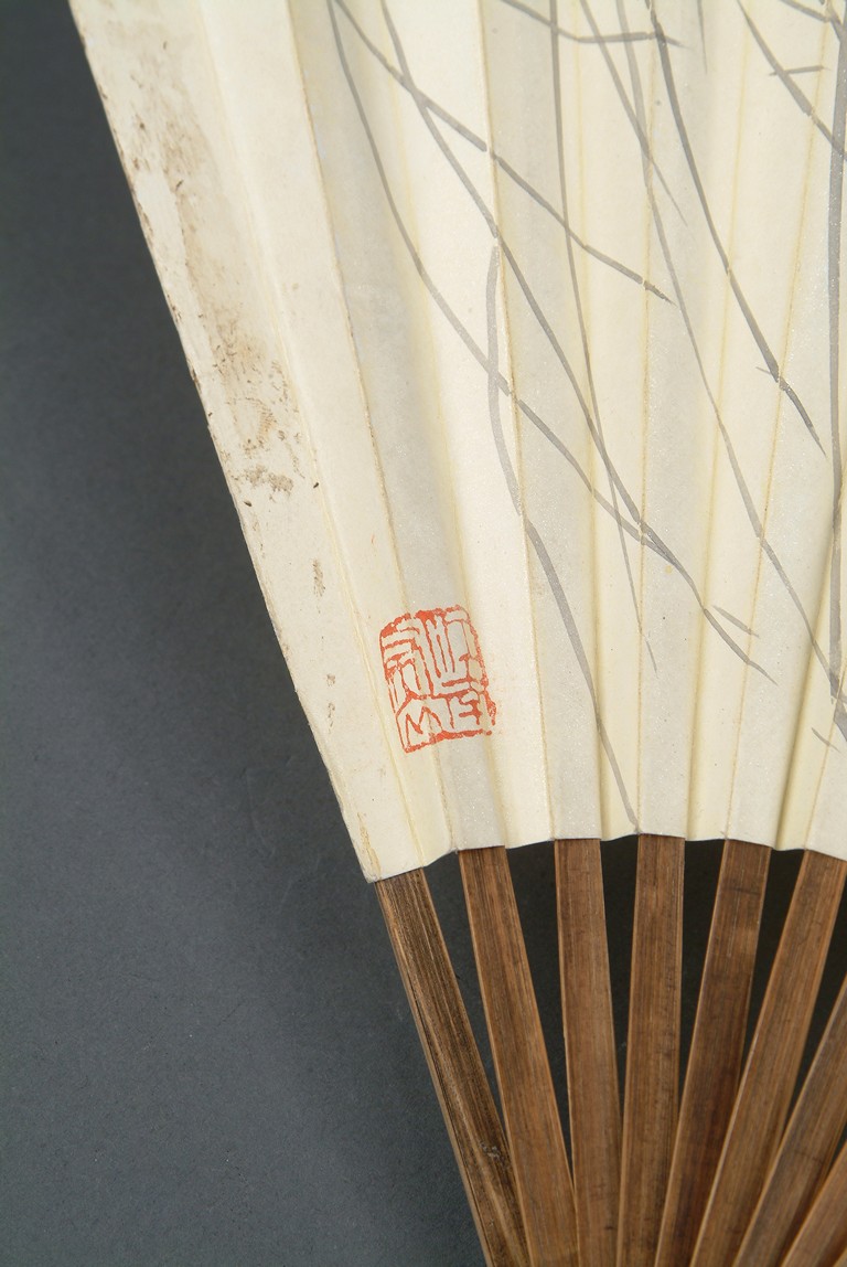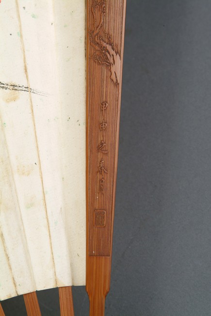A pair of well made Chinese fans each depicting a different theme, the first one features a blossoming flower across the front side, a set of calligraphy and artist seal'Zhu Qi' on the side. The second one features a lone bird amidst elegant looking lines that are similar to bamboo leaves, artist seal'Xu Bei Hong' on the side. Set of calligraphy on the reverse.