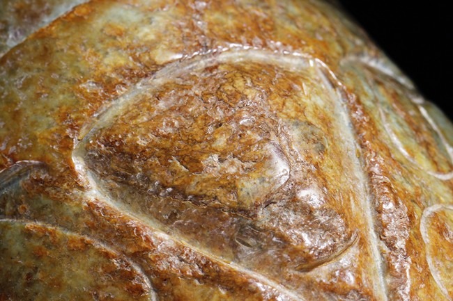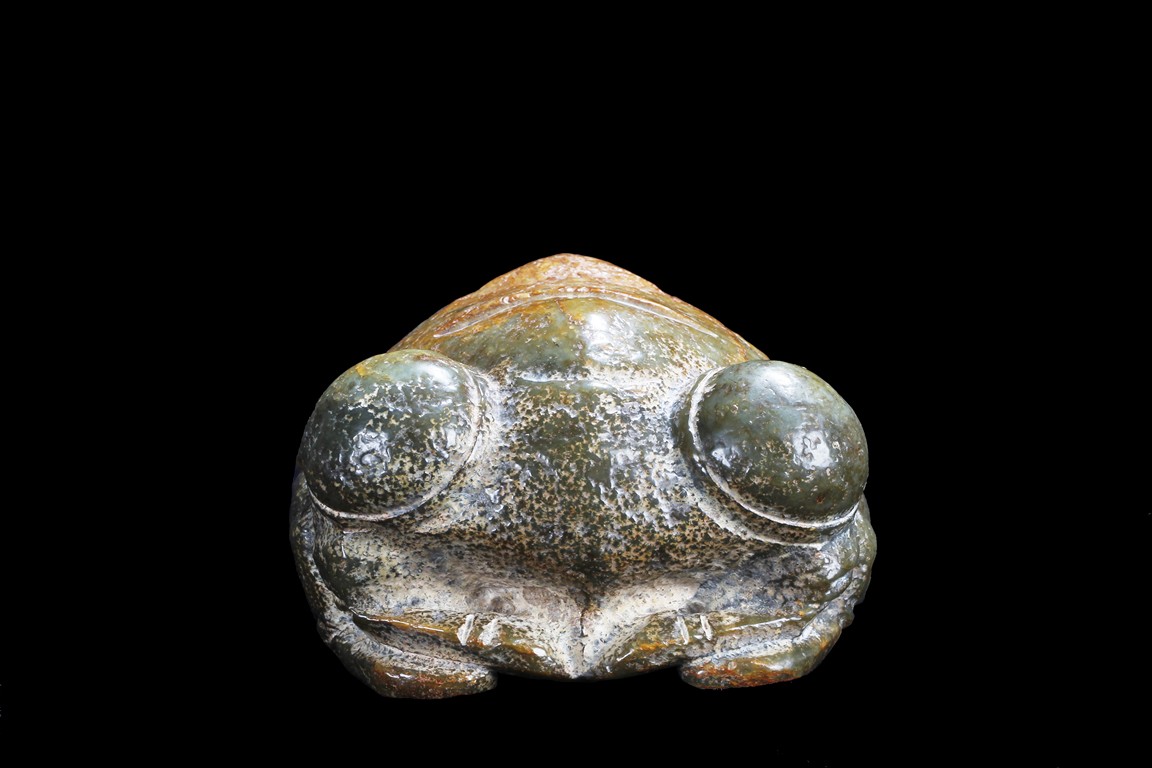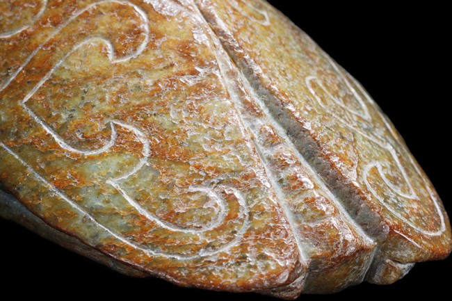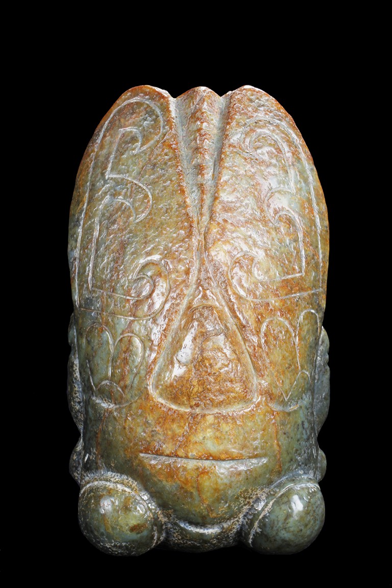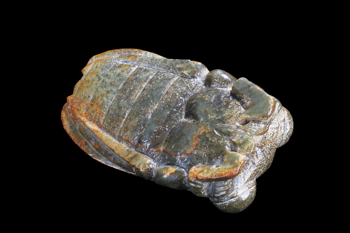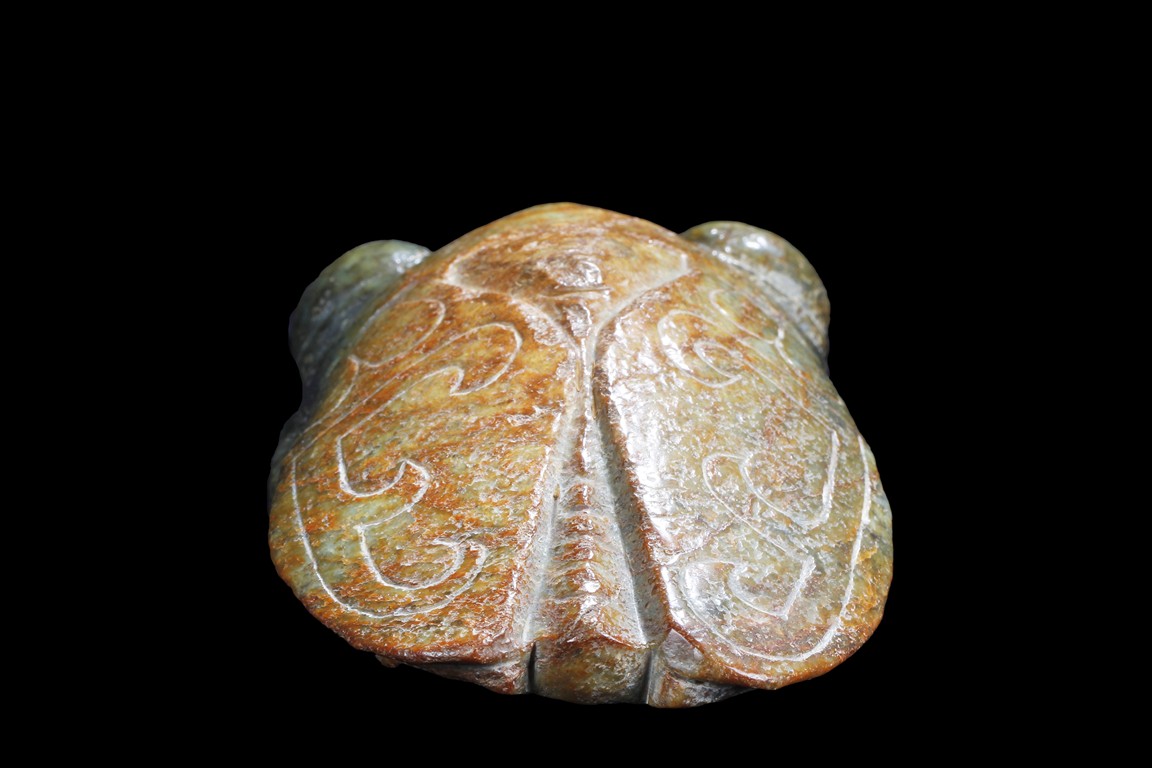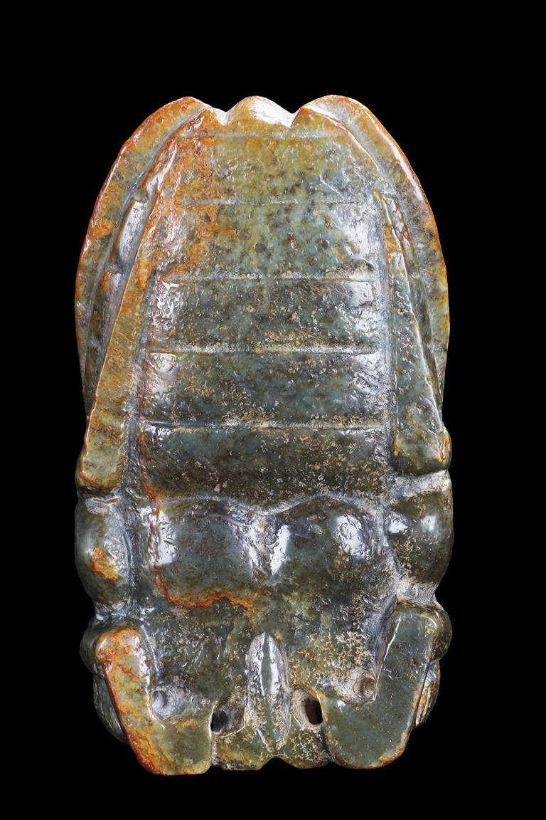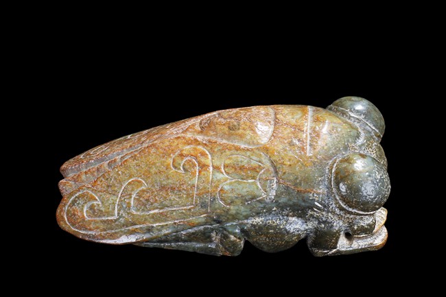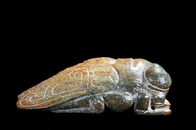 The carving depicts a cicada with bulging eyes resting on all legs, the wings carved with hook-like patterns, the stone of green and dark green color, with small russet patch on the top, two holes at front for stringing. Qing Dynasty period.