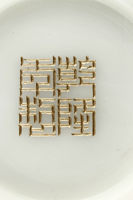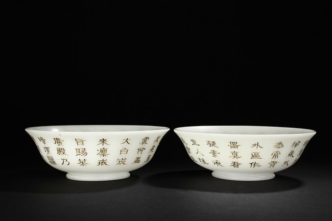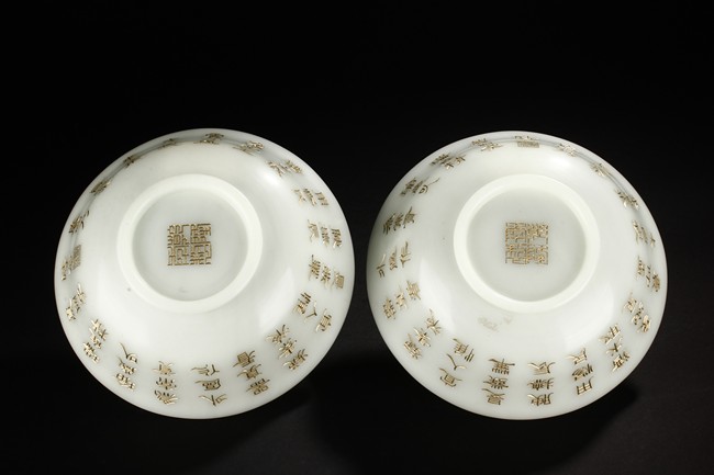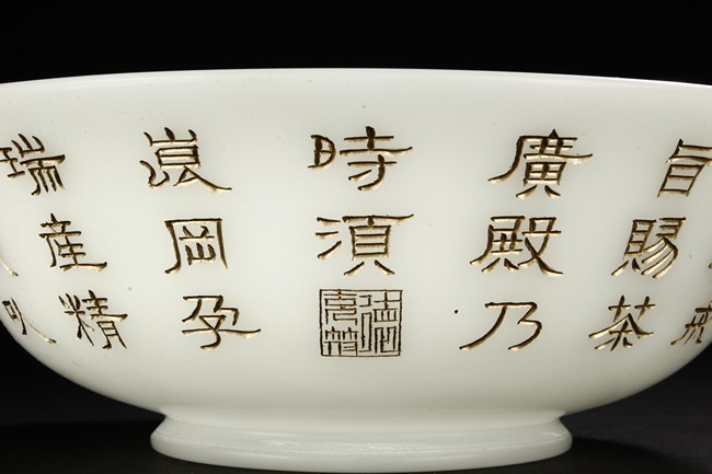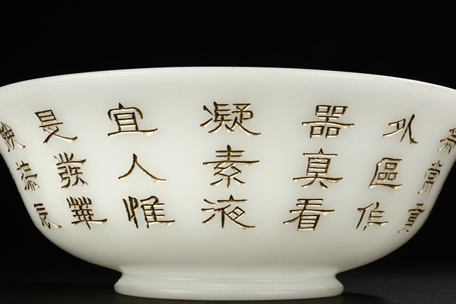 The shallow bowls curves elegantly, supported by splayed ring foot, the body gilt with poetry calligraphy and artist mark, all on top of smooth white glass, and the bottom bears four character'QIANLONG' mark. Qing Dynasty Period.