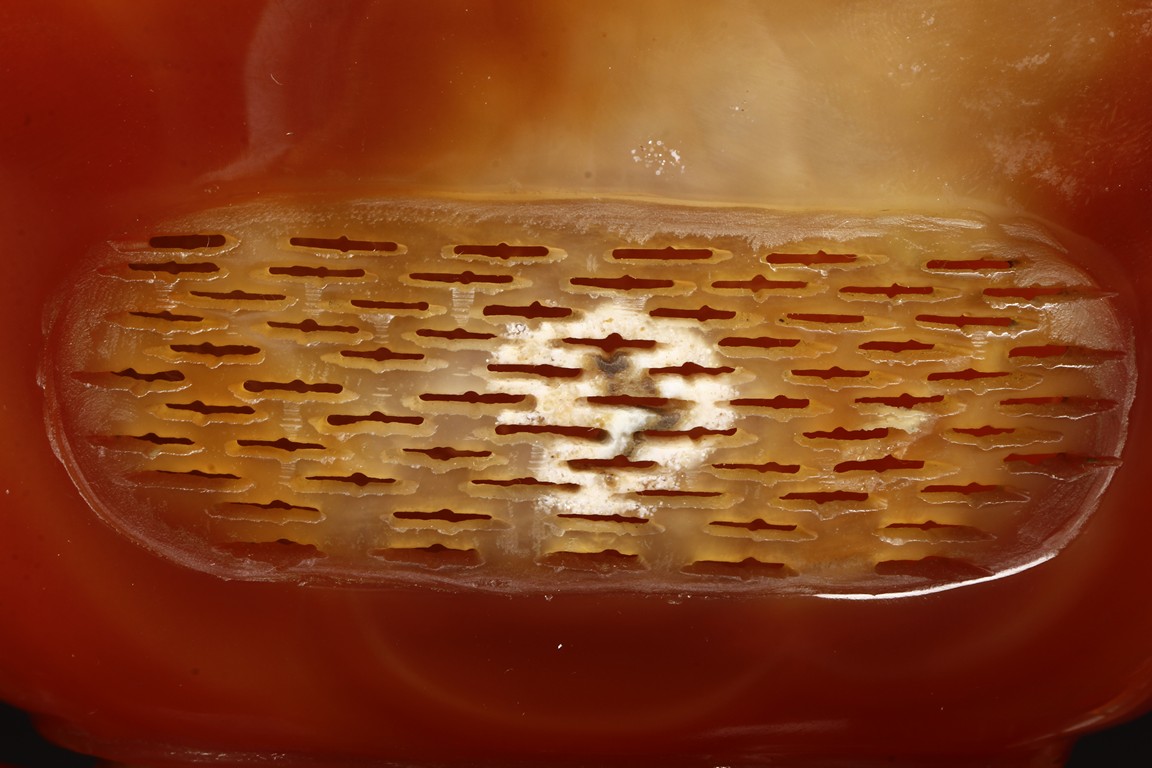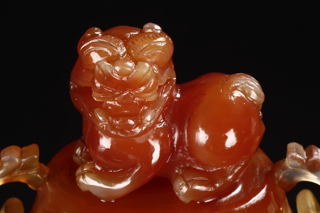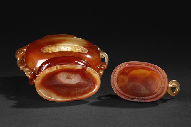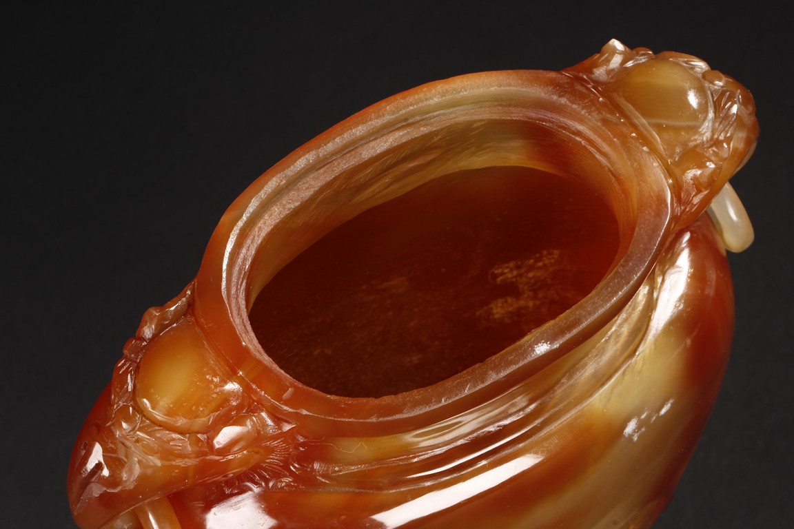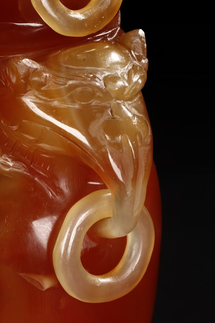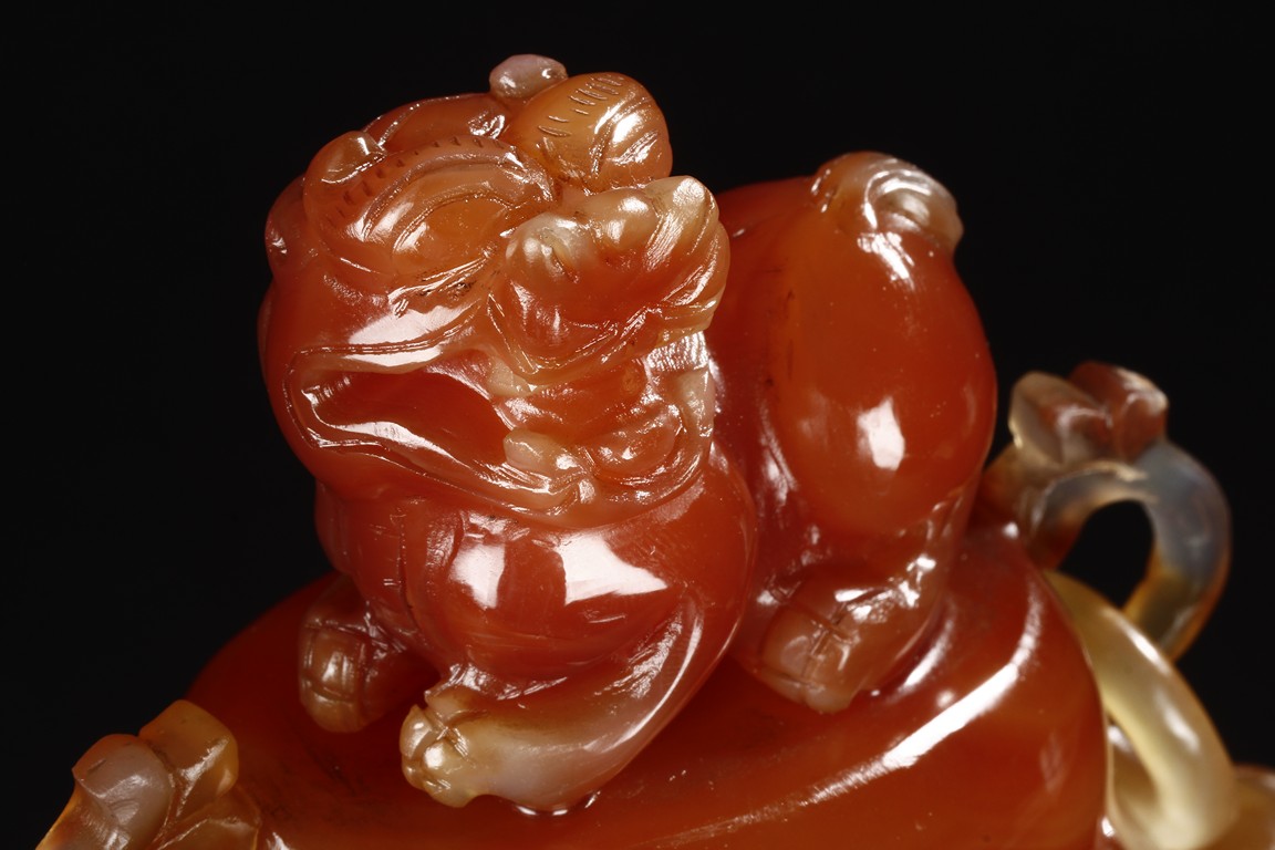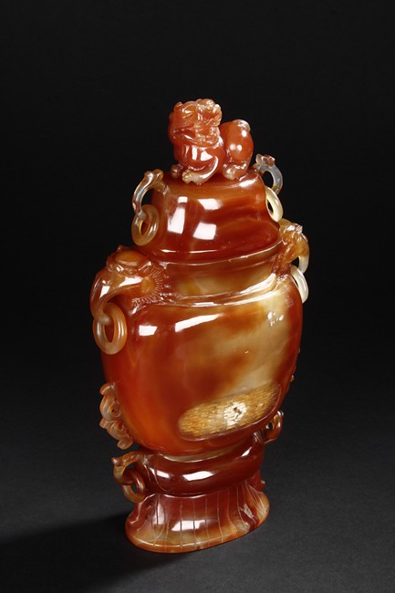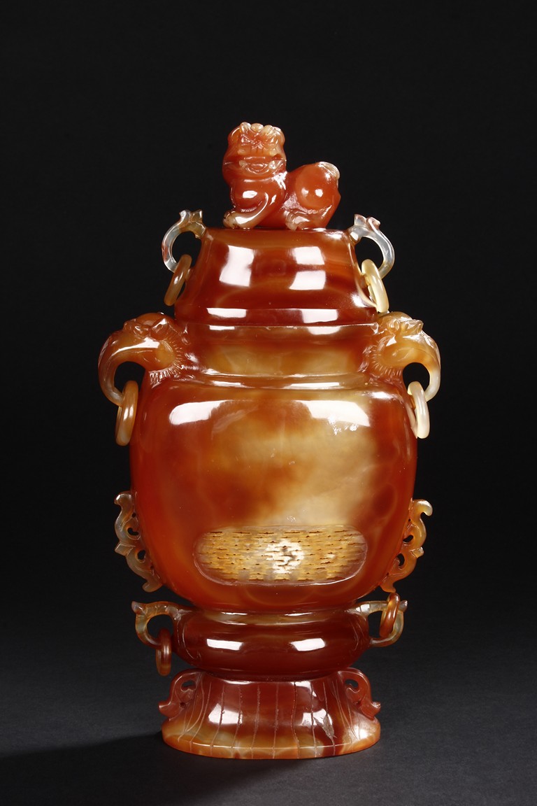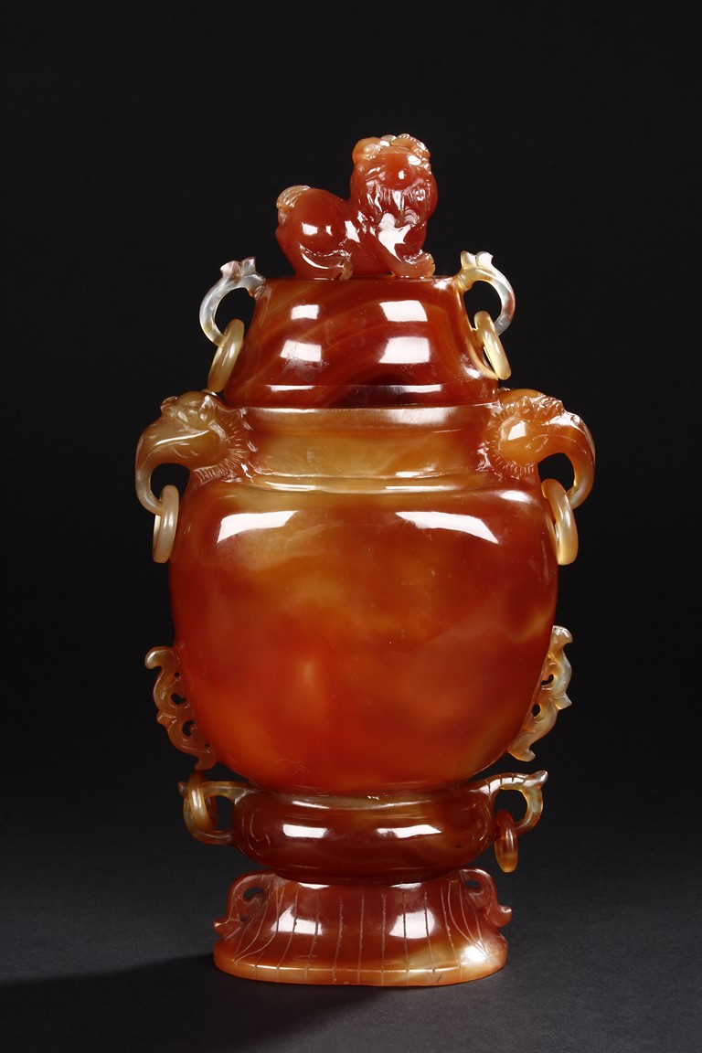 The vase in flattened form, supported by an ovoid ring foot, the front bottom carved with horizontal openings, the sides carved with two elephant mask handles with looped rings, additional looped ring handles near bottom and on the cover, and a small lion surmounted on top as finial, looking sideways. The vase has orange-red color, with small patches of white. 20th century.