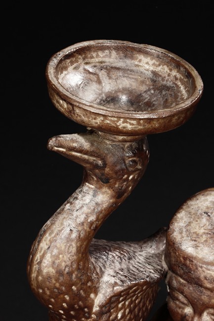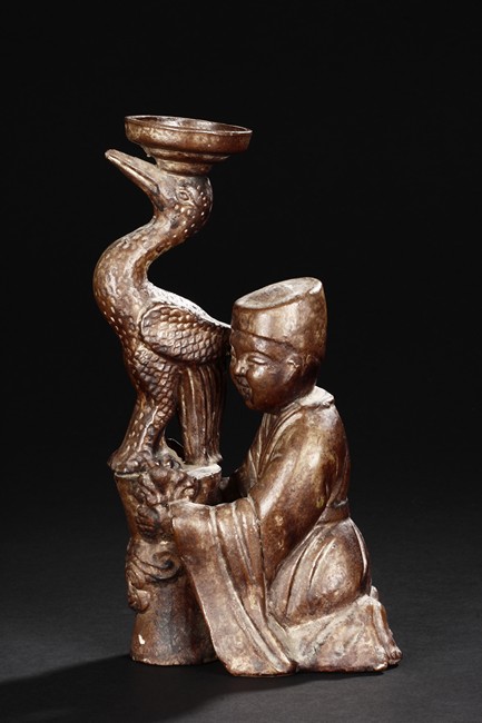 Carefully sculpted, the ceramic candleholder depicts a robed man kneeling in front of a drum-shaped column, which mounts a crane with head raised high, holding a bowl for the candle, all glazed in dark brown with excellent patina. Tang/Song Dynasty period.