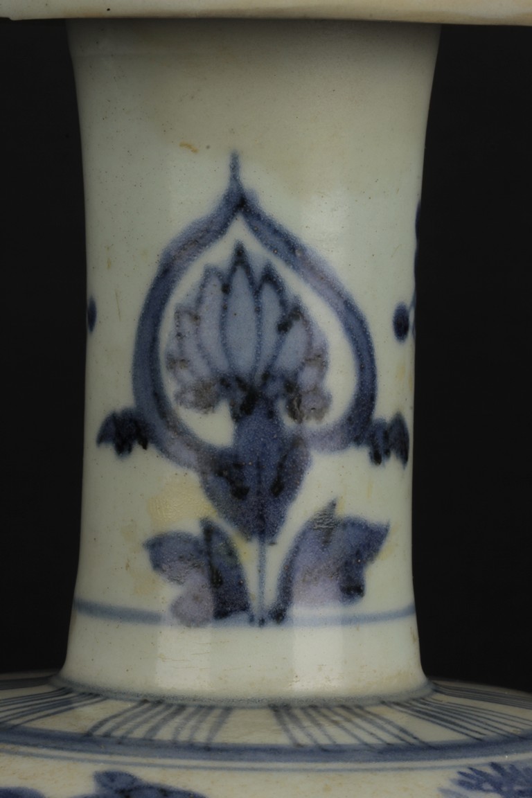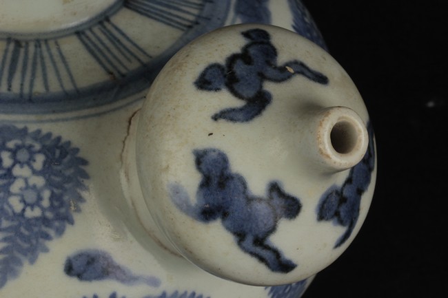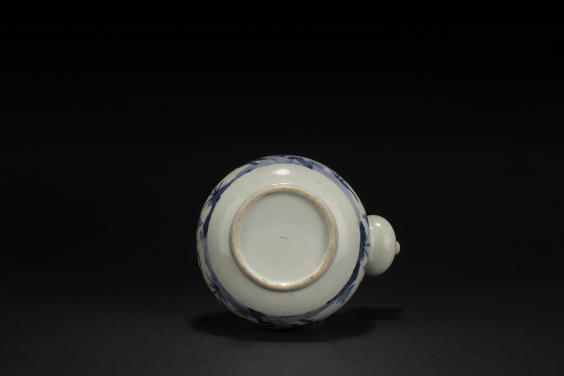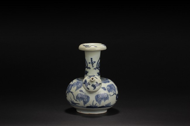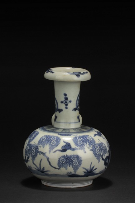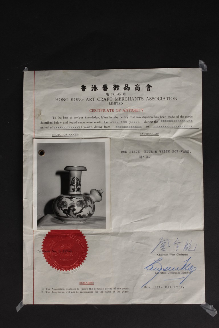 Of globular form with long straight neck and everted rim, the body painted with blossoming flowers, clouds, and viewing stones, the gourd form mouth and rim painted with cloud patterns, and the neck with similar themed flower patterns. Includes Hong Kong Art Craft Merchants Association Certificate of Antiquity No. B 197-1, dated May 1st, 1971, stating the vase is over 100 years old. Qing Dynasty period.