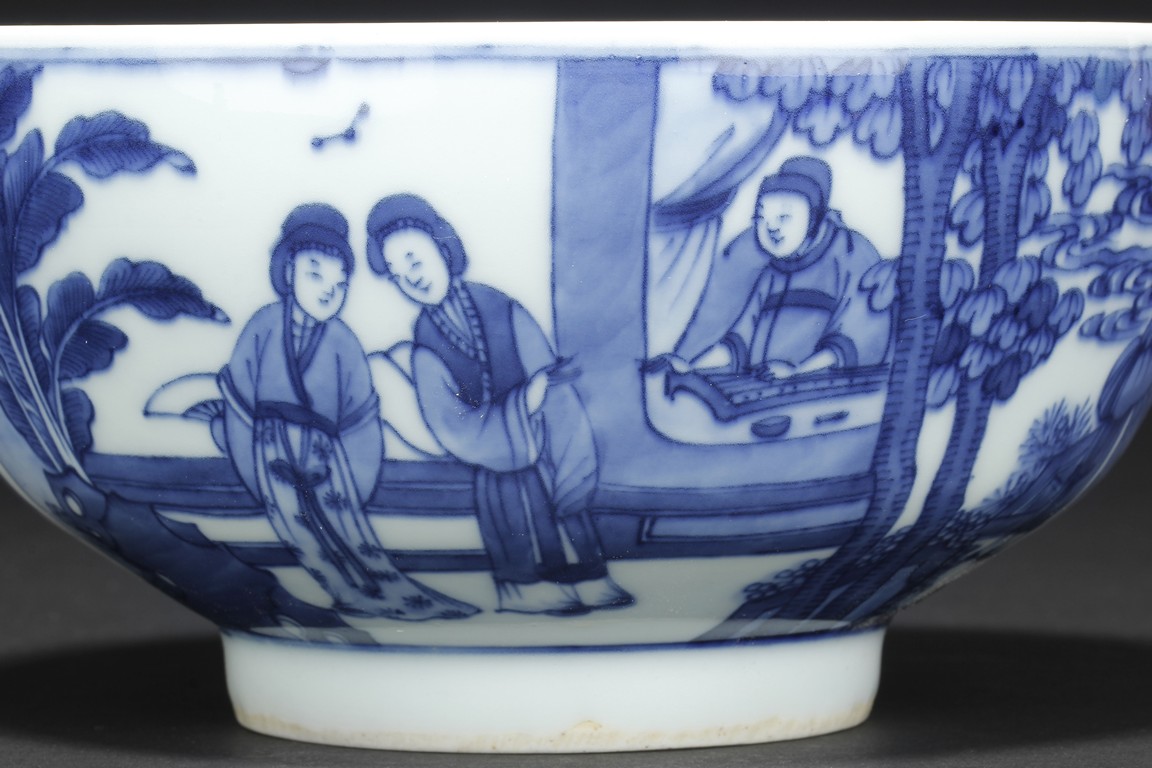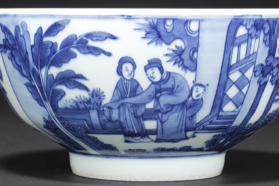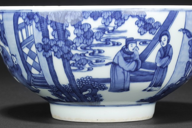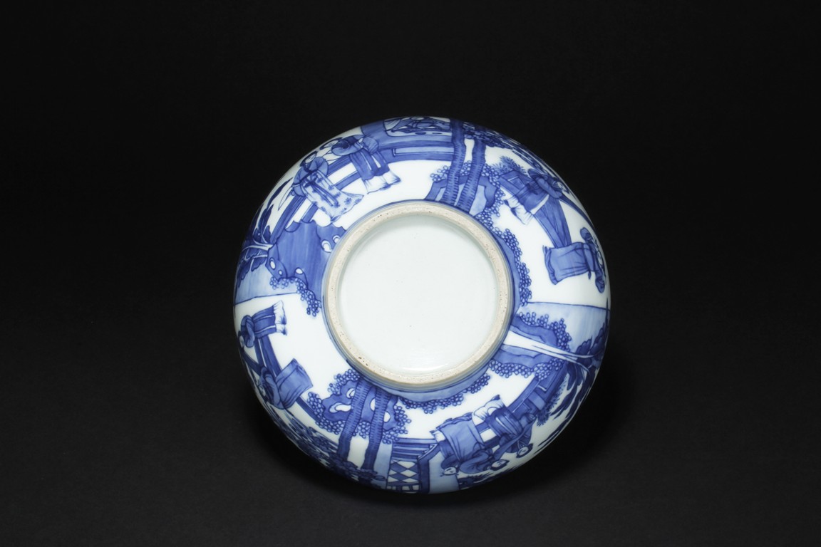 The exterior painted with scrolling scene of a well-endowed family spending time together in their large house, engaging in activities such as flower viewing, playing musical instrument, and talking with one another. Qing Dynasty period.