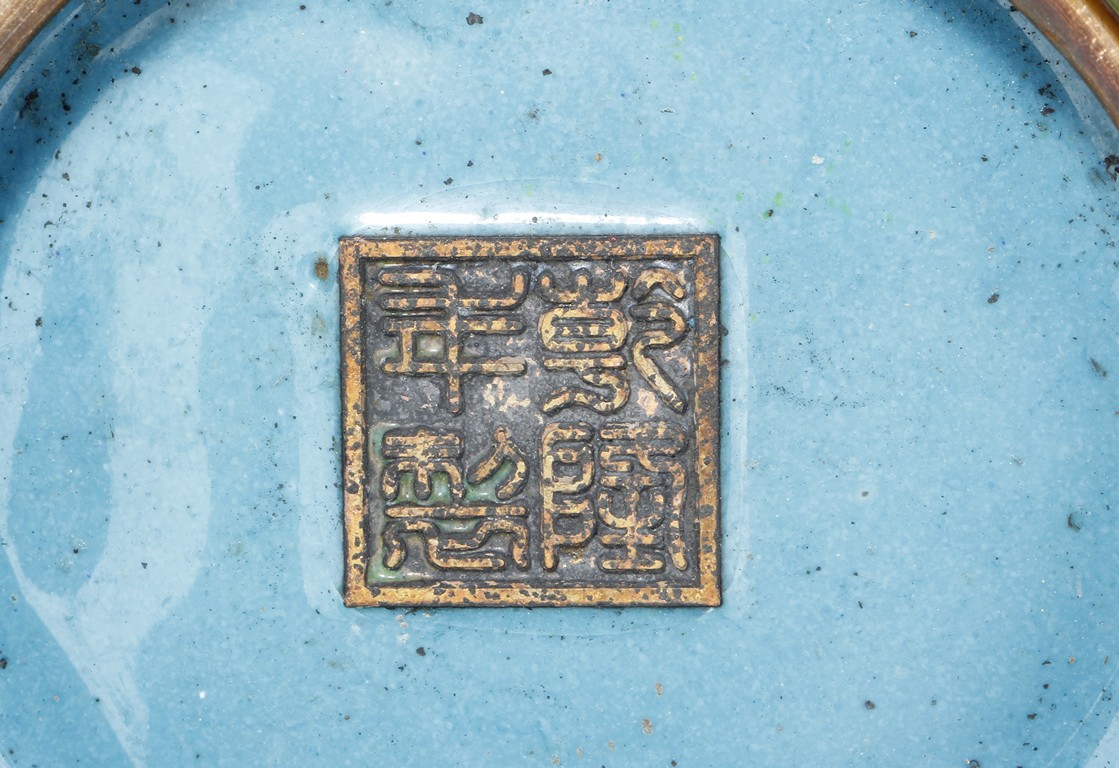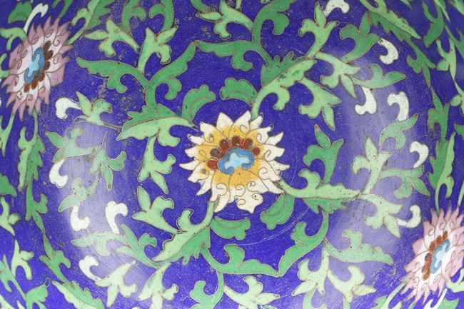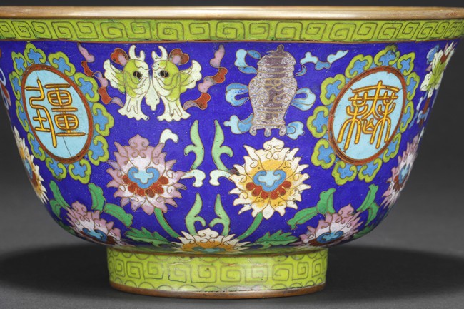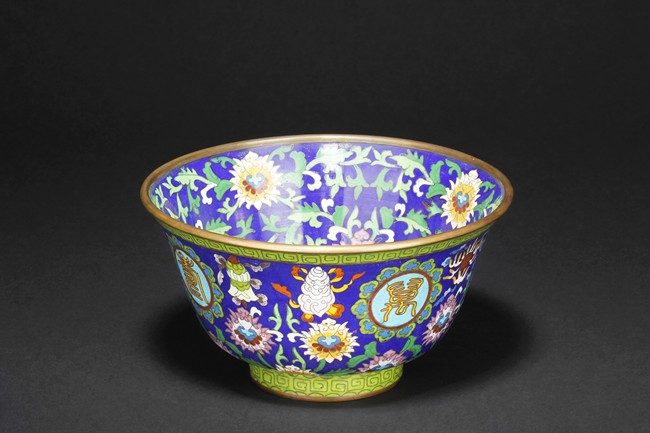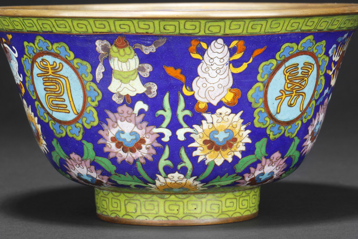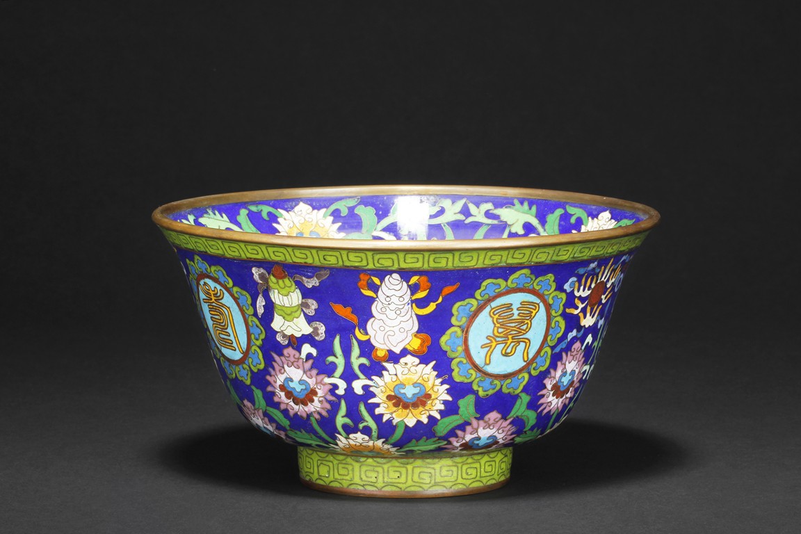 The bowl enameled with blossoming flowers, vines, and leaves, the exterior with four roundels, each enclosing a Chinese character symbolizing longevity, surrounded by ruyi-head patterns, over blue ground, the rim and base with scrolling key-fret patterns. Bottom bears four character'QIANLONG' mark.