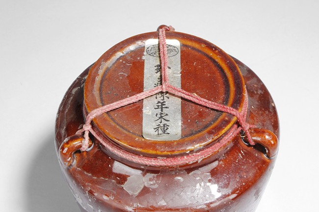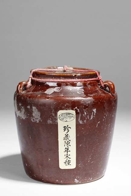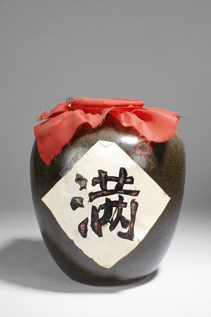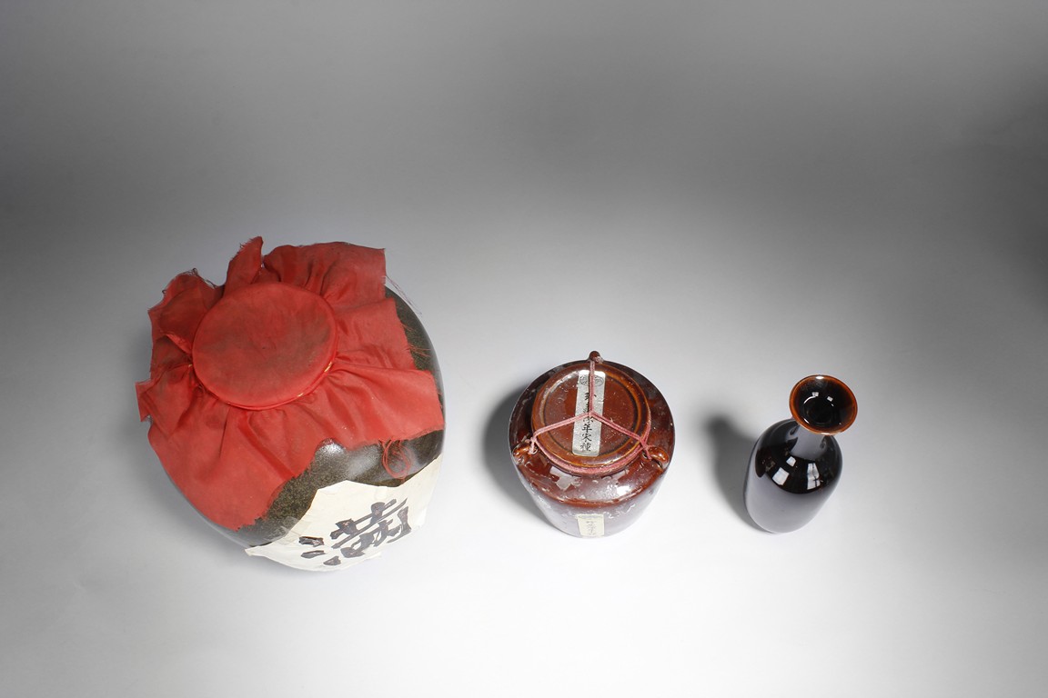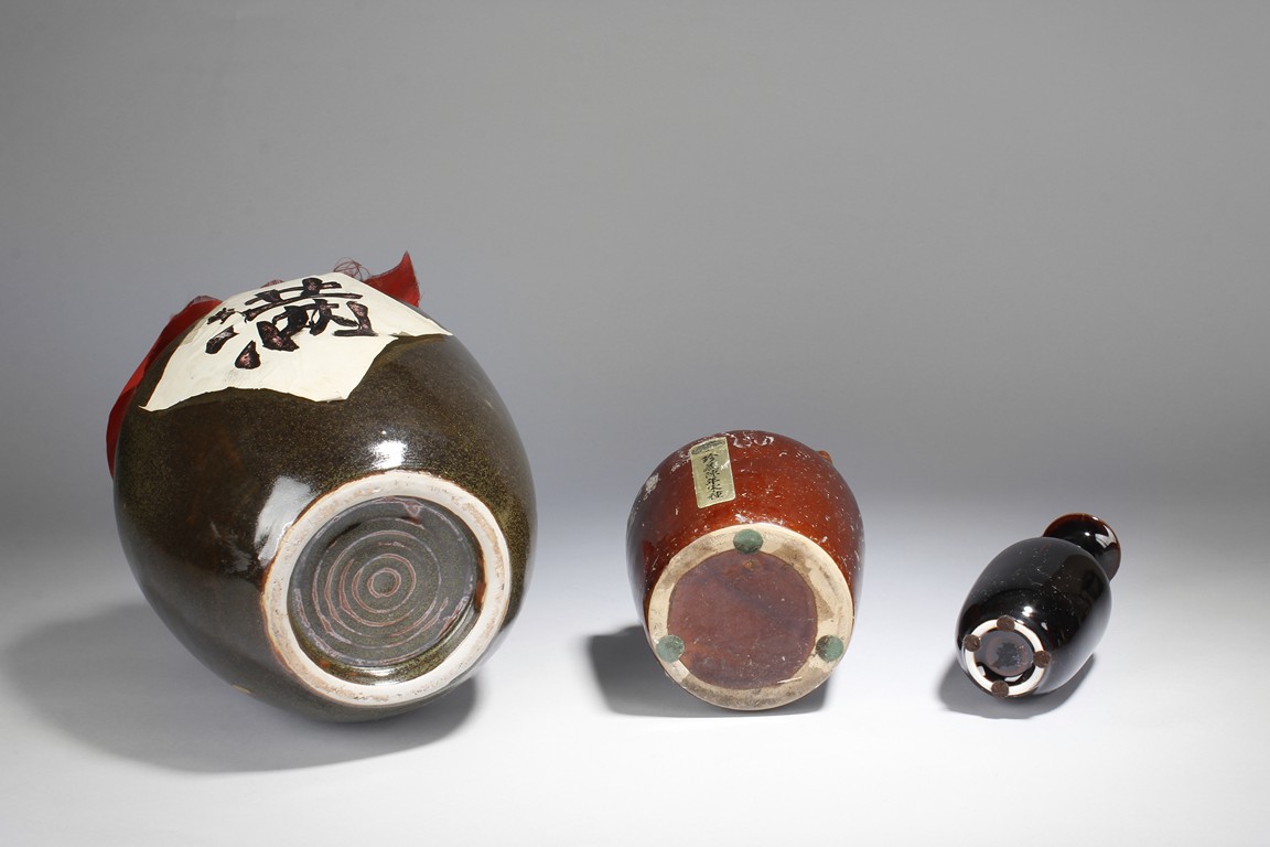 Includes two traditional design wine jars with covers, and a black glazed bottle.