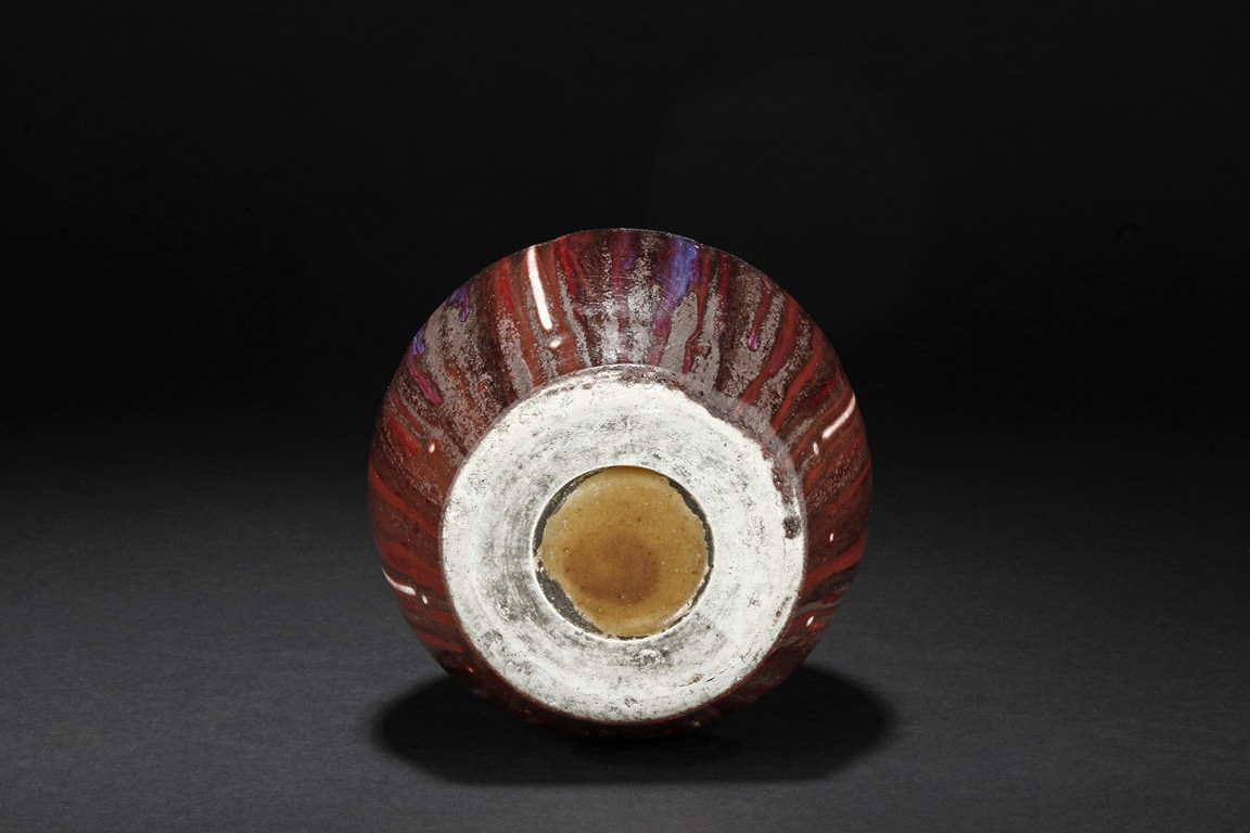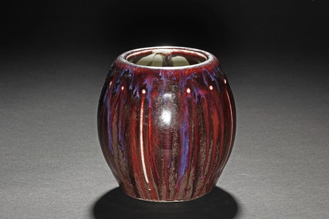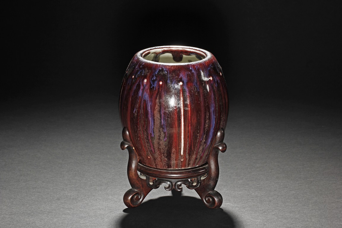 Of barrel form, the jar covered in flambe glaze, the color of shades of red and occasional blue, scrolling grain dots near the rim, and includes wooden stand. Bottom remain unglazed. Qing Dynasty period.