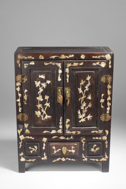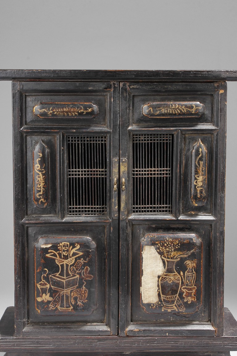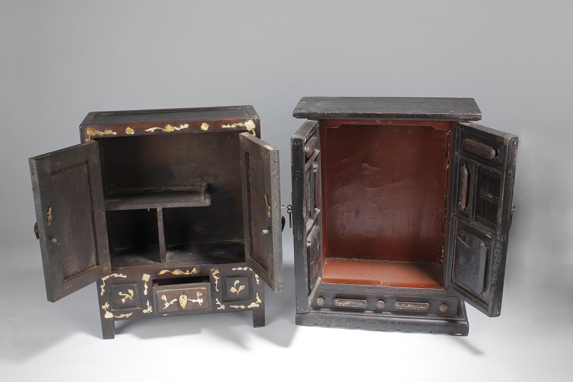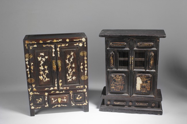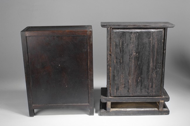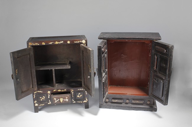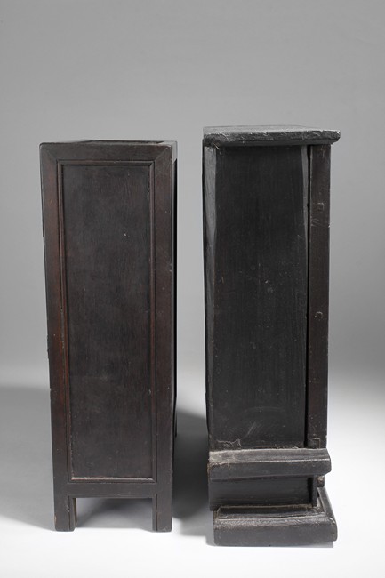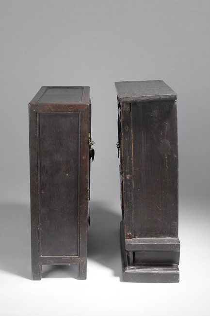 Carved out of wood, one cabinet is finely decorated with shells on the exterior, the other was incised with design of vases.
