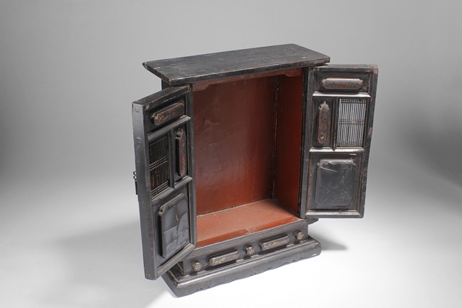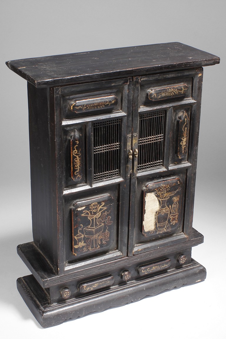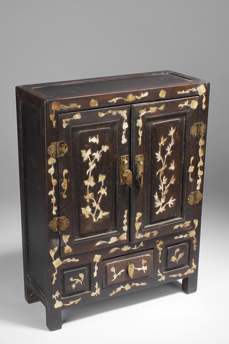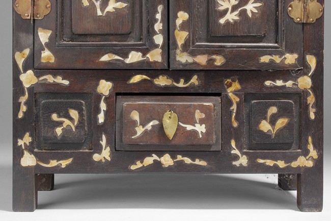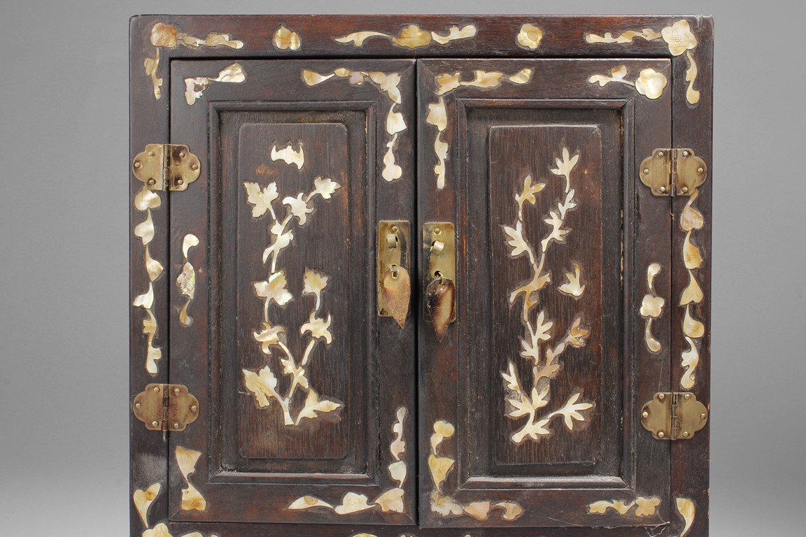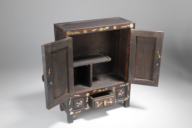 Carved out of wood, one cabinet is finely decorated with shells on the exterior, the other was incised with design of vases.