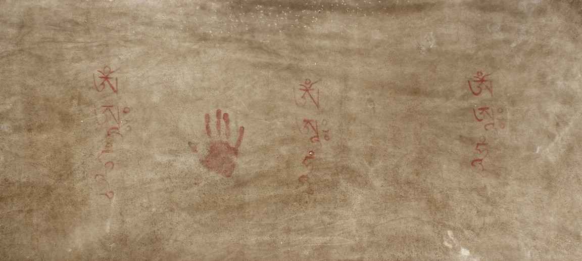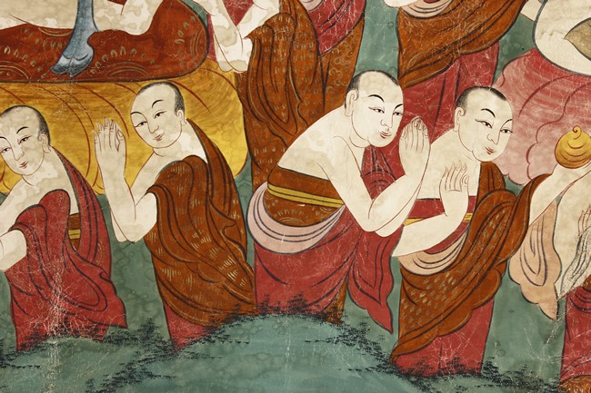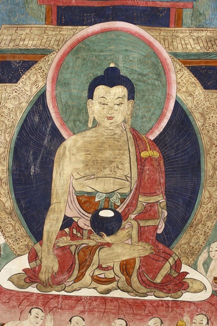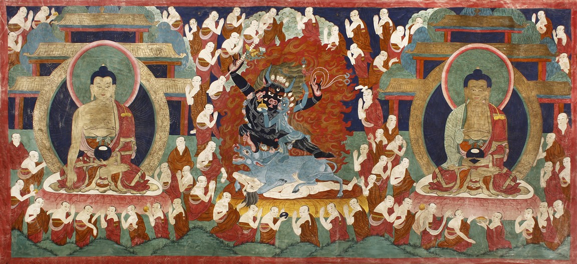 This thangka depicts the wrathful deity proctor, Dharmapala, in the center, holding a kila on his upraised right hand and a snake-like collar on left hand, while a grasped by his blue faced consort, all standing upon a bull crushing down a naked figure. He is flanked by two Bodhisattva dressed in elaborate robes on left and right, and worshipped by numerous monk figures.