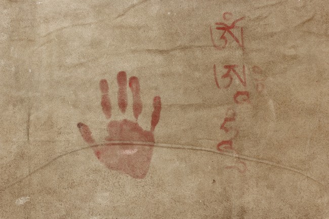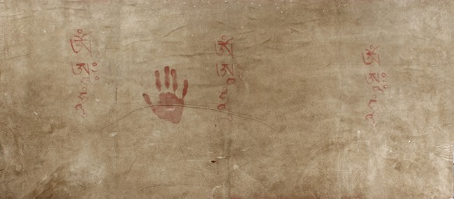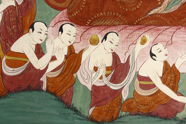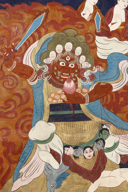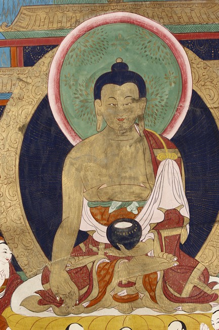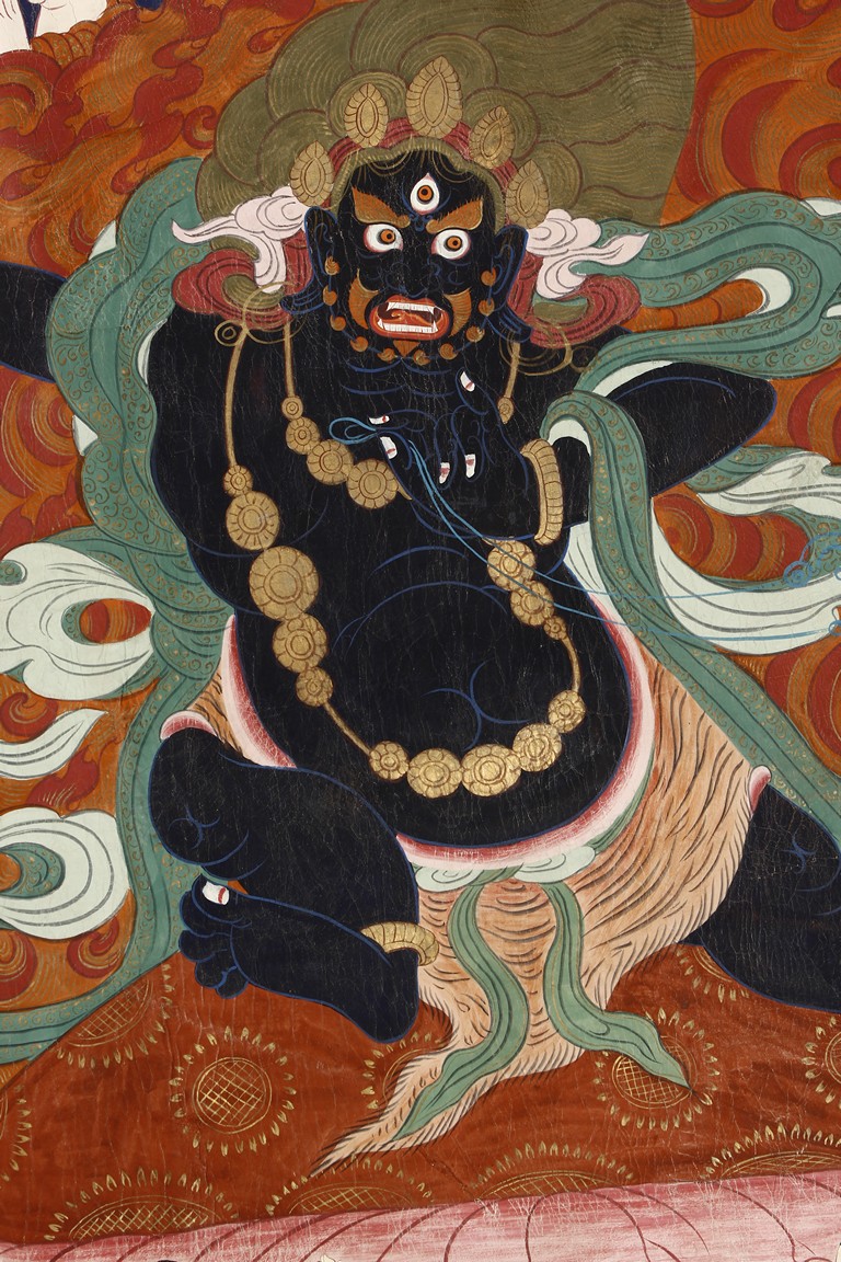 This thangka depicts the Bhaisajyaguru in the center holding the myrobalan-fruit on the left hand, his right hand rests on right leg with palm facing outward, dressed in richly detailed losse robe exposing right chest, and flanked by two wrathful deity proctors on the left and right, along with numerous monk figures worshipping beneath them.