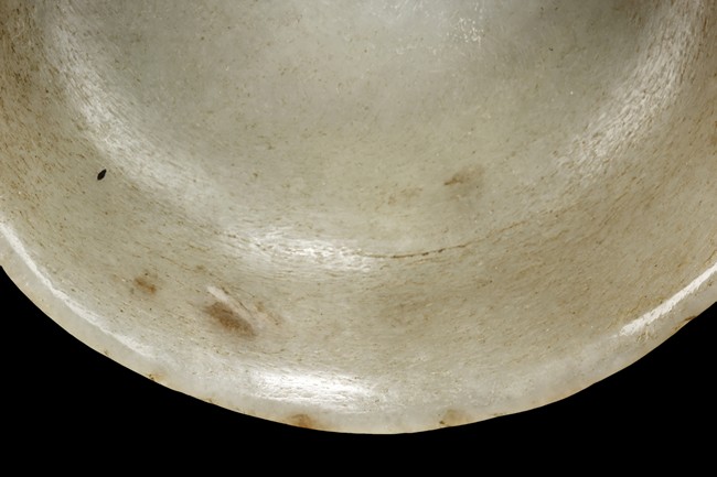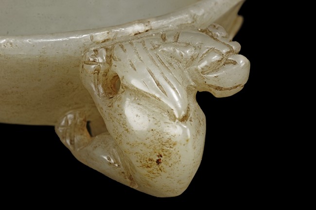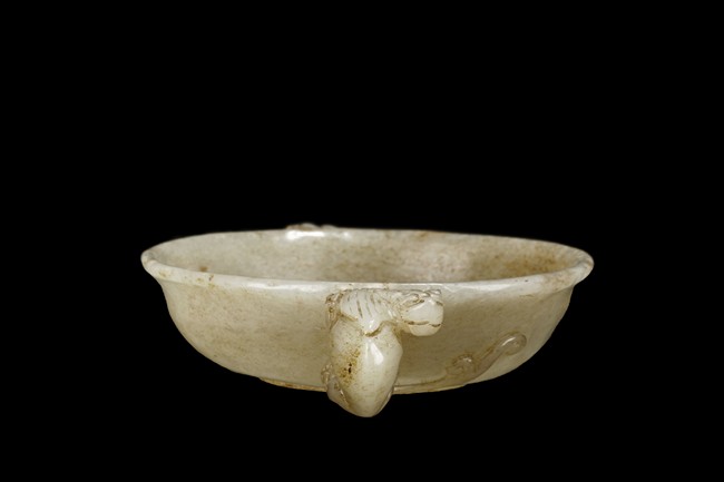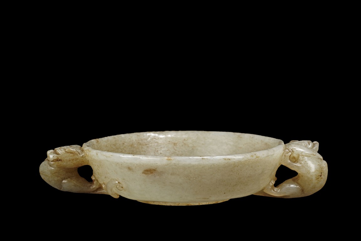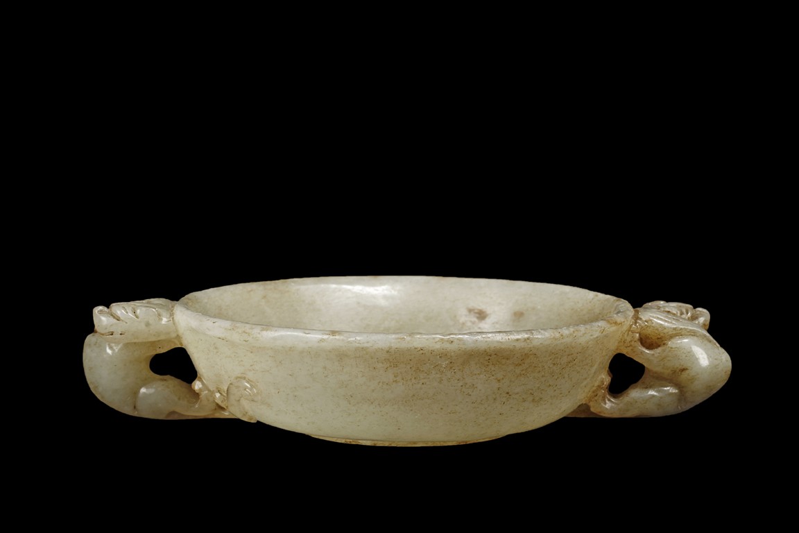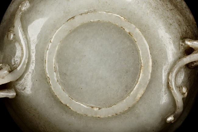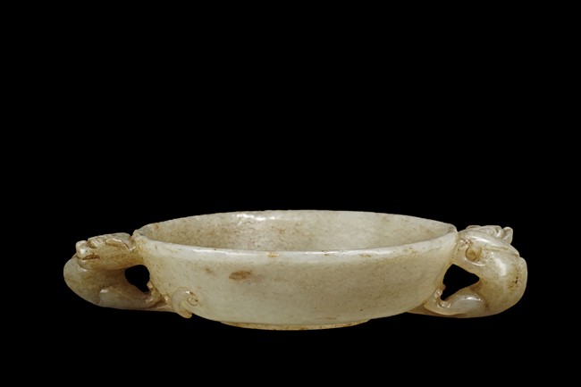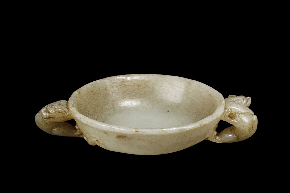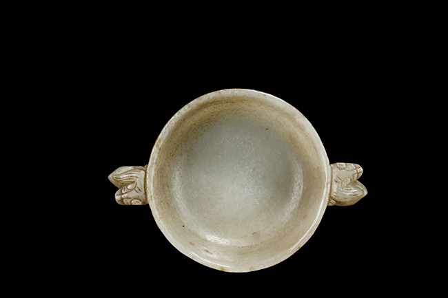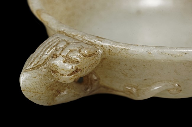 The shallow cup has two mythical beast shaped handles on the sides, the body is of white and russet color, with mottled and translucent interior. Qing Dynasty period.
