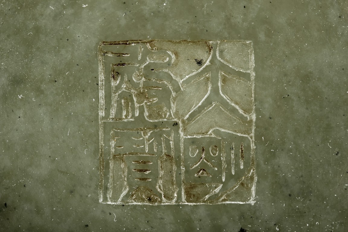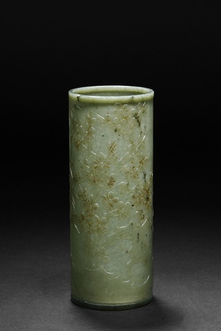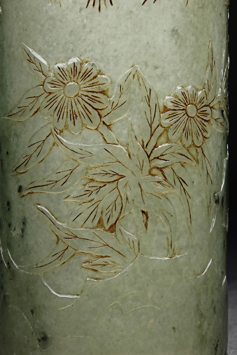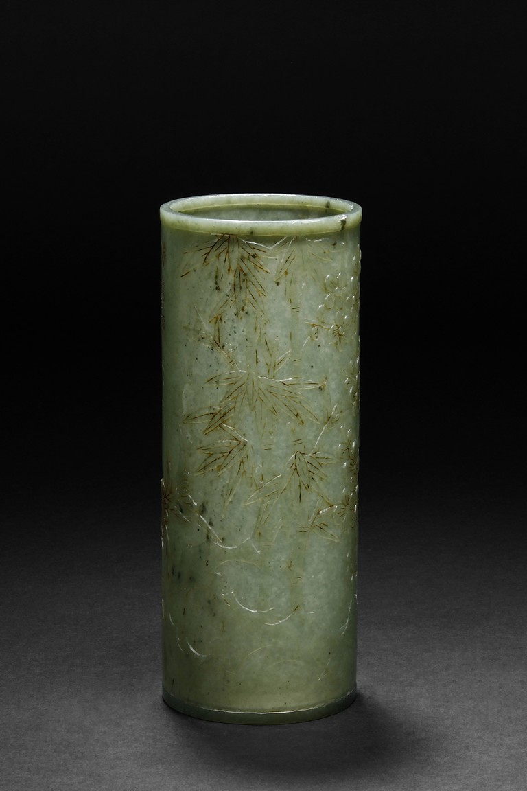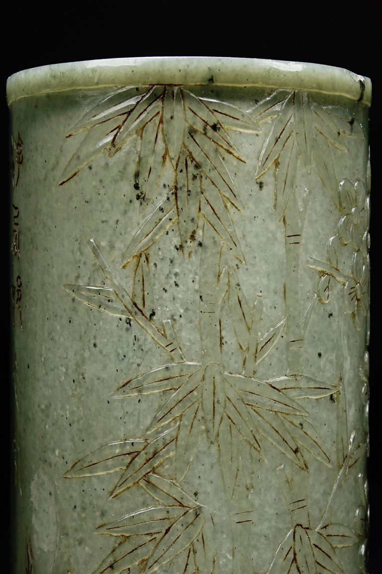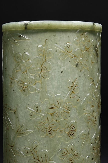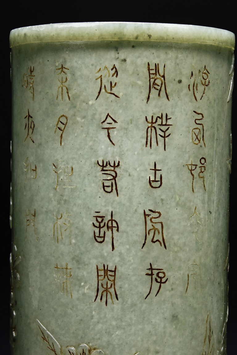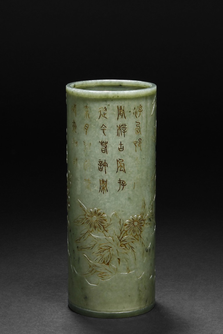 The brush pot is carved in cylindrical form, the exterior finely incised with poems in seal format, above a continuous landscape of plum, chrysanthemum, and bamboo issuing from rock-work. The bottom bears four character mark. The stone is of celadon tone. Republic period.