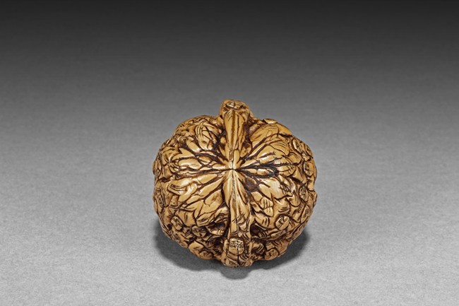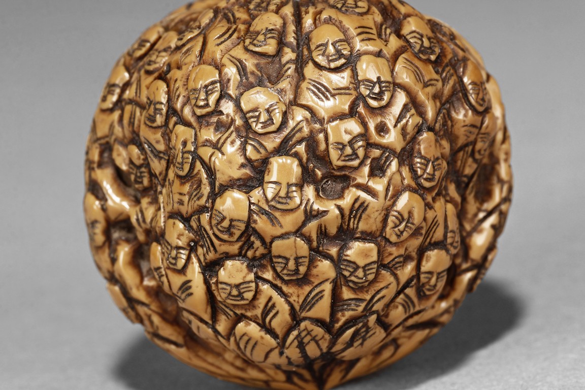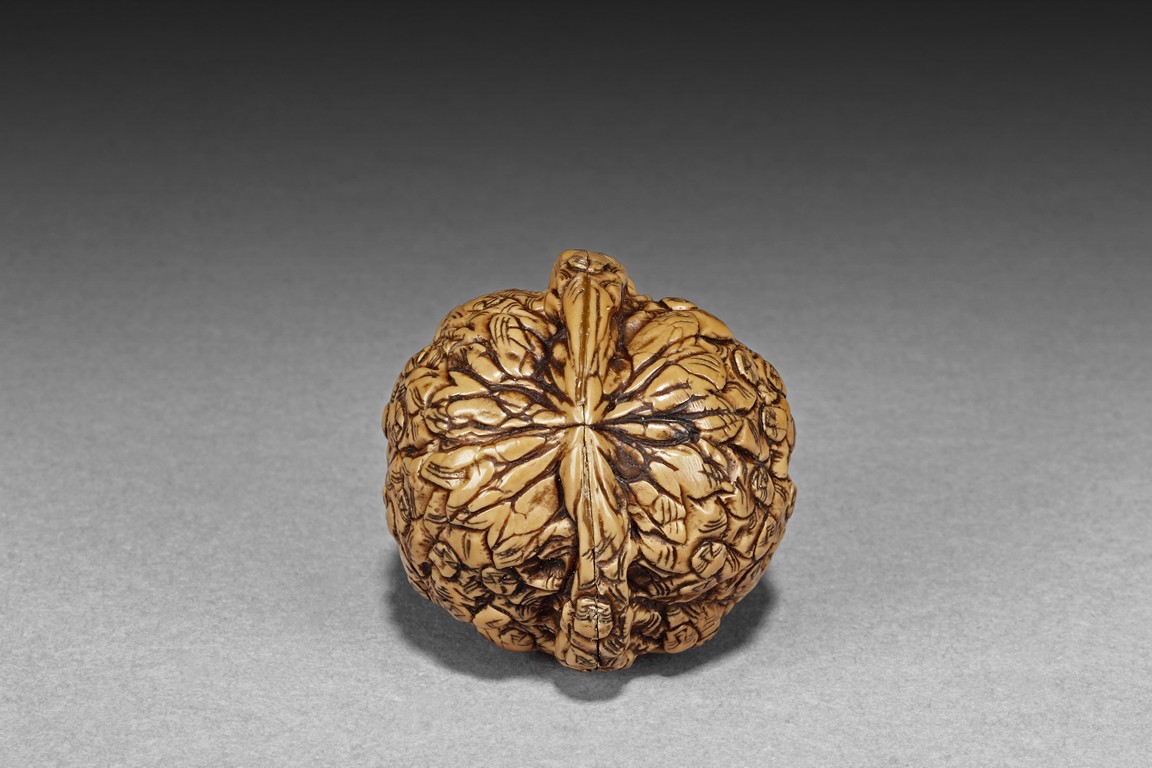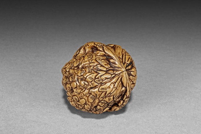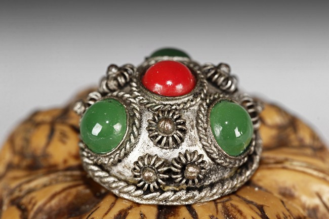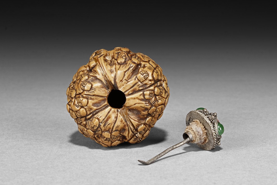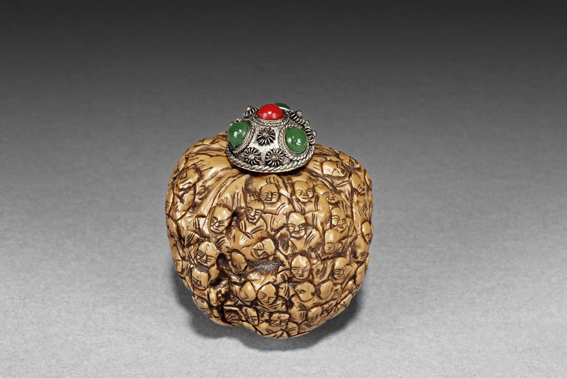 The snuff bottle was made from a single walnut, the body carved with many Arhats (Luohan), the stopper made from silver filigree with colored jewels attached.