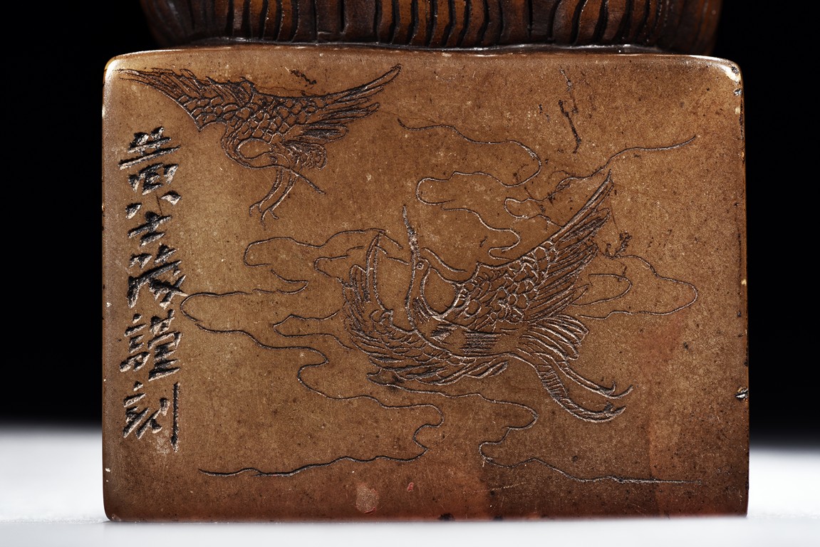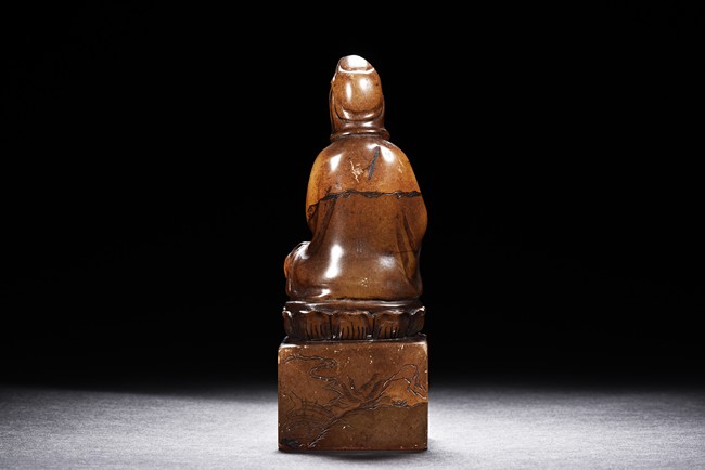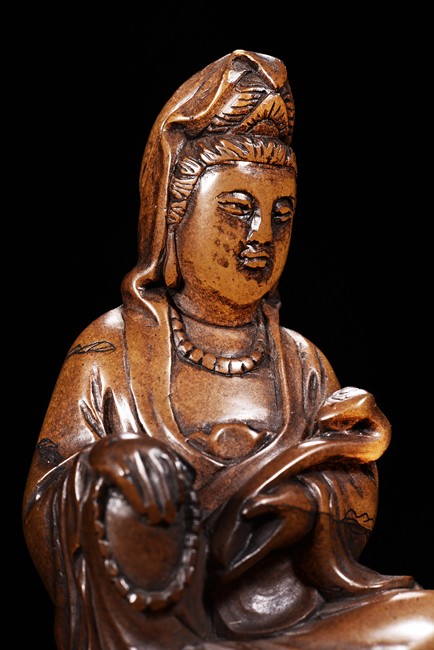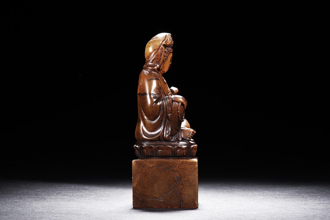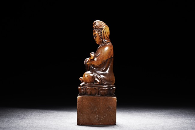 The figure is carved seated on lotus throne, with one hand holding a ruyi and one hand holding a necklace, the bottom seal inscribed with author's colophone and crane motif.