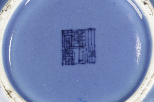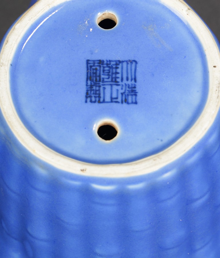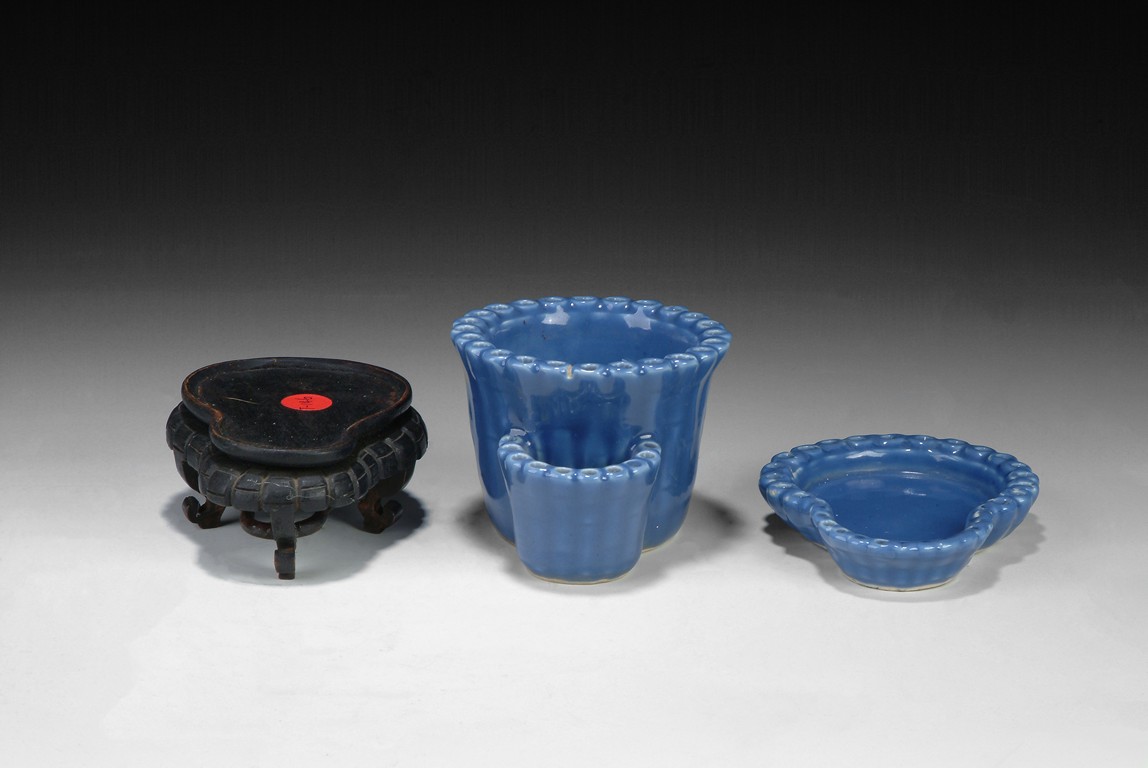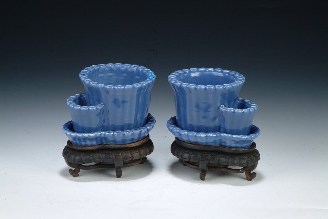 The planter with floriform edges, tapering down slightly with another attached half circular planter, with another layer of similar edge, all set with original stands. Bottom bears'YONGZHENG' mark. Qing Dynasty period.