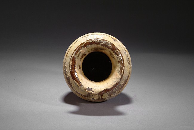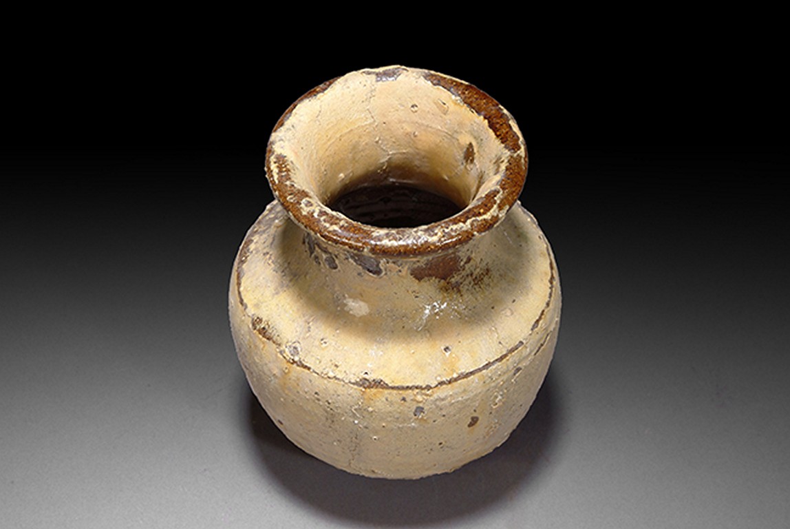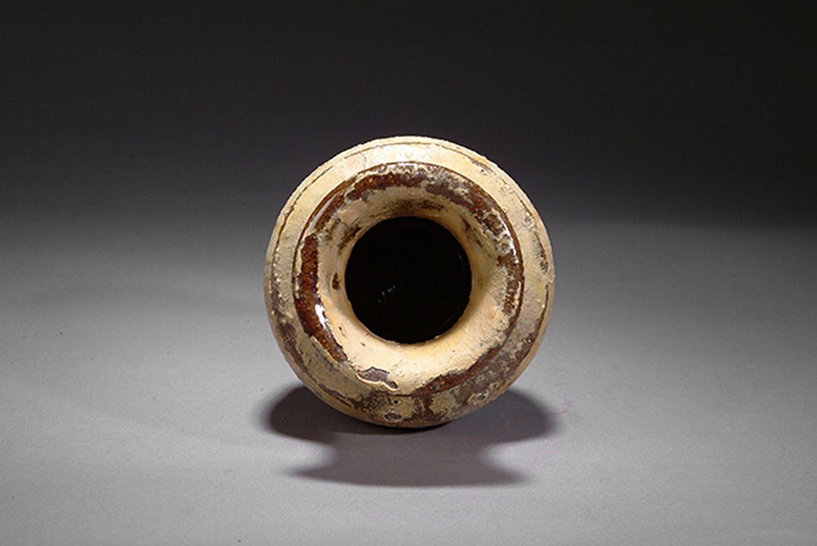 This ancient style vase is glazed brown on the shoulder and yellow on the body.