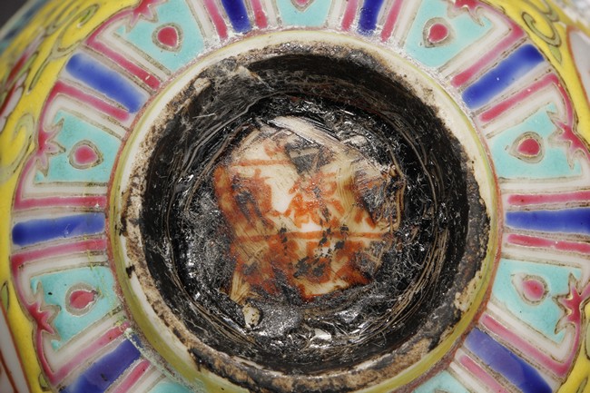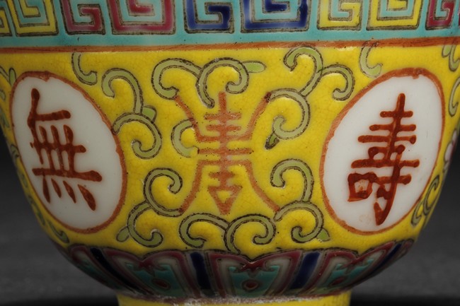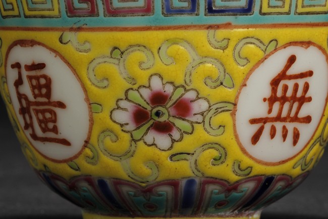 The famille-rose cup feature yellow ground, and four Chinese characters symbolizing longevity.