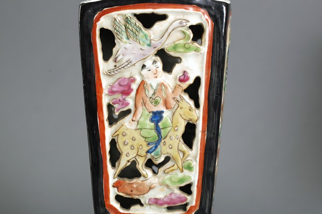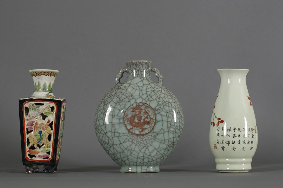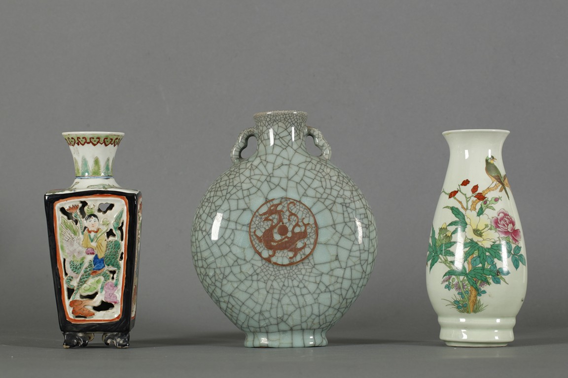 Three porcelain made vases. Each depicting a different theme and shape. The first one, painted with flowers and a pair of birds resting on top, with artist seal on the bottom; the second, covered overall in a thick pale celadon glaze with dark crackle in imitation of Song dynasty; and the third, painted with fairies each riding a different mythical creature, artist seal on the bottom.
