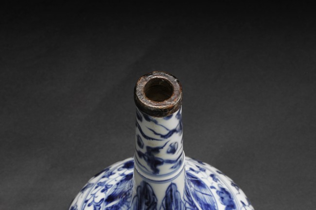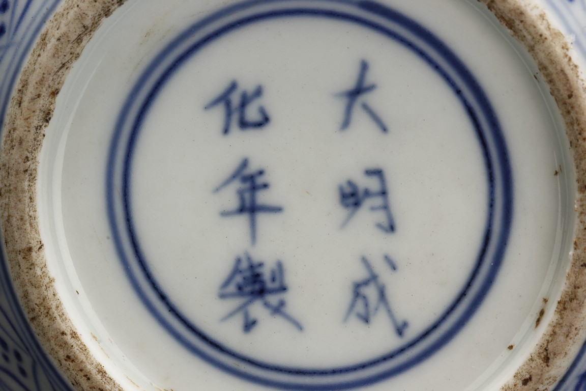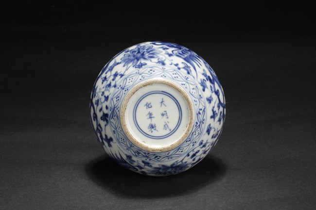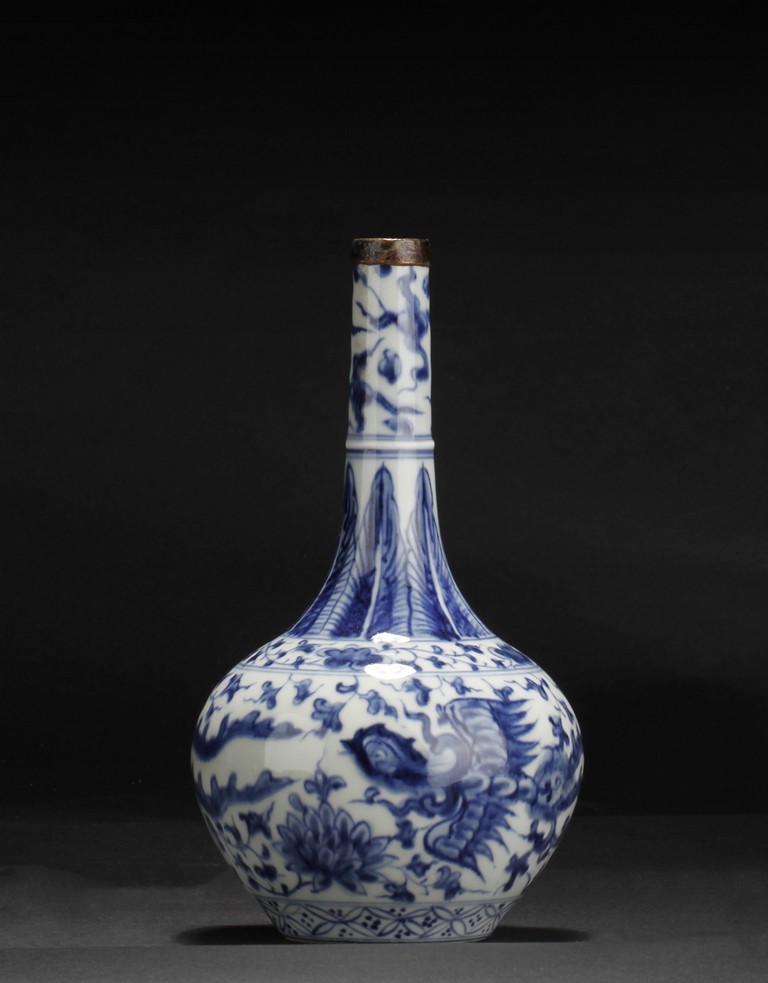 Of globular form, the exterior depicts flying phoenix and dragon amidst flowers and vines, between lappet patterns on shoulder and flower petal patterns at base, the straight long neck leads to a metal rim on top. Bottom bears six characters'CHENGHUA' mark. Ming Dynasty period.