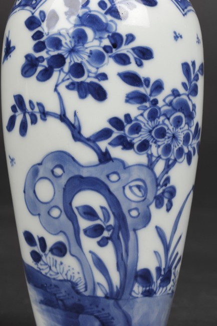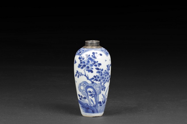 Of tapering cylindrical form, the exterior depicts fully blossomed flowers growing from the garden, bees and birds flying on top, the rim covered by patterned silver cap. Qing Kangxi Dynasty period.