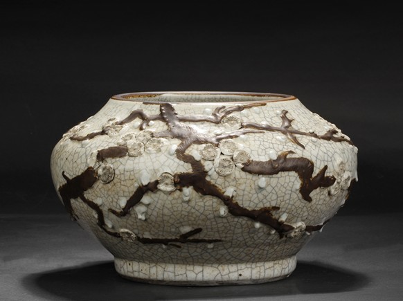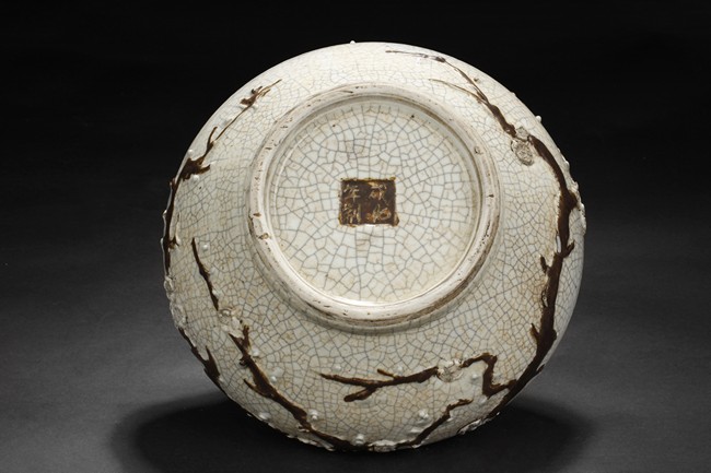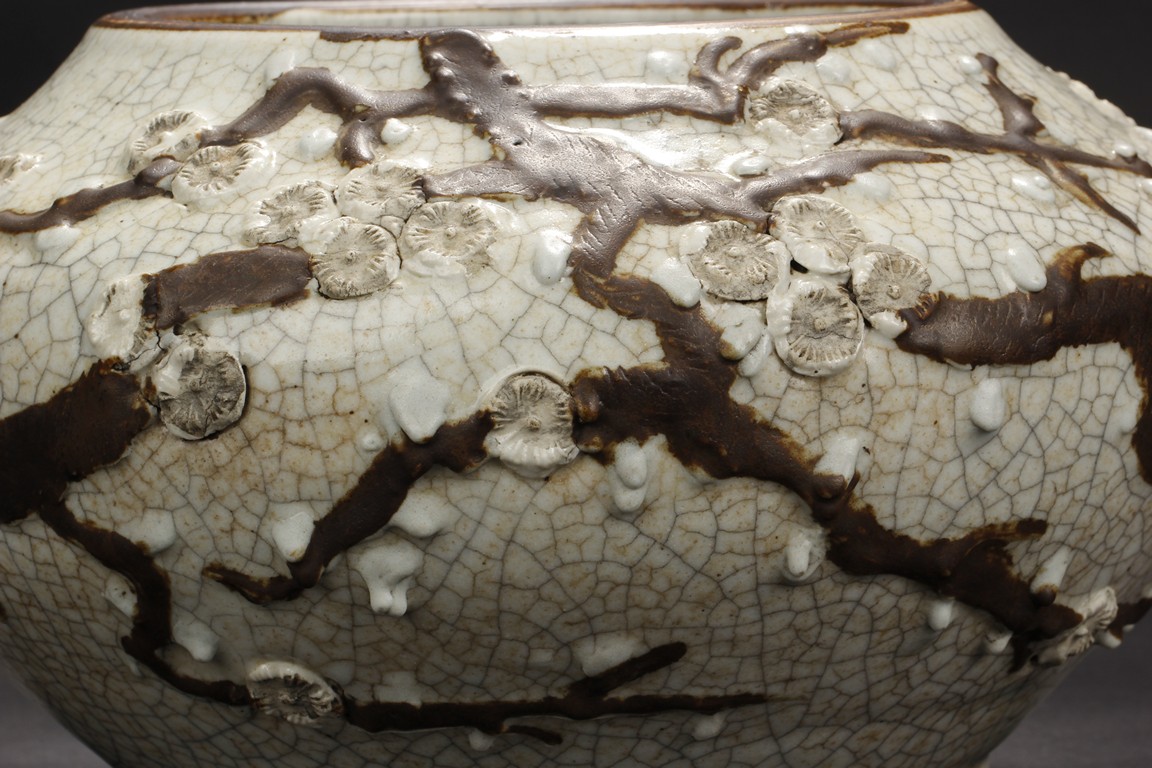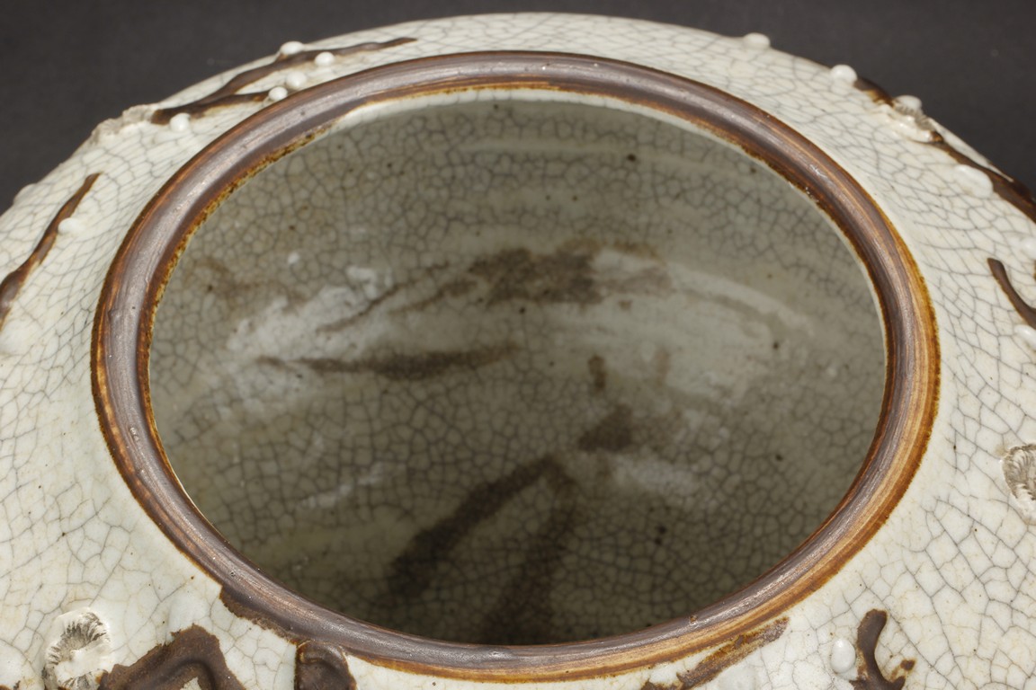 Of globular form, the jar depicts flying dragons amidst clouds, over white glazed crackleware patterns, the bottom bears four character mark'CHENGHUA'. Qing Dynasty period.