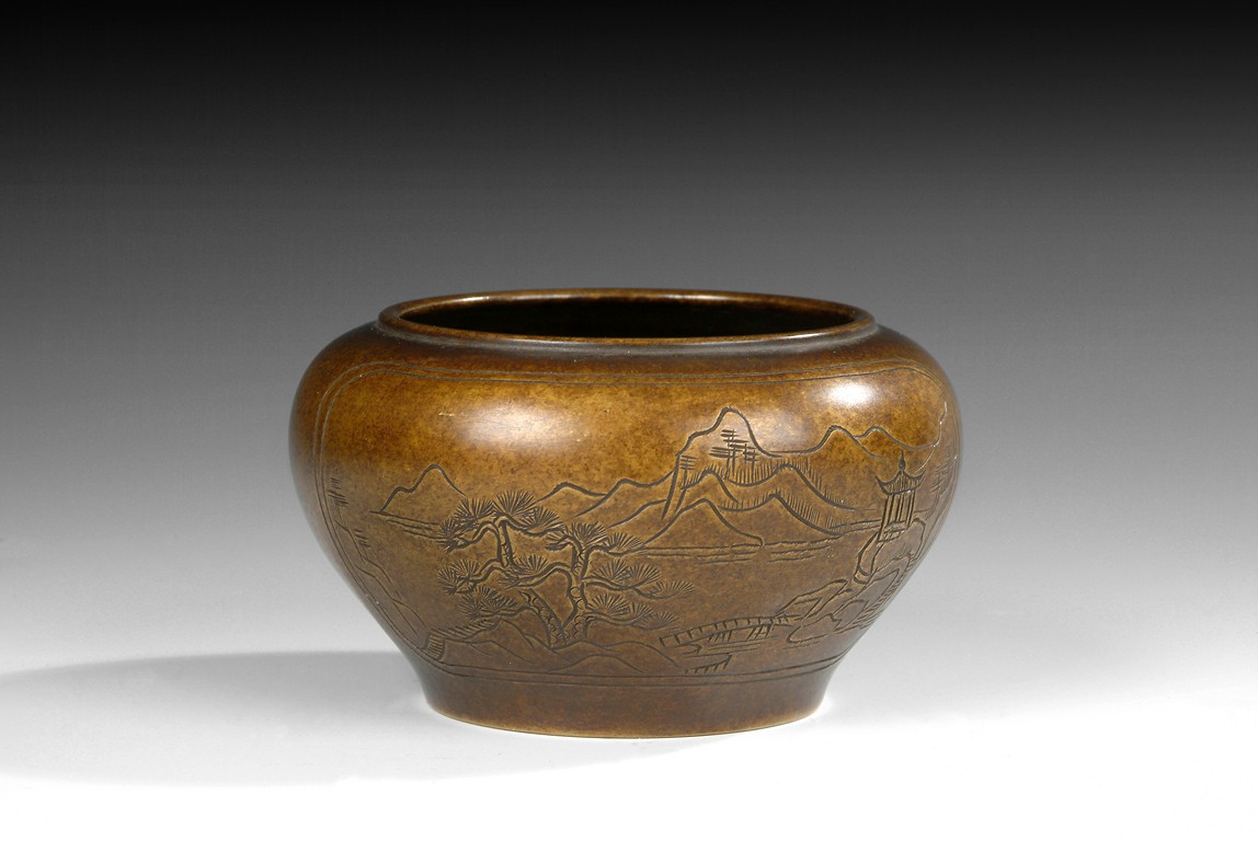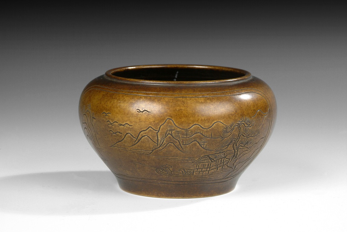 Of globular shape, the body carved with a landscape scene, including mountains, pine trees, bridge, river, pavilion, clouds, birds, and a fisherman on a boat. Bottom bears four characters'YUTANG QINGWAN' mark.