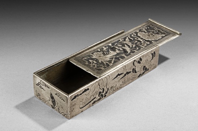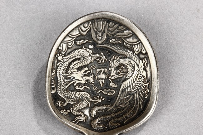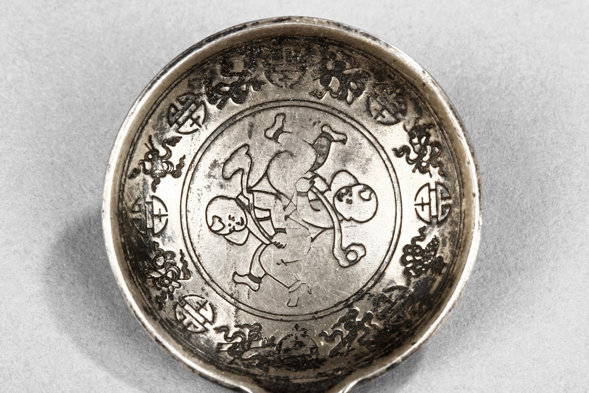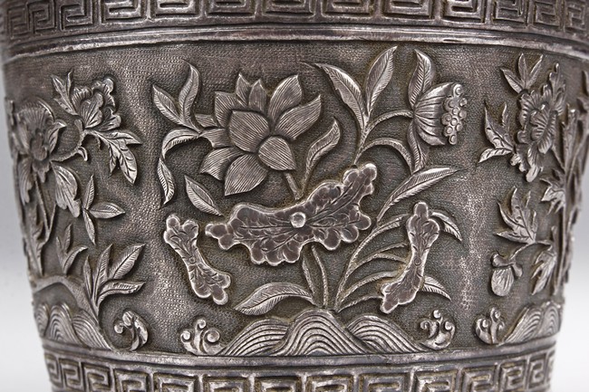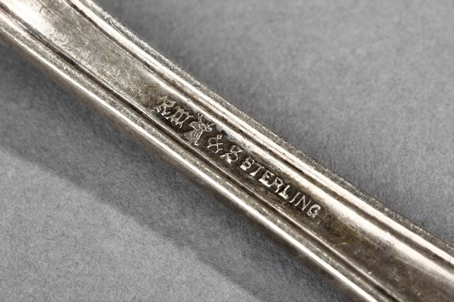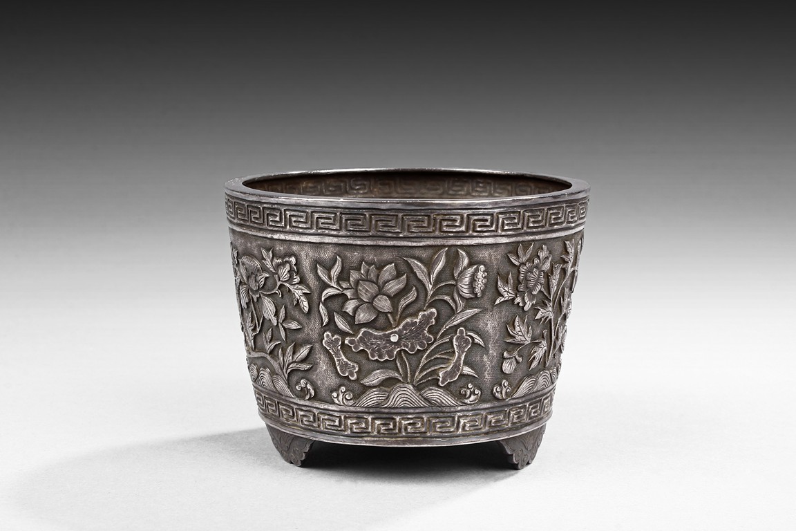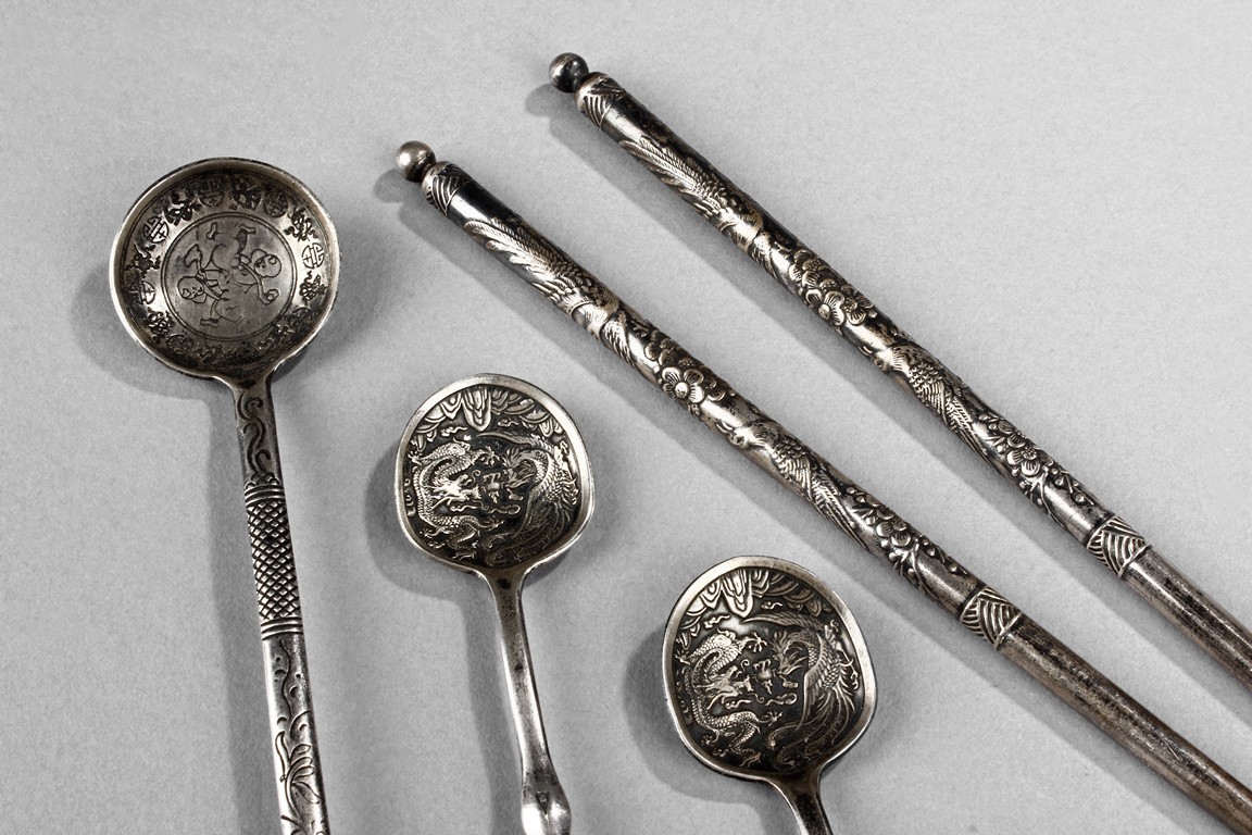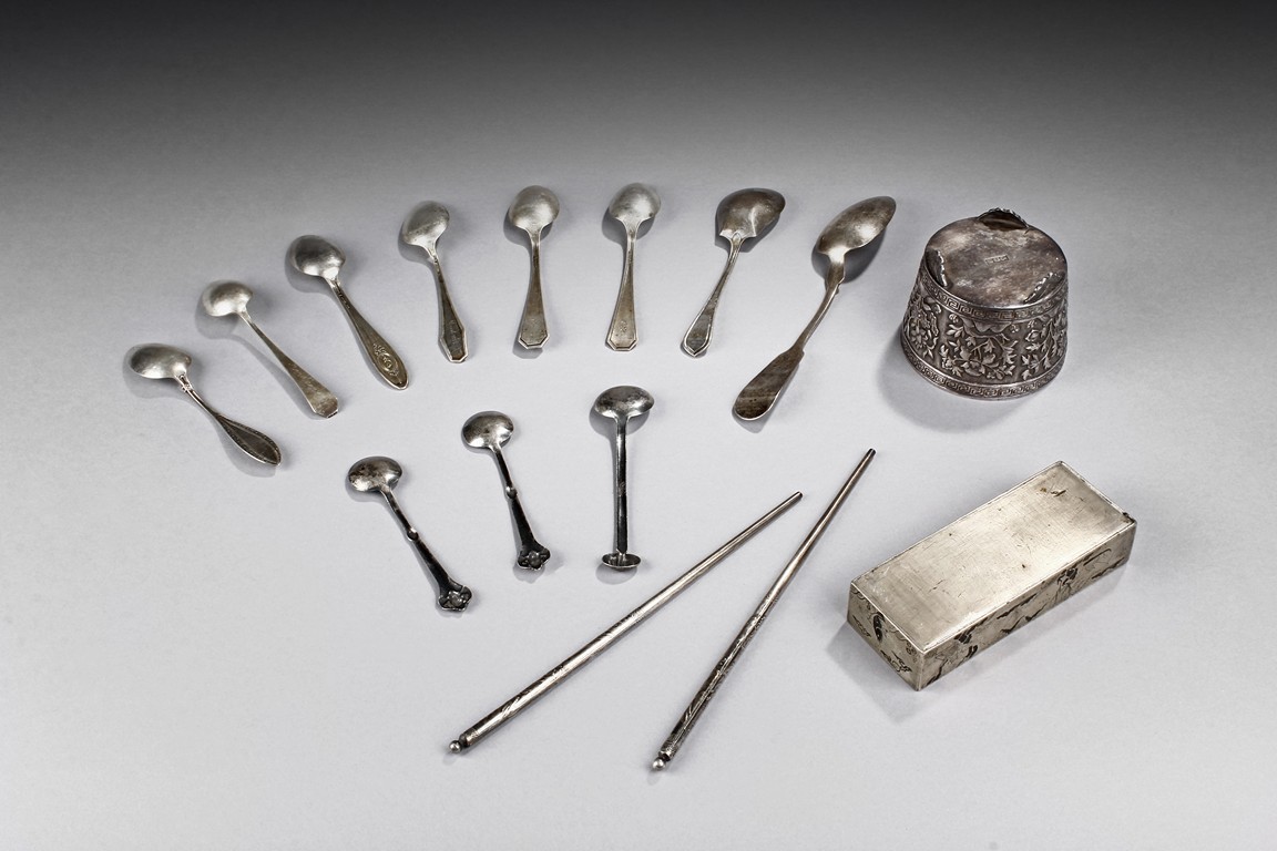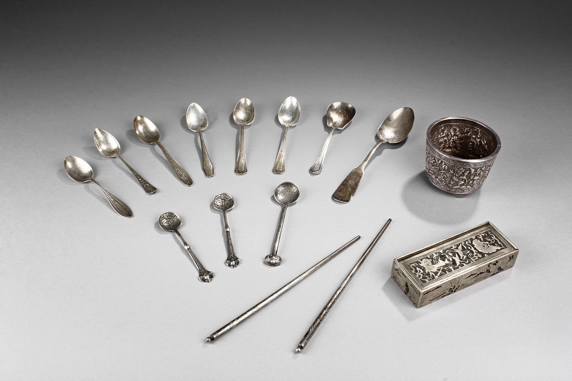 This set consists of 14 silver utensils, including 11 silver spoons of various sizes, origins and decorations, a pair of silver chopsticks with knobs, a rectangular silver box incised with landscape scene on the sides and figures on the cover surface, and a silver jardiniere with floral decoration on the body encircled by key-fret borders and raised by three-feet support.