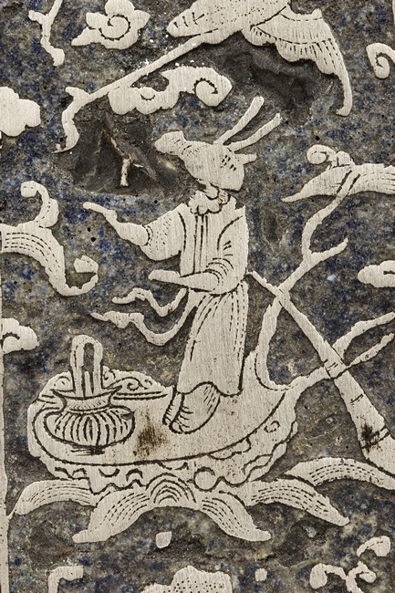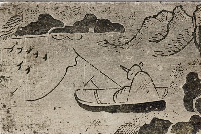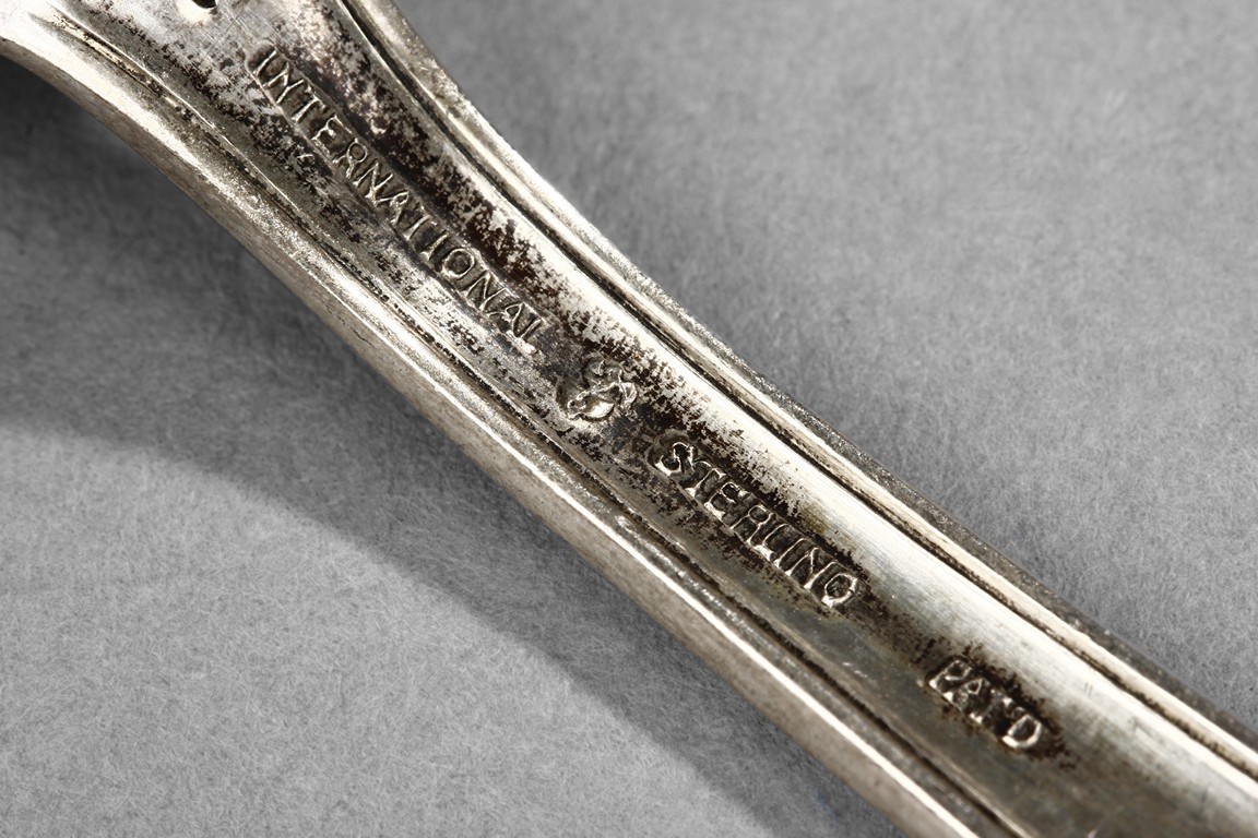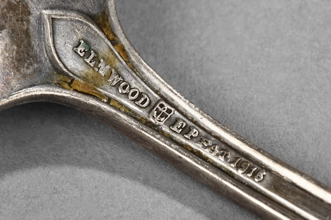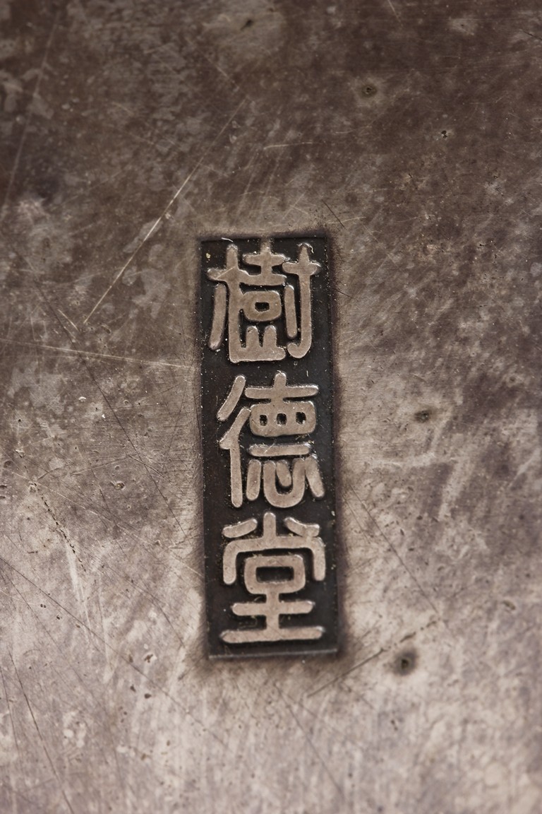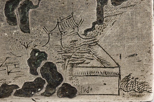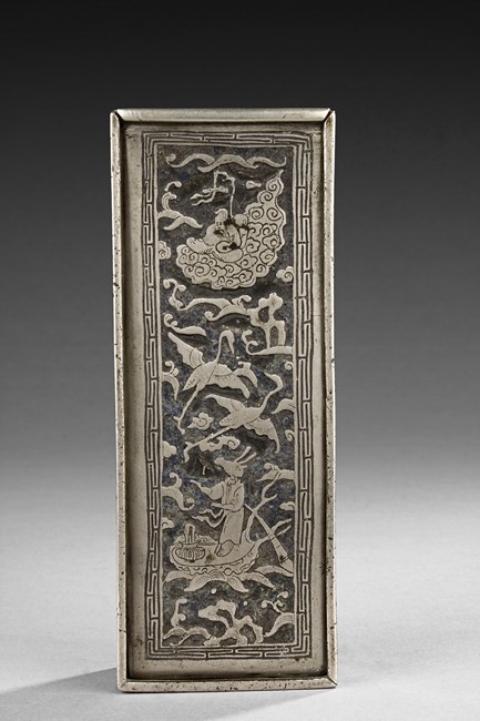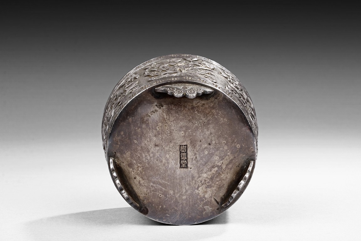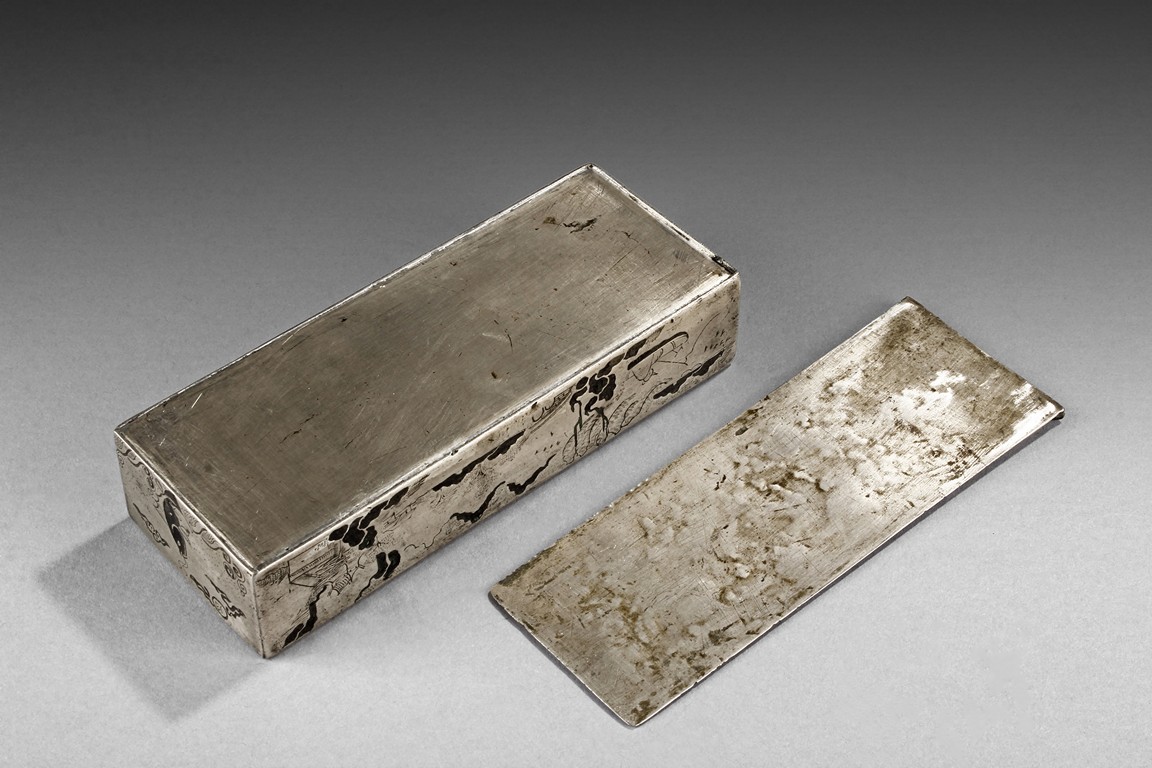 This set consists of 14 silver utensils, including 11 silver spoons of various sizes, origins and decorations, a pair of silver chopsticks with knobs, a rectangular silver box incised with landscape scene on the sides and figures on the cover surface, and a silver jardiniere with floral decoration on the body encircled by key-fret borders and raised by three-feet support.