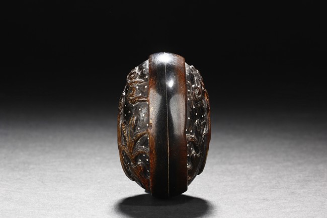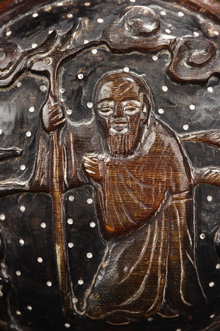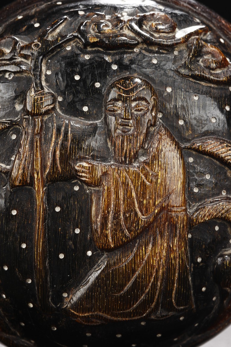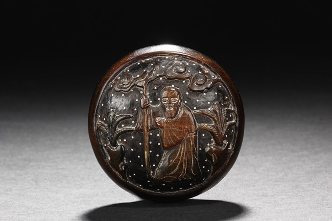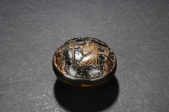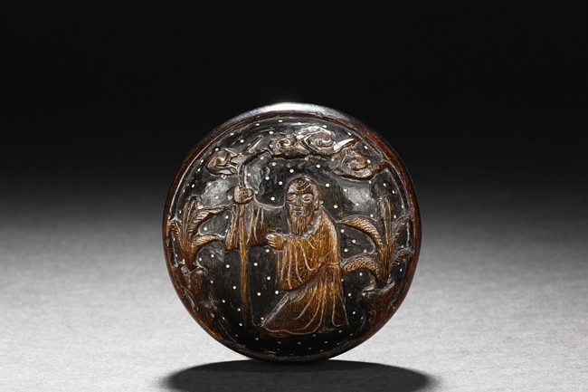The small and round ink box carved from buffalo horn, the top carved with an elder in an outdoor setting, retaining original colors and texture. Qing Dynasty period.